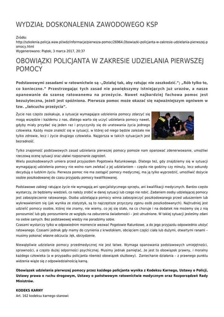 WYDZIAŁ DOSKONALENIA ZAWODOWEGO KSP Źródło: http://szkolenia.policja.waw.pl/wdz/informacje/pierwsza-pomoc/26964,Obowiazki-policjanta-w-zakresie-udzielania-pierwszej-p omocy.html Wygenerowano: Piątek, 3 marca 2017, 20:37 OBOWIĄZKI POLICJANTA W ZAKRESIE UDZIELANIA PIERWSZEJ POMOCY Podstawowymi zasadami w ratownictwie są -„Działaj tak, aby ratując nie zaszkodzić.”; „Rób tylko to, co konieczne.” Przestrzegając tych zasad nie powiększymy istniejących już urazów, a nasze opanowanie da szansę ratowanemu na przeżycie. Nawet najbardziej fachowa pomoc jest bezużyteczna, jeżeli jest spóźniona. Pierwsza pomoc może okazać się najważniejszym ogniwem w tzw. „łańcuchu przeżycia”. Życie nas często zaskakuje, a sytuacje wymagające udzielenia pomocy zdarzyć się mogą wszędzie i każdemu z nas, dlatego warto się uczyć udzielania pomocy nawet, gdyby miały przydać się jeden raz i przyczyniły się do uratowania życia jednego człowieka. Każdy może znaleźć się w sytuacji, w której od niego będzie zależało nie tylko zdrowie, lecz i życie drugiego człowieka. Najgorsza w takich sytuacjach jest bezradność. Tylko znajomość podstawowych zasad udzielania pierwszej pomocy pomoże nam opanować zdenerwowanie, umożliwi rzeczową ocenę sytuacji oraz ułatwi rozpoznanie zagrożeń. Wielu poszkodowanych umiera przed przyjazdem Pogotowia Ratunkowego. Dlatego też, gdy znajdziemy się w sytuacji wymagającej udzielenia pomocy nie wolno nam zwlekać z jej udzielaniem – często nie godziny czy minuty, lecz sekundy decydują o ludzkim życiu. Pierwsza pomoc nie ma zastąpić pomocy medycznej, ma ją tylko wyprzedzić, umożliwić dożycie osobie poszkodowanej do czasu przyjazdu pomocy kwalifikowanej. Podstawowe zabiegi ratujące życie nie wymagają ani specjalistycznego sprzętu, ani kwalifikacji medycznych. Bardzo często wystarczy, że będziemy wiedzieli, co należy zrobić w danej sytuacji lub czego nie robić. Zadaniem osoby udzielającej pomocy jest zabezpieczenie ratowanego. Osoba udzielająca pomocy winna zabezpieczyć poszkodowanego przed uduszeniem lub wykrwawieniem się (jak wynika ze statystyk, są to najczęstsze przyczyny zgonu osób poszkodowanych). Najtrudniej jest udzielić pomocy osobie, której nie znamy, nie wiemy, co jej się stało, na co choruje i na dodatek nie możemy się z nią porozumieć lub gdy porozumienie ze względu na zaburzenia świadomości – jest utrudnione. W takiej sytuacji jesteśmy zdani na siebie samych. Bez podstawowej wiedzy nie poradzimy sobie. Czasami wystarczy tylko w odpowiednim momencie wezwać Pogotowie Ratunkowe, a do jego przyjazdu odpowiednio ułożyć ratowanego. Czasami jednak gdy mamy do czynienia z krwotokiem, obcięciem części ciała lub dużymi, otwartymi ranami – musimy pokonać własne odczucia :lęk, obrzydzenie. Niewątpliwie udzielanie pomocy przedmedycznej nie jest łatwe. Wymaga opanowania podstawowych umiejętności, sprawności, a często dużej odporności psychicznej. Musimy jednak pamiętać, że jest to obowiązek prawny, i moralny każdego człowieka (a w przypadku policjanta również obowiązek służbowy). Zaniechanie działania – z prawnego punktu widzenia wiąże się z odpowiedzialnością karną. Obowiązek udzielania pierwszej pomocy przez każdego policjanta wynika z Kodeksu Karnego, Ustawy o Policji, Ustawy prawa o ruchu drogowym, Ustawy o państwowym ratownictwie medycznym oraz Rozporządzeń Rady Ministrów. KODEKS KARNY Art. 162 kodeksu karnego stanowi: §1.Kto człowiekowi znajdującemu się w położeniu grożącym bezpośrednim niebezpieczeństwem utraty życia, ciężkiego uszczerbku ciała lub ciężkiego rozstroju zdrowia nie udziela pomocy, mogąc jej udzielić bez narażenia siebie lub innej osoby na niebezpieczeństwo utraty życia lub poważnego uszczerbku na zdrowiu, podlega karze pozbawienia wolnoścido lat 3. (…)Zwolnienia z obowiązku będzie maiło miejsce wtedy, gdy pogotowie jest już na miejscu lub na miejscu jest lekarz mogący udzielić pomocy. Do czasu przybycia pogotowia ratunkowego obowiązek udzielenia pomocy w granicach wyznaczonych sytuacją ciąży na każdym, który pomocy takiej ze względy na miejsce przebywania jest w stanie udzielić. (KK Część szczególna pod red. A. Zolla, t. 2, Kraków 1999, ss. 318 – 323.) § 2. Nie popełnia przestępstwa, kto nie udziela pomocy, do której jest konieczne poddanie się zabiegowi lekarskiemu albo w warunkach, w których możliwa jest niezwłoczna pomoc ze strony instytucji lub osoby do tego powołanej. Komentarz do art. 162 § 2 kk ( ... ) Charakter koniecznej do wykonania pomocy wyznacza konkretna sytuacja. Standard tej pomocy jest wyznaczony konkretnym położeniem, w jakim znalazł się człowiek wymagający pomocy, stanem wiedzy osoby zobowiązanej oraz środkami, jakimi dysponuje zobowiązany do udzielenia pomocy. (KK Część szczególna pod red. A. Zolla, t. 2, Kraków 1999, ss. 318 – 323.) Z wyżej przytoczonego przepisu wynika, że każda osoba, która znalazła się na miejscu zdarzenia jest zobowiązana do udzielenia pierwszej pomocy w oparciu o swoja wiedzę, w zakresie dostępnych możliwości oraz przy użyciu środków, jakimi dysponuje. USTAWA O POLICJI Art. 1 Ust.2 Do podstawowych zadań Policji należą: 1. Ochrona życia i zdrowia ludzi oraz mienia przed bezprawnymi zamachami naruszającymi te dobra. USTAWA PRAWO O RUCHU DROGOWYM. Art. 44 ust. 1 Kierujący pojazdem w razie uczestniczenia w wypadku drogowym jest obowiązany: a) zatrzymać pojazd nie powodując przy tym zagrożenia bezpieczeństwa ruchu drogowego, b) przedsięwziąć odpowiednie środki w celu zapewnienia bezpieczeństwa ruchu w miejscu wypadku, c) niezwłocznie usunąć pojazd z miejsca wypadku, a by nie powodował zagrożenia lub tamowania ruchu, jeżeli nie ma zabitego lub rannego d) podać swoje dane personalne i dane personalne właściciela lub posiadacz pojazdu oraz dane dotyczące zakładu ubezp