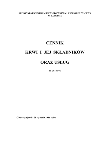 REGIONALNE CENTRUM KRWIODAWSTWA I KRWIOLECZNICTWA W LUBLINIE CENNIK KRWI I JEJ SKŁADNIKÓW ORAZ USŁUG na 2016 rok Obowiązuje od: 01 stycznia 2016 roku SPIS TREŚCI I. Badania laboratoryjne II. Krew i jej składniki III. Zabiegi lecznicze I. BADANIA LABORATORYJNE Lp Wyszczególnienie CENA PLN Badania serologiczne 1 2 3 Pobranie próbki krwi Morfologia pełna Oznaczenie grupy krwi – układ ABO i Rh(D) metoda tradycyjna (szkiełkowa, probówkowa) 9,50 30,00 70,50 4 Oznaczenie grupy krwi – układ ABO i Rh(D) metoda mikrokolumnowa 97,50 5 Oznaczenie słabych odmian grup krwi układu AB0 metoda adsorpcji – elucji 6 Oznaczenie antygenu A1 21,00 7 Oznaczenie antygenu H 31,00 8 Określenie miana przeciwciał odpornościowych anty-A i anty-B z układu AB0 83,00 9 Oznaczenie słabo wyraŜonego antygenu D z układu Rh 57,50 10 Diagnostyka odmian i kategorii antygenu D z układu Rh 187,00 11 Przeglądowe badanie w kierunku obecności alloprzeciwciał metoda probówkowa 140,00 12 Przeglądowe badanie w kierunku obecności alloprzeciwciał metoda mikrokolumnowa 88,50 13 Diagnostyka alloprzeciwciał metoda probówkowa 155,50 14 Diagnostyka alloprzeciwciał metoda mikrokolumnowa 240,00 15 Określenie miana przeciwciał odpornościowych 72,50 16 Określenie fenotypu Rh metoda probówkowa 52,00 17 Określenie antygenu Cw 36,50 18 Określenie antygenu K z układu Kell metoda probówkowa 59,50 19 Określenie antygenu k (cellano) z układu Kell 68,50 20 Określenie fenotypu Rh i Kell metoda mikrokolumnowa 57,50 21 Określenie antygenów Kpa i Kpb 22 Określenie antygenów MN 23 Określenie antygenów Ss 207,50 145,50 62,50 130,00 24 Określenie antygenu P1 41,50 25 Określenie antygenów Lea i Leb 124,50 26 Określenie antygenów Jka i Jkb 104,00 27 Określenie antygenów Fya i Fyb 155,50 28 Określenie antygenów Lua i Lub 213,00 29 Określenie antygenu I 135,00 30 Oznaczenie grupy krwi układu ABO, Rh(D) i BTA u noworodka metoda probówkowa 62,50 31 Oznaczenie grupy krwi układu ABO, Rh(D) i BTA u noworodka metoda mikrokolumnowa 57,50 32 Wykonanie bezpośredniego testu antyglobulinowego (BTA) metoda probówkowa 41,50 33 Wykonanie bezpośredniego testu antyglobulinowego (BTA) metoda mikrokolumnowa 62,50 34 Diagnostyka niedokrwistości autoimmunohemolitycznej typu ciepłego 414,50 35 Diagnostyka niedokrwistości autoimmunohemolitycznej typu zimnego i określenie miana zimnych aglutynin 528,50 36 Wykonanie próby zgodności (badanie alloprzeciwciał u biorcy krwi, oznaczenie antygenów ABD u biorcy i dawcy, dobranie 1 j. KKCz) metoda probówkowa 99,00 37 Wykonanie próby zgodności z kaŜdą następną jednostką KKCz metoda probówkowa 26,00 38 Wykonanie próby zgodności (badanie alloprzeciwciał u biorcy krwi, oznaczenie antygenów ABD u biorcy i dawcy, dobranie 1j. KKCz) metoda mikrokolumnowa 39 Wykonanie próby zgodności z kaŜdą następną jednostką KKCz metoda mikrokolumnowa 40 Opracowanie odczynu poprzetoczeniowego 41 Wpis wyniku grupy krwi do celów trwałej ewidencji 16,00 42 Wydanie karty identyfikacyjnej grupy krwi 26,00 43 Wydanie odpisu wyniku grupy krwi 15,00 44 Opracowanie próbki krwi biorcy przed przetoczeniem krwi – met. mikrokolumnowa 45 Oznaczenie poziomu przeciwciał anty-D klasy IgG metodą cytometrii przepływowej 46 Oznaczenie poziomu krwinek płodowych w krąŜeniu matki metodą cytometrii przepływowej 126,50 33,00 1 293,50 127,00 1 016,00 364,00 47* Oznaczenie poziomu krwinek płodowych w krąŜeniu matki metodą cytometrii przepływowej 568,00 *Pozycja 47 dotyczy ceny badań wykonywanych w trybie CITO w dni robocze poza regulaminowymi godzinami pracy w RCKiK w Lublinie, w materiale przesłanym w godzinach od 12:30 do 7:25 oraz materiale przesłanym w dni wolne od pracy. Badania koagulologiczne 1 Czas protrombinowy (INR, wskaźnik protrombinowy) 24,00 2 19,00 3 Czas trombinowy Czas kaolinowo-kefalinowy (APTT) 4 Odczyn etanolowy 5 Ilościowe oznaczenie D-dimerów 83,00 6 Oznaczenie fibrynogenu 22,00 7 Oznaczenie czynnika VIII 143,50 8 Oznaczenie czynnika IX 143,50 9 Oznaczenie czynnika XII 143,50 10 Oznaczenie czynnika XI 131,00 11 Oznaczenie czynnika X 130,00 12 Oznaczenie czynnika V 134,00 13 Oznaczenie czynnika VII 173,50 14 Oznaczenie antygenu czynnika von Willebranda 124,50 15 Oznaczenie czynnika II 187,00 16 Oznaczenie przeciwciał antykardiolipinowych klasy IgG 103,00 17 Oznaczenie przeciwciał antykardiolipinowych klasy IgM 103,00 18 Oznaczenie czynnika V Leiden (APC – R) 91,50 19 Oznaczenie aktywności białka C 85,50 20 Oznaczenie aktywności antytrombiny III 77,00 21 Badanie obecności krąŜącego antykoagulantu 72,50 22 23 Badanie obecności antykoagulantu toczniowego Oznaczenie p-ciał antykardiolipinowych (screening test) 19,00 4,50 102,00 155,50 24 Oznaczenie wolnego białka S 145,50 25 Ilościowe oznaczenie poziomu inhibitora czynnika IX 155,50 26 Badanie obecności inhibitora czynników VIII i IX u chorych na Hemofilię 150,50 27 Ilościowe oznaczenie poziomu inhibitora czynnika VIII 456,00 28 Oznaczenie aktywności czynnika von Willebranda 145,50 29 Oznaczenie przeciwciał anty-β2glikoproteina I klasy IgG 104,00 30 Oznaczenie przeciwciał anty-β2glikoproteina I klasy IgM 104,00 31** Czas protrombinowy (INR, wskaźnik protrombinowy) 37,00 32** Czas trombinowy 30,50 33** Czas kaolinowo – kefalinowy (APTT) 32,00 34** Oznaczenie fibrynogenu 33,50 35** Oznaczenie czynnika VIII 171,50 36** Oznaczenie czynnika IX 171,50 37** Oznaczenie czynnika XII 171,50 38** Oznaczenie czynnika VII 201,50 39** Oznaczenie antygenu czynnika von Willebranda 146,50 40** Oznaczenie aktywności antytrombiny III 99,00 41** Badanie obecności krąŜącego antykoagulantu 100,50 42** Badanie obecności inhibitora czynników VIII i IX u chorych na Hemofilię 208,00 43** Ilościowe oznaczenie poziomu inhibitora czynnika VIII 567,00 44** Oznaczenie aktywności czynnika von Willebranda 167,50 ** Pozycje od 31 do 44 dotyczą cen badań koagulologicznych wykonywanych w trybie CITO p