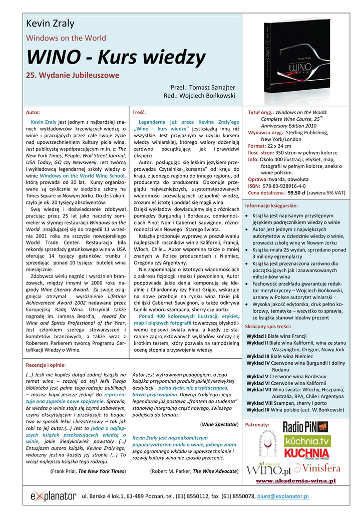 Kevin Zraly Windows on the World WINO - Kurs wiedzy 25. Wydanie Jubileuszowe Przeł.: Tomasz Szmajter Red.: Wojciech Bońkowski Autor: Treść: Kevin Zraly jest jednym z najbardziej znanych wykładowców krzewiących wiedzę o winie i pracujących przez całe swoje życie nad upowszechnieniem kultury picia wina. Jest publicystą współpracującym m.in. z: The New York Times, People, Wall Street Journal, USA Today, GQ czy Newsweek. Jest twórcą i wykładowcą legendarnej szkoły wiedzy o winie Windows on the World Wine School, którą prowadzi od 30 lat. Kursy organizowane są cyklicznie w siedzibie szkoły na Times Square w Nowym Jorku. Do dziś ukończyło je ok. 20 tysięcy absolwentów. Swą wiedzę i doświadczenie zdobywał pracując przez 25 lat jako naczelny sommelier w słynnej restauracji Windows on the World znajdującej się do tragedii 11 września 2001 roku na szczycie nowojorskiego World Trade Center. Restauracja biła rekordy sprzedaży gatunkowego wina w USA oferując 14 tysięcy gatunków trunku i sprzedając ponad 10 tysięcy butelek wina miesięcznie. Zdobywca wielu nagród i wyróżnień branżowych, między innymi w 2006 roku nagrody Wine Literary Award. Za swoje osiągnięcia otrzymał wyróżnienie Lifetime Achievement Award 2002 nadawane przez Europejską Radę Wina. Otrzymał także nagrodę im. Jamesa Beard’a, Award for Wine and Spirits Professional of the Year. Jest członkiem szeregu stowarzyszeń i komitetów branżowych, a także wraz z Robertem Parkerem twórcą Programu Certyfikacji Wiedzy o Winie. Legandarna już praca Kevina Zraly’ego „Wino – kurs wiedzy” jest książką inną niż wszystkie. Jest przyjaznym w użyciu kursem wiedzy winiarskiej, którego walory doceniają zarówno początkujący, jak i prawdziwi eksperci. Autor, posługując się lekkim językiem przeprowadza Czytelnika-„kursanta” od kraju do kraju, z jednego regionu do innego regionu, od producenta do producenta. Dokonuje przeglądu najważniejszych, usystematyzowanych wiadomości pozwalających uzupełnić wiedzę, zrozumieć istotę i poddać się magii wina. Dzięki wykładowi dowiadujemy się o różnicach pomiędzy Burgundią i Bordeaux, odmiennościach Pinot Noir i Cabernet Sauvignon, różnorodności win Nowego i Starego świata. Książka proponuje wyprawę w poszukiwaniu najlepszych roczników win z Kalifornii, Francji, Włoch, Chile… Autor wspomina także o mniej znanych w Polsce producentach z Niemiec, Oregonu czy Argentyny. Nie zapominając o istotnych wiadomościach z zakresu fizjologii smaku i powonienia, Autor podpowiada jakie dania komponują się idealnie z Chardonnay czy Pinot Grigio, wskazuje na nowe przeboje na rynku wina takie jak chilijski Cabernet Sauvignon, a także odkrywa tajniki wyboru szampana, sherry czy porto. Ponad 400 kolorowych ilustracji, etykiet, map i pięknych fotografii towarzyszą błyskotliwemu opisowi świata wina, a każdy ze starannie zaprojektowanych wykładów kończy się krótkim testem, który pozwala na samodzielną ocenę stopnia przyswojenia wiedzy. Recenzje i opinie: (…) Jeśli nie kupiłeś dotąd żadnej książki na temat wina – zacznij od tej! Jeśli Twoja biblioteka jest pełna tego rodzaju publikacji – musisz kupić jeszcze jedną! Bo reprezentuje ona zupełnie nowe spojrzenie. Sprawia, że wiedza o winie staje się czymś zabawnym, czymś ekscytującym i przekazuje to bogactwo w sposób lekki i bezstresowy – tak jak robi to jej autor.(…) Jest to jedna z najlepszych książek przekazujących wiedzę o winie, jakie kiedykolwiek powstały (…) Entuzjazm autora książki, Kevina Zraly’ego, widoczny jest na każdej jej stronie (…) To wciąż najlepsza książka tego rodzaju. Autor jest wytrawnym pedagogiem, a jego książka przypomina produkt jakiejś niezwykłej destylacji – pełna życia, nie przytłaczająca, łatwo przyswajalna. Dowcip Zraly’ego i jego legendarna już postawa „frontem do studenta” stanowią integralną część nowego, świeżego podejścia do tematu. (Frank Prial, The New York Times) (Robert M. Parker, The Wine Advocate) (Wine Spectator) Tytuł oryg.: Windows on the World: th Complete Wine Course, 25 Anniversary Edition 2010 Wydawca oryg.: Sterling Publishing, New York/London Format: 22 x 24 cm Ilość stron: 350 stron w pełnym kolorze Info: Około 400 ilustracji, etykiet, map, fotografii w pełnym kolorze, aneks o winie polskim. Oprawa: twarda, obwoluta ISBN: 978-83-928916-4-0 Cena detaliczna.: 99,50 zł (zawiera 5% VAT) Informacje księgarskie: Książka jest napisanym przystępnym językiem podręcznikiem wiedzy o winie Autor jest jednym z największych autorytetów w dziedzinie wiedzy o winie, prowadzi szkołę wina w Nowym Jorku Książka miała 25 wydań, sprzedano ponad 3 miliony egzemplarzy Książka jest przeznaczona zarówno dla początkujących jak i zaawansowanych miłośników wina Fachowość przekładu gwarantuje redaktor merytoryczny – Wojciech Bońkowski, uznany w Polsce autorytet winiarski Wysoka jakość edytorska, druk pełno kolorowy, tematyka – wszystko to sprawia, że książka stanowi idealny prezent Skrócony spis treści: Wykład I Białe wina Francji Wykład II Białe wina Kalifornii, wina ze stanu Waszyngton, Oregon, Nowy Jork Wykład III Białe wina Niemiec Wykład IV Czerwone wina Burgundii i doliny Rodanu Wykład V Czerwone wina Bordeaux Wykład VI Czerwone wina Kalifornii Wykład VII Wina świata: Włochy, Hiszpania, Australia, RPA, Chile i Argentyna Wykład VIII Szampan, sherry i porto Wykład IX Wina polskie (aut. W.Bońkowski) Patronaty: Kevin Zraly jest najznakomitszym popularyzatorem nauki o winie, jakiego znam. Jego ogromnego wkładu w upowszechnianie i rozwój kultury wina nie sposób przecenić. www.akademia-wina.pl ul. Barska 4 lok.1, 61-489 Poznań, tel. (61) 8550112, fax (61) 8550078, [email protected]
