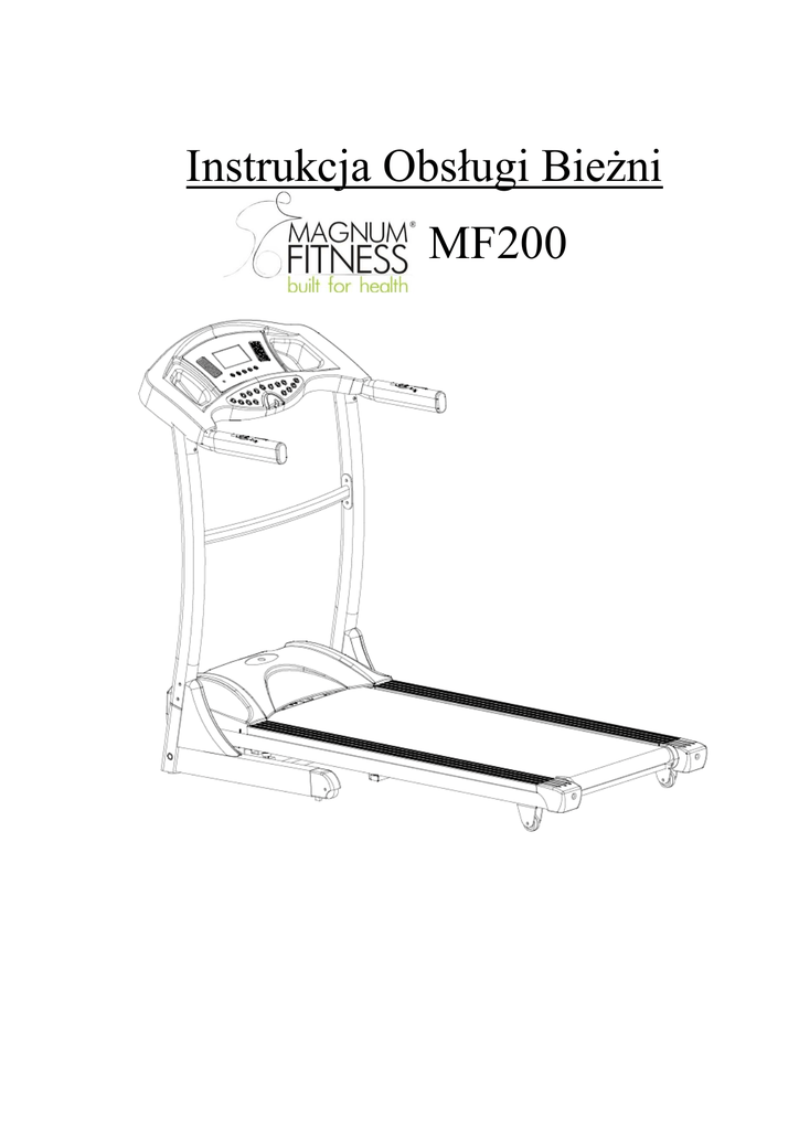 Instrukcja Obsługi Bieżni MF200 MF 200 Spis treści Dziękujemy .......................................................................... 3 Gwarancja ............................................................................ 3 Ogólne Instrukcje Bezpieczeństwa ........................................... 4 Specjalne Środki Ostrożności .................................................. 5 Montaż ................................................................................. 6 Rozpakowanie & Montaż ......................................................... 7 ZESTAW SPRZĘTU ................................................................. 7 Ilustracja Montażu ................................................................. 9 Lista Części ........................................................................ 10 Ilustracja Montażu ............................................................... 11 Instrukcja montażu ............................................................. 12 Monitor Treningu ................................................................. 14 Utrzymanie i Konserwacja .................................................... 19 Ważne wskazówki ................................................................ 21 Rozwiązywanie Problemów ................................................... 22 Rozwiązywanie Problemów ................................................... 22 Ogólne wskazówki fitness ..................................................... 23 Ćwiczenia osobiste .............................................................. 23 Rozgrzewka/ ćwiczenia rozciągające ...................................... 24 Strona 2 MF 200 Dziękujemy Dziękujemy za zakup naszego produktu. Pozwoli on ćwiczyć swoje mięśnie w prawidłowy sposób i poprawić swoją kondycję - a wszystko to w domowym otoczeniu. Gwarancja Importer tego urządzenia zapewnia, że urządzenie to zostało wykonane z wysokiej jakości materiałów. Warunkiem dorozumianej gwarancji jest użytkowanie zgodne z instrukcją obsługi. Niewłaściwe użycie i / lub nieprawidłowy transport może spowodować utratę gwarancji. Gwarancja przewidziana jest na okres 1 roku, począwszy od daty zakupu. Jeśli nabyte urządzenie jest wadliwe, prosimy o kontakt z Biurem Obsługi Klienta w czasie 12 miesięcy od daty zakupu. Jeśli przewód zasilający, który otrzymałeś został zniszczony, aby uniknąć niebezpieczeństwa, powinien on być wymieniony przez nas, nasz dział obsługi lub współzależny profesjonalny serwis gwarancyjny. Gwarancję stosuje się do następujących części (o ile wchodzą w zakres dostawy): Rama, przewód zasilający, urządzenia elektroniczne, pianki, koła. Gwarancja nie obejmuje: • • • • Uszkodzenie dokonane przez czynniki zewnętrzne. Działanie nieautoryzowanych podmiotów . Niewłaściwe obchodzenie się z produktem (brak konserwacji) Niestosowanie się do instrukcji obsługi. Gwarancja nie obejmuje również części zużywających się oraz elementów luźnych (np. pas ruchomy). Urządzenie jest przeznaczone wyłącznie do użytku prywatnego. Gwarancja nie ma zastosowania do profesjonalnego wykorzystania. W razie potrzeby części zamienne mogą być zamawiane w Dziale Obsługi Klienta. Upewnij się, że posiadasz następujące informacje podczas zamawiania części zamiennych. • Instrukcja obsługi • Numer modelu (w tym przypadku MF200) • Dowód zakupu wraz z datą zakupu Prosimy nie przysyłać urządzenia do naszej firmy, jeśli Dział Obsługi o to nie poprosi. Koszty niezamówionych przesyłek będą ponoszone przez nadawcę. Strona 3 MF 200 Ogólne Instrukcje Bezpieczeństwa Podczas projektowania i produkcji tego urządzenia fitness duży nacisk został położony na bezpieczeństwo. Mimo to jest bardzo ważne, aby ściśle przestrzegać instrukcji bezpieczeństwa. Nie ponosimy odpowiedzialności za wypadki, które będą spowodowane w związku z jej nieprzestrzeganiem. Aby zapewnić bezpieczeństwo i zapobiec wypadkom, należy przeczytać instrukcję obsługi dokładnie i uważnie przed użyciem urządzenia sportowego po raz pierwszy. 1) Skonsultuj się z lekarzem przed rozpoczęciem ćwiczeń na tym urządzeniu. Jeżeli chcesz ćwiczyć regularnie i intensywnie, doradzamy zasięgnięcie opinii swojego lekarza. Jest to szczególnie ważne dla użytkowników z problemami zdrowotnymi. 2) Zalecamy, aby osoby niepełnosprawne korzystały z urządzenia podczas obecności wykwalifikowanego opiekuna. 3) Podczas używania urządzenia fitness, miej na sobie wygodne ubranie, najlepiej sportowe buty. Unikaj noszenia luźnych ubrań, które mogłyby zaplątać się w ruchome części urządzenia. 4) Należy natychmiast przerwać ćwiczenie w przypadku złego samopoczucia lub jeśli poczujesz ból stawów lub mięśni. W szczególności, należy obserwować, jak organizm reaguje na program ćwiczeń. Zawroty głowy to znak, że ćwiczysz zbyt intensywnie. Gdy poczujesz zawroty głowy, połóż się na ziemi do momentu ustania objawów. 5) Urządzenie nie jest przeznaczone do użytku przez osoby (w tym dzieci) o ograniczonej zdolności fizycznej, czuciowej lub psychicznej, lub braku doświadczenia i wiedzy, chyba że dzieje się to pod nadzorem lub zgodnie z instrukcją użytkowania urządzenia przez osobę odpowiedzialną za ich bezpieczeństwo. Dzieci należy pilnować, aby nie bawiły się urządzeniem. 6) Upewnij się, że dzieci nie ma w pobliżu, gdy ćwiczysz na urządzeniu. Ponadto, urządzenie powinno być umieszczone w miejscu, z dala od dzieci i zwierząt domowych. 7) Upewnij 8) Po podłączeniu urządzenia sportowego zgodnie z instrukcją obsługi, upewnij się, czy wszystkie śruby, wkręty i nakrętki są prawidłowo zamontowane i dokręcone. Używaj wyłącznie sprzętu zalecanego i / lub dostarczonego przez importera. 9) Nie należy używać urządzenia, które jest uszkodzone lub niesprawne. 10) Zawsze umieszczaj urządzenie na powierzchnia