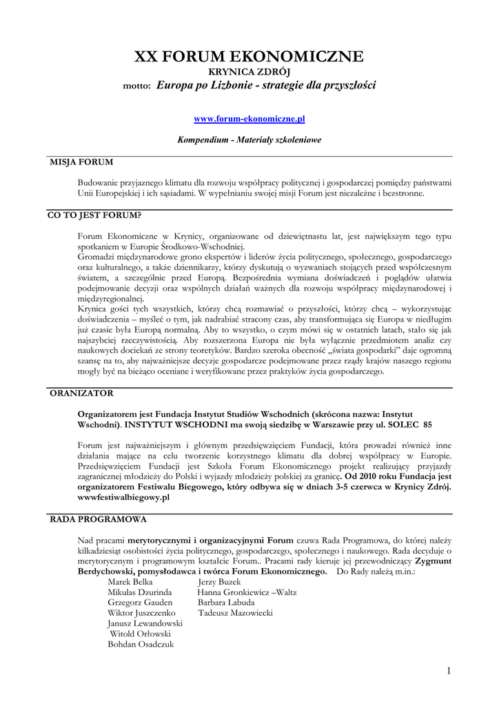 XX FORUM EKONOMICZNE KRYNICA ZDRÓJ motto: Europa po Lizbonie - strategie dla przyszłości www.forum-ekonomiczne.pl Kompendium - Materiały szkoleniowe MISJA FORUM Budowanie przyjaznego klimatu dla rozwoju współpracy politycznej i gospodarczej pomiędzy państwami Unii Europejskiej i ich sąsiadami. W wypełnianiu swojej misji Forum jest niezaleŜne i bezstronne. CO TO JEST FORUM? Forum Ekonomiczne w Krynicy, organizowane od dziewiętnastu lat, jest największym tego typu spotkaniem w Europie Środkowo-Wschodniej. Gromadzi międzynarodowe grono ekspertów i liderów Ŝycia politycznego, społecznego, gospodarczego oraz kulturalnego, a takŜe dziennikarzy, którzy dyskutują o wyzwaniach stojących przed współczesnym światem, a szczególnie przed Europą. Bezpośrednia wymiana doświadczeń i poglądów ułatwia podejmowanie decyzji oraz wspólnych działań waŜnych dla rozwoju współpracy międzynarodowej i międzyregionalnej. Krynica gości tych wszystkich, którzy chcą rozmawiać o przyszłości, którzy chcą – wykorzystując doświadczenia – myśleć o tym, jak nadrabiać stracony czas, aby transformująca się Europa w niedługim juŜ czasie była Europą normalną. Aby to wszystko, o czym mówi się w ostatnich latach, stało się jak najszybciej rzeczywistością. Aby rozszerzona Europa nie była wyłącznie przedmiotem analiz czy naukowych dociekań ze strony teoretyków. Bardzo szeroka obecność „świata gospodarki” daje ogromną szansę na to, aby najwaŜniejsze decyzje gospodarcze podejmowane przez rządy krajów naszego regionu mogły być na bieŜąco oceniane i weryfikowane przez praktyków Ŝycia gospodarczego. ORANIZATOR Organizatorem jest Fundacja Instytut Studiów Wschodnich (skrócona nazwa: Instytut Wschodni). INSTYTUT WSCHODNI ma swoją siedzibę w Warszawie przy ul. SOLEC 85 Forum jest najwaŜniejszym i głównym przedsięwzięciem Fundacji, która prowadzi równieŜ inne działania mające na celu tworzenie korzystnego klimatu dla dobrej współpracy w Europie. Przedsięwzięciem Fundacji jest Szkoła Forum Ekonomicznego projekt realizujący przyjazdy zagranicznej młodzieŜy do Polski i wyjazdy młodzieŜy polskiej za granicę. Od 2010 roku Fundacja jest organizatorem Festiwalu Biegowego, który odbywa się w dniach 3-5 czerwca w Krynicy Zdrój. wwwfestiwalbiegowy.pl RADA PROGRAMOWA Nad pracami merytorycznymi i organizacyjnymi Forum czuwa Rada Programowa, do której naleŜy kilkadziesiąt osobistości Ŝycia politycznego, gospodarczego, społecznego i naukowego. Rada decyduje o merytorycznym i programowym kształcie Forum.. Pracami rady kieruje jej przewodniczący Zygmunt Berdychowski, pomysłodawca i twórca Forum Ekonomicznego. Do Rady naleŜą m.in.: Marek Belka Jerzy Buzek Mikulas Dzurinda Hanna Gronkiewicz –Waltz Grzegorz Gauden Barbara Labuda Wiktor Juszczenko Tadeusz Mazowiecki Janusz Lewandowski Witold Orłowski Bohdan Osadczuk 1 bp. Tadeusz Pieronek Aleksander Smolar Zygmunt Solorz-śak Leopold Unger FORUM E K O N O M I CZ N E Dotychczas odbyło się 19 edycji Forum. Z roku na rok przybywało gości a program stawał się coraz bogatszy. Zeszłoroczna, XIX edycja zgromadziła ok. 3000 uczestników z 49 krajów Europy, Ameryki Północnej i Azji. Wśród nich znaleźli się wysocy rangą politycy, delegacje rządowo-parlamentarne, eksperci, szefowie instytucji centralnych, biznesmeni przedstawiciele organizacj pozarządowych oraz dziennikarze. OBRADY FORUM Obrady Forum rozpoczynają się zawsze w środę a kończą w piątek ŚRODA 8 września 2010: - inauguracyjna sesja plenarna - Uroczysty koncert galowy połączony z wręczeniem nagród Forum CZWARTEK < PIĄTEK 09, 10 września 2010: - debaty (sesje, panele tematyczne, warsztaty) - imprezy towarzyszące i rekreacyjne SOBOTA 11 września 2010: spotkanie podsumowujące praktyki studenckie, do godz 14.00 wyjazd z Krynicy Zdrój. Debaty Forum będą podzielone na ścieŜki tematyczne: Biznes i zarządzanie Makroekonomia Nauka i kultura Paliwa i energetyka Polityka międzyn. i bezpieczeństwo Nowa gospodarka Unia i jej sąsiedzi Regiony Społeczeństwo W ramach kaŜdej ze ścieŜek odbywać się będą sesje i panele tematyczne, warsztaty, okrągłe stoły, śniadania i obiady robocze. Czas trwania kaŜdego wydarzenia merytorycznego ok. 1,5 godziny. Sesje tematyczne poświęcone wiodącym tematom Forum, odbywają się z udziałem wszystkich gości. Głos zabierają prezydenci, premierzy oraz inni waŜni goście. Panele dyskusyjne dotyczą szczegółowych zagadnień i gromadzą osoby zainteresowane daną tematyką. Moderatorami i panelistami są polscy i zagraniczni eksperci specjalizujący się w poszczególnych zagadnieniach. Szczegółowy program będzie dostępny dla gości Forum w dniu rozpoczęcia Forum. W formie drukowanej otrzymają w hotelu przy odbiorze identyfikatora. Program Forum drukowany jest w 3 językach: polskim, angielskim i rosyjskim. Student zajmujący się salami seminaryjnymi obowiązkowo powinien posiadać jeden egzemplarz Programu Forum i umieć się w nim poruszać. Obrady Forum są tłumaczone symultanicznie na języki: angielski rosyjski polski oraz ew. na inny w wypadku, jeśli uczestniczy waŜny Gość spoza podanych obszarów językowych, wówczas debata jest tłumaczona na jego język. Obrady Forum odbywają się w obrębie Centrum Kongresowego. Centrum Kongresowe wyznaczone jest lokalizacją krynickiego Deptaka. WYDARZENIA FORUM 1. Uroczysta Gala Wręczenia NAGRÓD FORUM EKONOMICZNEGO Od kilku lat, podczas kaŜdej edycji Forum są przyznawane Nagrody Forum Ekonomicznego. Rada Programowa Forum honoruje wybitne osoby, firmy i instytucje, z krajów Europy 2 Środkowowschodniej, które w ubiegłym roku kalendarzowym wyróŜniły się swoją działalnością, efektywnością i osiągnięciami. Nagrody są przyznane w następujących kategoriach: • Człowiek Europy Środkowo-Wschodniej. Nagroda dla wybitnej osobistości, która swoją postawą i dokonaniami wyw