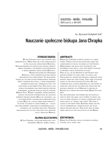Kultura – Media – Teologia 2011 nr 5, s. 93-107. ks. Ryszard Gołąbek SAC Nauczanie społeczne biskupa Jana Chrapka STRESZCZENIE: BP JAN CHRAPEK ZNANY JEST GŁÓWNIE JAKO MEDIOZNAWCZA. MNIEJ MÓWI SIĘ O JEGO DOKONANIACH CO DO NAUCZANIA SPOŁECZNEGO KOŚCIOŁA. NIEUWZGLĘDNIENIE TEJ KWESTII DAJE JEDNAK NIEPEŁNY OBRAZ CZŁOWIEKA, TAK BARDZO ZAANGAŻOWANEGO W RÓŻNE DZIEDZINY DZIAŁALNOŚCI KOŚCIOŁA. PRZEDE WSZYSTKIM BYŁ PASTERZEM KOŚCIOŁA, ŻYWO INTERESUJĄCYM SIĘ KAŻDYM PRZEJAWEM ŻYCIA SPOŁECZNEGO. TA WRAŻLIWOŚĆ POZWALAŁA MU PRECYZYJNIE WERBALIZOWAĆ WSZELKIE BIEDY Z KTÓRYMI SIĘ STYKAŁ, A TAKŻE PODEJMOWAĆ KONKRETNE DZIAŁANIA, MOBILIZUJĄC PRZY TYM WSZYSTKICH LUDZI DOBREJ WOLI. ZWŁASZCZA CZAS POSŁUGI PASTERSKIEJ JAKO ORDYNARIUSZA DIECEZJI RADOMSKIEJ, NAJPEŁNIEJ POKAZAŁ BOGATE WNĘTRZE BISKUPA JANA. WIEDZA I MĄDROŚĆ, KTÓRE POSIADAŁ, ZOSTAŁY SKUTECZNIE WYKORZYSTANE DO UKAZANIA ZARÓWNO WIELKIEJ MIŁOŚCI BOGA DO CZŁOWIEKA, JAK TEŻ KONIECZNOŚCI CZŁOWIECZEGO WSPÓŁDZIAŁANIA BOŻĄ, BY „CZYNIĆ SOBIE ZIEMIĘ PODDANĄ”. A CZYNIŁ TO ZAWSZE W TAKIEJ FORMIE, BY – ZNAJĄC SPECYFIKĘ MEDIÓW I KOMUNIKACJI INTERPERSONALNEJ – UZYSKIWAĆ JAK NAJLEPSZE REZULTATY. NINIEJSZE Z ŁASKĄ OPRACOWANIE MA NA CELU UKAZANIE TYCH ASPEKTÓW ŻYCIA I DZIAŁANIA ABSTRACT: BISHOP JAN CHRAPEK IS MOSTLY KNOWN AS A MEDIA EXPERT. THERE IS MUCH LESS KNOWLEDGE ABOUT HIS ACHIEVEMENTS IN SOCIAL TEACHINGS OF THE CHURCH. DISREGARDING THIS ISSUE GIVES INCOMPLETE AND INCOHERENT VIEW ABOUT A MAN VERY DEEPLY INVOLVED CHURCH ACTIVITY. FIRST OF ALL, HE WAS PASTOR OF THE CHURCH WITH INTENSE INTEREST OF EVERY ASPECT OF SOCIAL LIFE. THIS SENSITIVITY HELPED HIM PRECISELY VERBALIZE EVERY POVERTY WHICH HE CAME ACROSS. THEY WERE CONTAINED MAINLY IN THE FOUR EXTENSIVE LETTERS. HE ALSO IN DIFFERENT AREAS OF UNDERTOOK REAL ACTIONS MOBILIZING ALL THE PEOPLE OF GOOD WILL WHO HE MET. IT SHOULD BE NOTED THAT HIS ORDINARY IN DIOCESE OF RADOM FULLY SHOWN HOW RICH INSIDE BISHOP JAN HAD BEEN. ALL HIS KNOWLEDGE AND WISDOM WAS SUCCESSFULLY USED TO SHOW THE GREAT LOVE OF GOD TO PEOPLE AND PASTORAL MINISTRY AS AN ALSO TO SHOW NECESSITY OF HUMAN COOPERATION WITH “SUBDUE THE EARTH”. HE MADE IT KNOWING MEDIA AND THE USE OF INTERPERSONAL COMMUNICATION, HE COULD OBTAIN THE BEST RESULTS. THIS STUDY AIMS TO SHOW THESE ASPECTS OF LIFE AND ACTIVITY OF THE BISHOP. DIVINE GRACE TO ALWAYS IN THE RIGHT FORM. BISKUPA. SŁOWA KLUCZOWE: KEYWORDS: BP JAN CHRAPEK, NAUCZANIE SPOŁECZNE, LISTY PASTERSKIE, MIŁOŚĆ, DOBRO, TROSKA. BISHOP JAN CHRAPEK, SOCIAL TEACHINGS, PASTORAL LETTERS, LOVE, GOOD, CARE. Kultura – Media – Teologia 5/2011 93 IMPLIKACJE TEOLOGICZNE U dokumentowane nauczanie pasterskie biskupa Jana Chrapka1 jako ordynariusza Diecezji Radomskiej, to przede wszystkim Listy Pasterskie. Są to: Tylko miłość się liczy – na temat biedy i ubóstwa; Ślad najwyższego dobra – na temat dobra wspólnego; Dzielmy się miłością – na temat wolontariatu i Troska drugim imieniem miłości – na temat troski. Posługa biskupa Jana Chrapka i jego nauczanie to bowiem nie tylko teoria, ale także konkretne dzieła, które wprowadzały w czyn słowa zawarte w Listach. I tego zaangażowania Biskupa nie sposób pominąć. Niniejsze opracowanie stawia sobie za cel ukazanie wartości prezentowanych w Listach i przedstawienie ich w aspekcie postaw moralnych, które są jeszcze mocniejszą motywacją do wszelkiego działania, poszukując jednocześnie w Bogu ostatecznych odniesień i uzasadnień. Analiza ta jest też próbą odnajdywania konkretnych zastosowań w działaniach duszpasterskich Biskupa, wynikających ze wskazań zawartych w Listach. Podstawowym materiałem źródłowym będą wspomniane cztery obszerne Listy Pasterskie, które stanowiły niejako „wizytówkę” pragnień i zadań, jakie stawiał Biskup przed sobą i swoimi diecezjanami. Materiał uzupełniający, to książki i inne opracowania o biskupie Janie Chrapku oraz materiały dotyczące omawianych zagadnień społecznych. W artykule zastosowano metodę analityczno-syntetyczną. Poddano analizie publikacje i wypowiedzi Biskupa pod kątem przyjętego tematu oraz dokonano syntezy materiału źródłowego2. Tylko miłość się liczy. List na temat biedy i ubóstwa Biskup Jan Chrapek pisał: „Zauważenie faktu, iż ubóstwo ma nie tylko wymiar materialny, ale przede wszystkim kulturowy, a więc wiąże się ze wszystkimi aspektami życia jednostki i rodziny, jest niezmiernie ważne, gdyż pokazuje, że ograniczenie walki z ubóstwem wyłącznie do pomocy materialnej jest nieskuteczne, a nawet szkodliwe, ponieważ utrwala stan bezradności i uzależnienia od innych”3. W ten sposób kieruje uwagę odbiorcy bezpośrednio na istotę zjawiska, odwołując się również do wynikających z tego konsekwencji. Dalej dowodzi, że jeśli się stwierdzi, iż „ubogimi są też ludzie dotknięci 1 2 3 94 Bp Jan Chrapek ur. 18 lipca 1948 r., zm. 18 października 2001r. Ceniony teoretyk mediów i wykładowca na Katolickim Uniwersytecie Lubelskim, Papieskim Uniwersytecie Gregoriańskim w Rzymie, Akademii Teologii Katolickiej /od 1999 r. zmiana nazwy na Uniwersytet Kardynała Stefana Wyszyńskiego/ i Uniwersytecie Warszawskim. Sakrę biskupią przyjął 5 czerwca 1992 r. w Drohiczynie obejmując obowiązki biskupa pomocniczego. Po śmierci ordynariusza został na krótko /od 25 maja do 10 lipca 1994 r./ Administratorem Diecezji Drohiczyńskiej, a następnie rozpoczął pracę pasterską w Toruniu, jako biskup pomocniczy tejże diecezji. 18 czerwca 1999 r. został ustanowiony „Biskupem Kościoła Radomskiego”. Por. E. Poniewieski, Biskup Jan Chrapek, w: Mój Radom. Wspominając biskupa Jana Chrapka, red. P. Turzyński, W. Stan. Radom [brw] s. 20 – 22. Opracowanie to powstało na podstawie własnej pracy magisterskiej napisanej w Katedrze Teologii Moralnej szczegółowej Katolickiego Uniwersytetu Lubelskiego Jana Pawła II pod kierunkiem ks. prof. KUL 