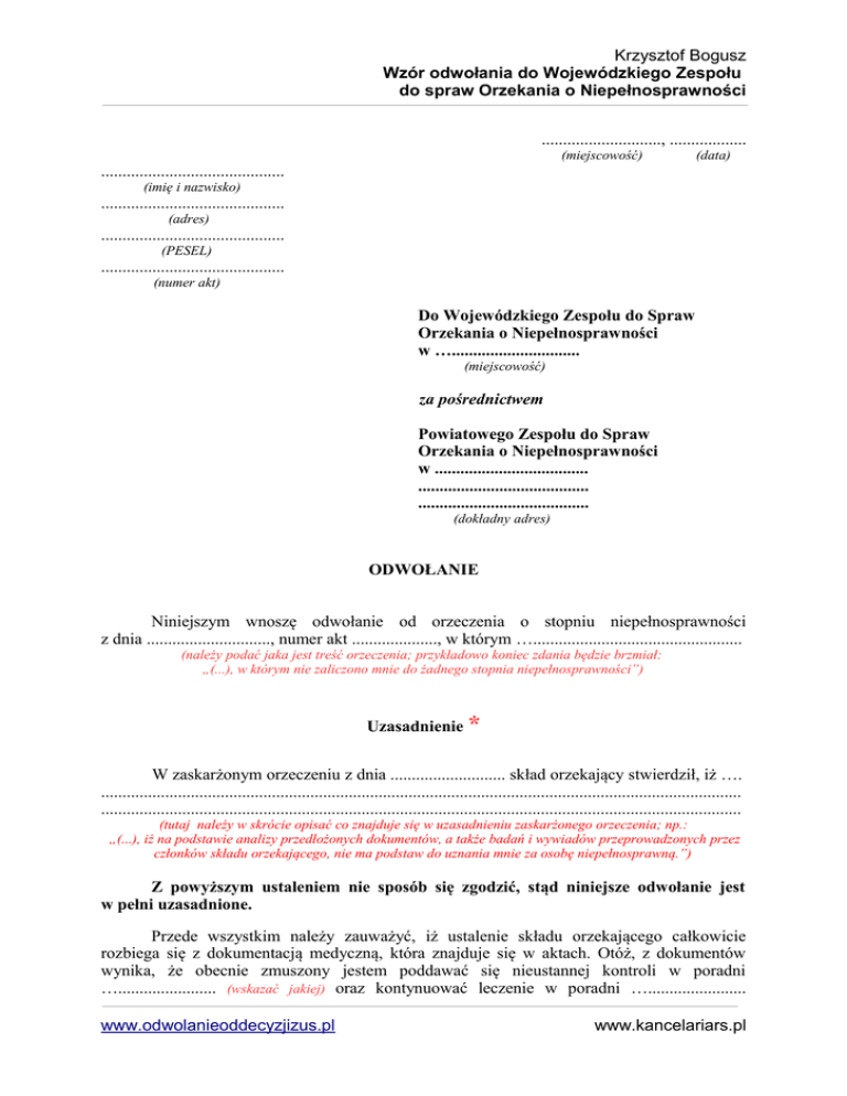 Krzysztof Bogusz Wzór odwołania do Wojewódzkiego Zespołu do spraw Orzekania o Niepełnosprawności ............................, .................. (miejscowość) (data) ........................................... (imię i nazwisko) ........................................... (adres) ........................................... (PESEL) ........................................... (numer akt) Do Wojewódzkiego Zespołu do Spraw Orzekania o Niepełnosprawności w ….............................. (miejscowość) za pośrednictwem Powiatowego Zespołu do Spraw Orzekania o Niepełnosprawności w .................................... ........................................ ........................................ (dokładny adres) ODWOŁANIE Niniejszym wnoszę odwołanie od orzeczenia o stopniu niepełnosprawności z dnia ............................., numer akt ...................., w którym …................................................. (należy podać jaka jest treść orzeczenia; przykładowo koniec zdania będzie brzmiał: „(...), w którym nie zaliczono mnie do żadnego stopnia niepełnosprawności”) Uzasadnienie * W zaskarżonym orzeczeniu z dnia ........................... skład orzekający stwierdził, iż …. ...................................................................................................................................................... ...................................................................................................................................................... (tutaj należy w skrócie opisać co znajduje się w uzasadnieniu zaskarżonego orzeczenia; np.: „(...), iż na podstawie analizy przedłożonych dokumentów, a także badań i wywiadów przeprowadzonych przez członków składu orzekającego, nie ma podstaw do uznania mnie za osobę niepełnosprawną.”) Z powyższym ustaleniem nie sposób się zgodzić, stąd niniejsze odwołanie jest w pełni uzasadnione. Przede wszystkim należy zauważyć, iż ustalenie składu orzekającego całkowicie rozbiega się z dokumentacją medyczną, która znajduje się w aktach. Otóż, z dokumentów wynika, że obecnie zmuszony jestem poddawać się nieustannej kontroli w poradni …....................... (wskazać jakiej) oraz kontynuować leczenie w poradni …....................... www.odwolanieoddecyzjizus.pl www.kancelariars.pl Krzysztof Bogusz Wzór odwołania do Wojewódzkiego Zespołu do spraw Orzekania o Niepełnosprawności (wskazać jakiej). Na domiar tego leczę się w poradni ….... (wskazać jakiej) oraz jestem poddany ciągłemu leczeniu farmakologicznemu (można wskazać jakie leki się zażywa) . Powyższe jasno wynika z …................... (należy wskazać dokumenty z podaniem ich daty sporządzenia) , które zostały wraz z wnioskiem przedłożone do akt sprawy. Na poparcie powyższego dodatkowo przedkładam …............... (wskazać jaki dokument z podaniem daty sporządzenia), z którego można wyczytać, iż …................ (należy opisać wskazania lub zalecenia wynikające z nowych dokumentów). Innymi słowy, występujące u mnie schorzenia - …............................... (należy wymienić jakie) – nie dają się pogodzić z rozstrzygnięciem zawartym w zaskarżonym orzeczeniu. Nadto, ustalenie składu orzekającego jest wątpliwe w porównaniu do bezpośredniego badania i przeprowadzonych wywiadów przez członków składu orzekającego. Mianowicie, ... …................................................................................................................................................... …................................................................................................................................................... (należy opisać jak przebiegało badanie, co z tego wynika i ewentualnie porównać z przedłożonymi do akt dokumentami). Tak więc mając powyższe na uwadze zasadnym jest uznanie mnie za osobę niepełnosprawną, bowiem występujące schorzenia, wbrew wyrażonemu stanowisku w zaskarżonym orzeczeniu, powodują trwałą lub co najmniej okresową niezdolność do wypełniania ról społecznych z powodu stałego lub długotrwałego naruszenia sprawności organizmu, a w szczególności niezdolność do pracy. W związku z tym wnoszę odwołanie od wskazanego w petitum orzeczenia. Załączniki: - …............., - ….............. (tutaj należy wymienić ewentualne dodatkowe dokumenty, które dotychczas nie zostały przedłożone akt sprawy, a zostały wymienione w treści uzasadnienia). Z poważaniem ....................... * to jest przykładowy wzór uzasadnienia; zamiast tego lub w uzupełnieniu można opisać inne okoliczności, które wynikają z treści dokumentów załączonych do wniosku. www.odwolanieoddecyzjizus.pl www.kancelariars.pl