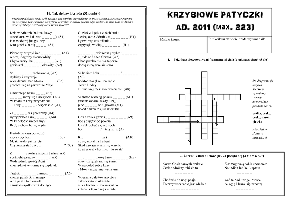 16. Tak się bawi Ariada (32 punkty) Wszelkie podobieństwo do osób i postaci jest zupełnie przypadkowe! W trakcie pisania poniższego poematu nie ucierpiało żadne zwierzę. Na pytanie co brałem w trakcie pisania odpowiadam, że moja żona do dziś nie może się doliczyć psychotropów w swojej aptece!!! Dziś w Ariadzie bal maskowy (choć karnawał dawno _ _ _ _ _ ). (S1) Pan wodzirej już gotowy wita gości z hardą _ _ _ _ . (S1) Gdzieś w kąciku zaś cichutko siedzą sobie Górniak z _ _ _ _ _ _ _ (H1) i gaworząc coś milutko zagryzają wódkę _ _ _ _ _ _ _ . (H1) Pierwszy przybył imć _ _ _ _ _ _ _ _ (A1) w strój Zagłoby ciasno wbity. Chyżo ruszył ku _ _ _ _ _ _ _ _ (A1) gdzie stał _ _ _ _ _ _ _ okowity. (A2) _ _ _ _ _ _ _ wieńcem przybrał _ _ _ _ _ _ / _ udawać chce Cezara. (A7) Choć przebranie ma toporne dobrą miną grać się stara. Są _ _ _ _ _ _ _ zachowania, (A2) etykiety i zwyczaje więc dżentelmen Marek _ _ _ _ _ (S2) przebrał się za pszczółkę Maję. W kącie z bólu _ _ _ _ _ _ _ _ / _ _ _ _ _ _ (A8) bo ktoś stanął mu na żądle. Teraz biedny _ _ _ _ _ _ _ _ _ _ _ _ _ / _ wielkiej męki łka przeciągle. (A8) Obok niego nasza _ _ _ _ (S2) _ _ _ _ _ raczy się siarczyście. (A3) W kostium Ewy przyodziana … Ewy _ _ _ _ _ - oczywiście. (A3) Za _ _ _ _ _ zaś przebrany (A4) sączy piwko sam _ _ _ _ _ . (A4) W Penelopie zakochany? Będę cicho – bo się wyda. Kartofelki czas odcedzić, męczy pęcherz _ _ _ _ _ _ _ _ _ _ (S3) Męski szalet już zajęty, Czy skorzystać chce z _ _ _ _ _ _ _ _ _? (S3) Z _ _ _ _ _ chodzi skarbnik Jadzia (A5) i ustrzelić pragnie _ _ _ _ _ . (A5) Woli jednak spokój Adaś więc gdzieś w tłumie się zaplątał. Trąbski _ _ _ _ _ _ zamiast _ _ _ _ _ _ (A6) włożył pasek Armaniego. A że pasek to niewiele damskie szpilki wzuł do tego. KRZYSIOWE PATYCZKI AD. 2011 (max. 223) Punkcików w pocie czoła zgromadził: Rozwiązuje: 1. Szkotka z pieszczotliwymi fragmentami ciała (a tak na zachętę) (5 pkt) Do diagramu (w miejsca szczałek) wpisujemy wyrazy zawierające poniższe słowa: Wkrótce w obieg poszła _ _ _ _ _ (M1) (wszak zapalić każdy lubi), jeno _ _ _ _ _ boli główka (M1) bo od dawna ma już w czubie. czółko, uszko, oczko, nosek, główka Gosia szuka gdzieś _ _ _ _ _ _ _ _ (A9) bo ją ciągnie do pokera. Biedak odkuć się nie zdoła bo _ _ _ _ _ _ _ / _ trzy zera. (A9) Aha.. jedno słowo to nazwisko ;) Kto _ _ _ _ _ _ _ zaś _ _ _ _ _ _ _ (A10) co się rzucił na Tałaja? Skąd agresja w nim się wzięła, że aż urwać chce mu… krawat? _ _ / _ _ _ _ mowę Jarek _ _ _ _ _ _ (H2) choć już język mu się ścina. Wina dolać sobie każe - Mowy raczej nie wytrzyma. Wreszcie całe towarzystwo zakończyło maskaradę a ja z bólem mimo wszystko sklecić z tego chcę szaradę. 2. Żarciki kalamburowe (lekko porąbane) (4 x 2 = 8 pkt) Nasza Gosia samych braków Czek podróżny taki da tu. _______ Z samogłoską sobie spozieram Na indian lub helikoptera ______ Chodźcie do nogi pasje To przypuszczenie jest właśnie ___________ weź to pod uwagę, proszę że wyję i łzami się zanoszę _______ 12. Krzyżówka niekoniecznie sportowa (25 punktów + 1 za hasło) Przymrużka jak co roku (38 punktów + 2 za hasło) 7. 1 2 1 3 Z hasła dowiemy się w co inwestują gospodynie z koniakowa 4 5 6 3 8 7 2 3 5 6 4 8 4 7 9 7 8 9 10 2 7 11 10 11 1 12 13 14 4 1 15 12 10 6 13 16 14 17 11 15 16 17 18 19 9 20 5 18 20 14 19 6 21 22 21 2 10 8 9 23 22 24 25 23 3 Z hasła dowiemy się jaka jest ulubiona dyscyplina sportu kowali ;) POZIOMO: dyscyplina sportu uprawiana przez: - karierowiczów, informatyków, kucharzy, anatomów, stolarzy, gospodynie domowe, perskich władców, szklarzy, krawców, miłośników sztuki, palaczy marihuany; PIONOWO 1. Jan - klubowy trener Adama Małysza; 2. sporo okrętów; 3. roślina uprawna z okolic Morza Śródziemnego (skojarz z Getsemani); 4. na budowie lub na boisku; 5. wiekopomne dzieła; 6. największy narząd limfatyczny u człowieka; 9. tarczowa lub karuzelowa; 13. faza pracy serca; 14. reprezentacyjne domostwo; 16. marka kawy dostępnej na rynku; 17. prostokątny basen w podłodze atrium; 18. spisek; 19. stop miedzi z cyną; 21 skoki; 13. Żarciki kalamburowe (2 x 2 = 4) Gnębię kierownicę kutra, biję ją i kopię Byle tylko zyskać miasto w Europie __________ Ludolfina z małym grotem gdy podmuchasz zagra trochę __________ 12 26 5 27 13 POZIOMO: 2. nie za cicho nie za głośno; 7. królestwo Fortuny; 8. wyraża pacykarza; 9. pod domem fana basketu; 13. WSI we wsi; 14. miejsce gdzie bokserzy katalogują nokauty; 15. pod nią można wykorzystywać energię jądrową; 17. dział literatury, który opisuje zwycięstwo Polski w Euro 2012; 18. nie odkleja się od ciągnika; 19. mleko po przejściach; 20. aprzekręt; 21. najważniejszy gruczoł u rycerza. 22. kolega niewzroku i niedotyku; 23. przy niej teściowa Sokratesa to anioł; 24. Cezarypodaruje? A może zagrodzi?; 25. master of liczydło; 26. Miłosne upośledzenie zmysłu; 27. Włosy dłuższe niż do rumieńców; PIONOWO (hasła dwuwyrazowe): 1. wystają ponad blat; 3. niezadowolony z siebie policjant; 4. renowacja wykonana przez kiepskiego fachowca; 5. śmierdzący sandwicz trawiony przez mikrożyjątka; 6. prezent odtwarzany do znudzenia w adapterze; 10. bezcenny w spodniach każdego faceta; 11. napalona murzynka; 12. premierowi służy do robienia zdjęć; 16. w odtwarzaczu nie okazuje emocji; 19. saperowi barwi lakmus na czerwono. 9. Jolka Hetmańska (36 + 2 pkt) 8. Eliminatka przedhetmańska (12 pkt) Rozwiązanie eliminatki będzie pomocne przy męczeniu się nad hetmanką 1 2 3 4 5 6 1. i Cypryjczyk i Japończyk – kontur; 2. trucizna z kryminałów – Kwiatkowska; 3. zewnętrzna część portu między falochronem a wewnętrznymi basenami portowymi – zjazdowa lub biegowa; 4. pracownik InterREGIO – w Myslovitzach drze się; 5. widełki dla muzyka – gaz niemile widziany w kopalniach; 6. chrząszcz z rodziny czarnu