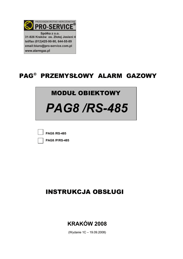 PAG® PRZEMYSŁOWY ALARM GAZOWY MODUŁ OBIEKTOWY PAG8 /RS-485 PAG8 /RS-485 PAG8 /P/RS-485 INSTRUKCJA OBSŁUGI KRAKÓW 2008 (Wydanie 1C – 19.09.2008) Spis treści : I. II. III. IV. V. Przeznaczenie Podstawowe parametry techniczne Opis płyty czołowej i listwy zaciskowej 1. Płyta czołowa 2. Listwa zaciskowa Opis funkcjonalny Modułu Obiektowego PAG8/RS-485 1. Zasilanie centralki 2. Wejście RS-485 3. Wyjścia stykowe i napięciowe 4. Wyjście sterujące wyłączaniem zaworu odcinającego (elektrozaworu) 5. Opis działania Modułu Obiektowego PAG8 Konfiguracja wejść i wyjść I. PRZEZNACZENIE 2 - str. 3 - str. 3 - str. 4 - str. 4 - str. 5 - str. 7 - str. 7 - str. 7 - str. 9 - str. 10 - str. 11 - str. 12 Moduł Obiektowy (Jednostka Centralna) PAG8 zarówno w wersji z wyświetlaczem LCD (PAG8) jak i bez wyświetlacza (PAG-8) jest przeznaczona do obsługi Uniwersalnych Głowic Gazometrycznych EXpert i uniTOX stosowanych w systemach detekcji gazów toksycznych i wybuchowych, w szczególności zaś jest elementem systemu Przemysłowy Alarm Gazowy, służącego do aktywnej ochrony obiektów przed wybuchem gazu poprzez wykrycie alarmowych stężeń tego gazu i odcięcie jego dopływu sterowanym przez system detekcji zaworem samozamykającym. PAG8 jest nowoczesną, mikroprocesorową jednostką centralną, przygotowaną standardowo do obsługi od jednej do ośmiu głowic gazometrycznych (detektorów), posiadającą szereg opcji ustawialnych do potrzeb Użytkownika bez konieczności ingerencji w układ elektroniczny, poprzez odpowiednie zaprogramowanie mikroprocesora. Cechą charakteryzującą PAG8 i wyróżniającą go spośród innych produktów tego rodzaju jest jego gotowość do komunikowania się z Użytkownikiem drogą radio lub telepowiadamiania, a także łączem RS-485. II. PODSTAWOWE PARAMETRY TECHNICZNE 1. 2. 3. 4. 5. Napięcie zasilania – 230 V AC, 50 Hz Podtrzymanie napięcia – ok. 1 h, akumulator wewnętrzny 2,2 Ah Pobór mocy – max. 50 W Temperatura pracy - od - 15 do + 50 oC (zalecana +5 - + 40 oC) Ilość kanałów pomiarowych (maks. ilość detektorów) – 8 detektorów o wyjściach RS-485 i protokole transmisyjnym Modus RTU. Głowice (detektory) mają mieć adresy z zakresu 1….8. 6. Ilość poziomów alarmowych – 2 (Al1, Al2 + Awaria detektora) -standard lub 3 (Al1, Al2, AI3)-opcja 7. Sygnalizacja alarmów – akustyczna i optyczna 8. Pamięć poziomów alarmowych – optyczna 9. Kasowanie pamięci – przyciskiem na ścianie czołowej (przycisk „KASOWANIE”) 10. Zasilanie detektorów – 12 V DC 11. Maksymalny pobór prądu przez detektor – 250mA 12. Sygnalizacja awarii lub braku detektora – optyczna (przerwa lub zwarcie – świecenie czerwonych diod dla odpowiedniego detektora) 13. Wyjścia stykowe – . 6 przekaźników, typ wyjścia NO lub NC, beznapięciowe, max. obciążalność 4 A/250 V – funkcje przekaźników konfigurowalne programowo. 14. Wyjścia napięciowe – 3, 12 V DC osobno dla Al1 i Al2, trzecie konfigurowalne programowo (max. obciążenie wszystkich wyjść 2 A/12 V). 15. Wyjścia napięciowe zasilające 12 V DC i 5 V DC - max. obciążenie 1 A. 16. Wyjście do sterowania zaworem samozamykającym – trzy impulsy wysokoprądowe po przekroczeniu Al2. 17. Wymiary z dławicami – 320 x 285 x 140 mm 18. Obudowa – wysokoudarowy ABS, IP-54 19. Wersje centralki : - PAG8 /RS-485 – moduł obiektowy ośmiokanałowy, wejście RS-485 (protokół Modbus RTU) - PAG8 /P/RS-485 – moduł obiektowy ośmiokanałowy, wejście RS-485 (protokół Modbus RTU), wyświetlanie wyniku pomiarowego (wyświetlacz LCD), III. OPIS PŁYTY CZOŁOWEJ I LISTWY ZACISKOWEJ 3 4 Przycisk kasowania pamięci alarmów Dioda LED -kontrola zasilania : -zasilanie z sieci - kolor zielony -zasilanie z akmulatora wewn. - kolor czerwony Wyświetlacz LCD - tylko wersja PAG-8P Diody LED żółte - sygnalizacja alarmów I progu Diody LED zielone - sygnalizacja stanów wyjść przekaźnikowych i napięciowych WY1...WY8 Pola opisowe wyjść przekaźnikowych i napięciowych Pola opisowe wejść detekcyjnych Diody LED czerwone – Diody LED czerwone sygnalizacja awarii linii - sygnalizacja alarmów III progu Diody LED czerwone przeźroczyste- sygnalizacja alarmów II progu III.1. Płyta czołowa Rys.1. Płyta czołowa Modułu Obiektowego PAG8 Płyta czołowa (rys.1.) Modułu Obiektowego PAG8 /RS-485 zawiera następujące elementy: 1.„KASOWANIE ALARMU” – mikroprzycisk służący do kasowania pamięci stanów alarmowych. 2.„ZASILANIE sieć/akum.” – dioda LED dwukolorowa –kontrola zasilania centralki: - kolor zielony gdy centralka jest zasilana napięciem sieciowym 230V AC. - kolor czerwony gdy centralka jest zasilana z akumulatora wewnętrznego (brak zasilania sieciowego). 3.Diody LED zielone (8szt., w pionowym rzędzie w dolnej części płyty czołowej)– sygnalizacja stanów wyjść przekaźnikowych i napięciowych – patrząc od góry w kolejności od WY1 do WY8 gdzie: -WY1... WY4 –wyj. przekaźnik. opisane na listwie zaciskowej odpowiednio „WY P1”...”WY P4” -WY5 – wyjście przekaźnikowe WY P5 i napięciowe „WY AL1” (sterowane wspólnie) -WY6 – wyjście przekaźnikowe WY P6 i napięciowe „WY AL2” (sterowane wspólnie) -WY7 – wyjście napięciowe „WY AL3” -WY8 – wyjście napięciowe opisane na listwie zaciskowej „STER. ZAW.” –standardowo wyjście do sterowania zaworem odcinającym 4.„Diody LED żółte (8szt., w pionowym rzędzie w górnej części płyty czołowej), opisane jako „Alarmy 1” wejść detekcyjnych od „D1” (pierwszy od góry) do „D8” - sygnalizacja przekroczenia I progów alarmowych na poszczególnych detektorach. 5.„Diody LED pomarańczowe (8szt., w pionowym rzędzie w górnej części płyty czołowej), opisane jako „Alarmy 2” wejść detekcyjnych od „D1” (pierwszy od góry) do „D8” - sygnalizacja przekroczenia II progów alarmowych na poszczególnych detektorach. 6.„Diody LED czerwone