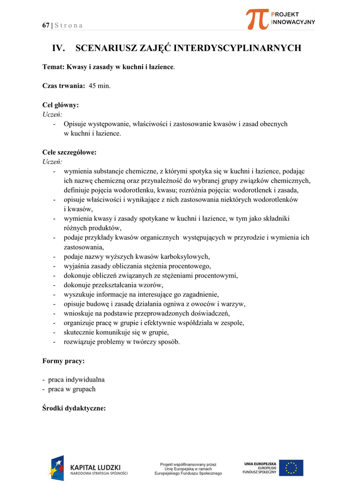 67 | S t r o n a IV. SCENARIUSZ ZAJĘĆ INTERDYSCYPLINARNYCH Temat: Kwasy i zasady w kuchni i łazience. Czas trwania: 45 min. Cel główny: Uczeń: - Opisuje występowanie, właściwości i zastosowanie kwasów i zasad obecnych w kuchni i łazience. Cele szczegółowe: Uczeń: - wymienia substancje chemiczne, z którymi spotyka się w kuchni i łazience, podając ich nazwę chemiczną oraz przynależność do wybranej grupy związków chemicznych, definiuje pojęcia wodorotlenku, kwasu; rozróżnia pojęcia: wodorotlenek i zasada, - opisuje właściwości i wynikające z nich zastosowania niektórych wodorotlenków i kwasów, - wymienia kwasy i zasady spotykane w kuchni i łazience, w tym jako składniki różnych produktów, - podaje przykłady kwasów organicznych występujących w przyrodzie i wymienia ich zastosowania, - podaje nazwy wyższych kwasów karboksylowych, - wyjaśnia zasady obliczania stężenia procentowego, - dokonuje obliczeń związanych ze stężeniami procentowymi, - dokonuje przekształcania wzorów, - wyszukuje informacje na interesujące go zagadnienie, - opisuje budowę i zasadę działania ogniwa z owoców i warzyw, - wnioskuje na podstawie przeprowadzonych doświadczeń, - organizuje pracę w grupie i efektywnie współdziała w zespole, - skutecznie komunikuje się w grupie, - rozwiązuje problemy w twórczy sposób. Formy pracy: - praca indywidualna - praca w grupach Środki dydaktyczne: 68 | S t r o n a - komputer z dostępem do Internetu - zestawy doświadczalne - karty pracy Przebieg zajęć: 1. Wprowadzenie do tematu zajęć. Dyskusja na temat„Czym są kwasy i zasady?” Burza mózgów na temat „Co kojarzy nam się ze słowem kwas czyli gdzie możemy szukać kwasów w naszym domu?”. 2. Wskazanie uczniom celu zajęć. 3. Praca w grupach. Grupa chemiczna - Burza mózgów na temat występowania kwasów i zasad w kuchni i łazience (na podstawie analiz etykiet produktów obecnych w domu i literatury). - Pogadanka na temat zastosowania wybranych kwasów i zasad. - Wyszukiwanie informacji na temat czym jest kwas askorbinowy i w jakich produktach możemy go znaleźć. - Dokonanie podziału kwasów na organiczne i nieorganiczne. - Pogadanka na temat czym są kwasy karboksylowe i które z nich występują Grupa fizyczna - Czym jest prąd i skąd się bierze? - wykład. - Prąd z cytryny to całkiem możliwe – wykonanie doświadczenia. - Wyjaśnienie, jak działa ogniwo cytrynowe. - Pogadanka na temat „ Jakie owoce i warzywa mogą przewodzić prąd?” Grupa matematyczna - Dwa słowa na temat stężeń procentowych – wykład przygotowany przez ucznia. - Rozwiązywanie zadań związanych ze stężeniami procentowymi, między innymi z wykorzystaniem wzoru na stężenie procentowe. 69 | S t r o n a w naszym domu. - Wyjaśnienie różnicy między wodorotlenkiem a zasadą. 4. Prezentacja efektów pracy poszczególnych grup. 5. Ewaluacja zajęć. Załączniki: - karta pracy - karta ewaluacyjna 70 | S t r o n a Załącznik nr 1 Karta pracy z chemii Zadanie 1. Uzupełnij tabelę przedstawiającą występowanie i zastosowanie kwasów i wodorotlenków obecnych w naszych domach. Nazwa kwasu Występowanie/zastosowanie Kwas octowy Cytryna, kwasek cytrynowy Kwas jabłkowy Składnik napojów typu Cola Kiszona kapusta, kiszone ogórki, kwaśne mleko Kwas oleinowy Zjełczałe masło Składnik preparatu do udrażniania rur „Kret” Zadanie 2. Ciekawym przykładem kwasu jest kwas askorbinowy. Wyszukaj informacje co to za kwas i w jakich produktach można go znaleźć. ………………………………………………………………………………………………… ………………………………………………………………………………………………… Zadanie 3. Spośród wymienionych kwasów wymień te, które należą do wyższych kwasów karboksylowych. Wyjaśnij, czym są wyższe kwasy karboksylowe i czym różnią się np. od kwasu octowego. ………………………………………………………………………………………………… ………………………………………………………………………………………………… 71 | S t r o n a ………………………………………………………………………………………………… ……………………………………………………………………………………………… Zadanie 4. Niektóre kwasy są dodatkami do żywności. Wyszukaj informacje w jakim celu dodaje się do napojów kwas fosforowy (V) oraz kwas cytrynowy. Jakimi numerami są oznaczone? ………………………………………………………………………………………………… ………………………………………………………………………………………………… 72 | S t r o n a Karta pracy z fizyki Owocowe ogniwa Wyjaśnij krótko skąd się bierze prąd? ………………………………………………………………………………………………… ………………………………………………………………………………………………… Być może zdziwi Cię fakt, że można otrzymać prąd z cytryny. Jest to jednak jak najbardziej możliwe. Przekonaj się o tym wykonując doświadczenie. Doświadczenie Owocowe ogniwo Do dużej cytryny wbić na jednym końcu drut miedziany, a na drugim widelec aluminiowy. Następnie połączyć widelec z drutem aluminiowym za pomocą miernika. Odczytać wartość napięcia. Wartość napięcia wynosi: ……………… Spróbuj teraz wyjaśnić, na czym polega działanie tego cytrynowego ogniwa. Jaka substancja chemiczna przewodzi prąd? ………………………………………………………………………………………………… ………………………………………………………………………………………………… ………………………………………………………