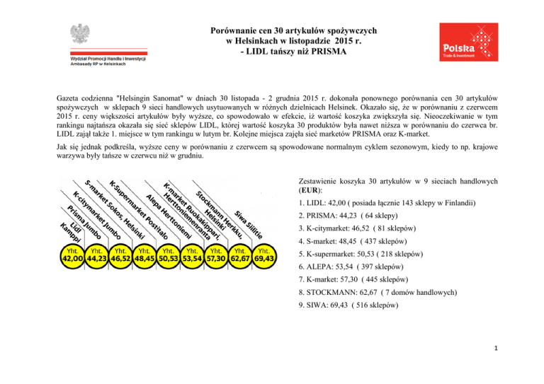Porównanie cen 30 artykułów spożywczych w Helsinkach w listopadzie 2015 r. - LIDL tańszy niż PRISMA Gazeta codzienna "Helsingin Sanomat" w dniach 30 listopada - 2 grudnia 2015 r. dokonała ponownego porównania cen 30 artykułów spożywczych w sklepach 9 sieci handlowych usytuowanych w różnych dzielnicach Helsinek. Okazało się, że w porównaniu z czerwcem 2015 r. ceny większości artykułów były wyższe, co spowodowało w efekcie, iż wartość koszyka zwiększyła się. Nieoczekiwanie w tym rankingu najtańsza okazała się sieć sklepów LIDL, której wartość koszyka 30 produktów była nawet niższa w porównaniu do czerwca br. LIDL zajął także 1. miejsce w tym rankingu w lutym br. Kolejne miejsca zajęła sieć marketów PRISMA oraz K-market. Jak się jednak podkreśla, wyższe ceny w porównaniu z czerwcem są spowodowane normalnym cyklem sezonowym, kiedy to np. krajowe warzywa były tańsze w czerwcu niż w grudniu. Zestawienie koszyka 30 artykułów w 9 sieciach handlowych (EUR): 1. LIDL: 42,00 ( posiada łącznie 143 sklepy w Finlandii) 2. PRISMA: 44,23 ( 64 sklepy) 3. K-citymarket: 46,52 ( 81 sklepów) 4. S-market: 48,45 ( 437 sklepów) 5. K-supermarket: 50,53 ( 218 sklepów) 6. ALEPA: 53,54 ( 397 sklepów) 7. K-market: 57,30 ( 445 sklepów) 8. STOCKMANN: 62,67 ( 7 domów handlowych) 9. SIWA: 69,43 ( 516 sklepów) 1 62,67 (59,04) Stockmann 50,53 (49,50) KSupermarke t S-market 48,45 (47,65) 46,52 (45,69) 42,00 (43,84) Lidl Kcitymarket Nazwa sieci handlowych Prisma Wartość koszyka 30 produktów (w nawiasie wartość koszyka w czerwcu 2015 r.) EUR 44,23 (41,29) Porównanie cen 30 artykułów spożywczych w Helsinkach w listopadzie 2015 r. - LIDL tańszy niż PRISMA 3,59 2,99 0,85 0,69 4,39 0,89 1,59 1,63 1,14 0,99 1,09 0,95 0,75 0,99 3,49 4,25 0,92 0,95 5,95 0,98 1,45 2,23 1,04 1,35 2,90 1,45 0,96 1,30 Cena (EUR) Mielone wołowe, 400 g Filety drobiowe 300 g Margaryna 400 g Mleko bez tłuszczu 1 l Ser żółty 1 kg Śmietana 15%, 2 dl Chleb żytni, 330 g Indyk piersi,200 g Pulpety, 360 g Sok pomarańczowy, 1 l Spaghetti, 1 kg Ryż dł.-z., 1 kg Pomidory w puszce, 500 g Keczup, 1 kg 2,94 2,98 0,59 0,62 3,94 0,59 0,97 1,79 0,89 0,71 1,05 0,92 0,66 0,89 2,85 2,93 0,40 0,65 4,75 0,43 0,95 1,75 0,66 0,58 0,72 0,81 0,59 0,79 3,19 2,63 0,75 0,62 3,95 0,79 1,39 1,63 1,07 0,99 1,55 0,92 0,69 0,95 3,59 2,99 0,69 0,79 4,49 0,59 0,98 2,19 0,99 0,99 1,09 1,19 0,66 1,15 2 Porównanie cen 30 artykułów spożywczych w Helsinkach w listopadzie 2015 r. - LIDL tańszy niż PRISMA Kawa, 500 g Coca cola, 1,5 l Pomidory krajowe, 1 kg Ogórki krajowe, 1 szt.= 333 g Ziemniaki krajowe, 1 kg Marchew, 500 g Cebula krajowa, 1 kg Kalafior, 500 g Czerwona papryka imp., 250 g Sałata, 100 g Bazylia Banany, 1 kg Pomarańcze, 1 kg Jabłka, 1 kg Mandarynki, 1 kg Winogrona zielone, 500 g 1,89 1,45 3,98 0,90 0,79 0,40 0,95 1,50 0,80 1,45 1,49 1,29 1,69 0,98 1,69 3,44 1,83 0,80 3,39 0,88 0,68 0,37 1,10 1,29 0,67 1,25 1,39 1,18 1,65 0,98 2,29 3,39 1,89 1,89 4,09 0,89 0,75 0,59 0,99 1,64 0,75 1,49 1,69 1,49 0,49 0,98 1,89 3,89 1,99 1,55 4,09 0,93 0,79 0,42 1,05 1,53 0,84 1,55 1,49 1,39 1,79 0,98 1,79 3,89 1,99 1,99 4,09 0,93 1,19 0,49 1,09 1,69 0,75 1,49 1,99 1,55 1,79 1,09 1,89 3,99 4,50 2,39 4,85 1,17 1,29 0,75 1,45 1,25 0,74 1,49 1,79 1,89 2,10 1,39 2,50 3,90 Helsinki, dn. 09.12.2015 r. 3
