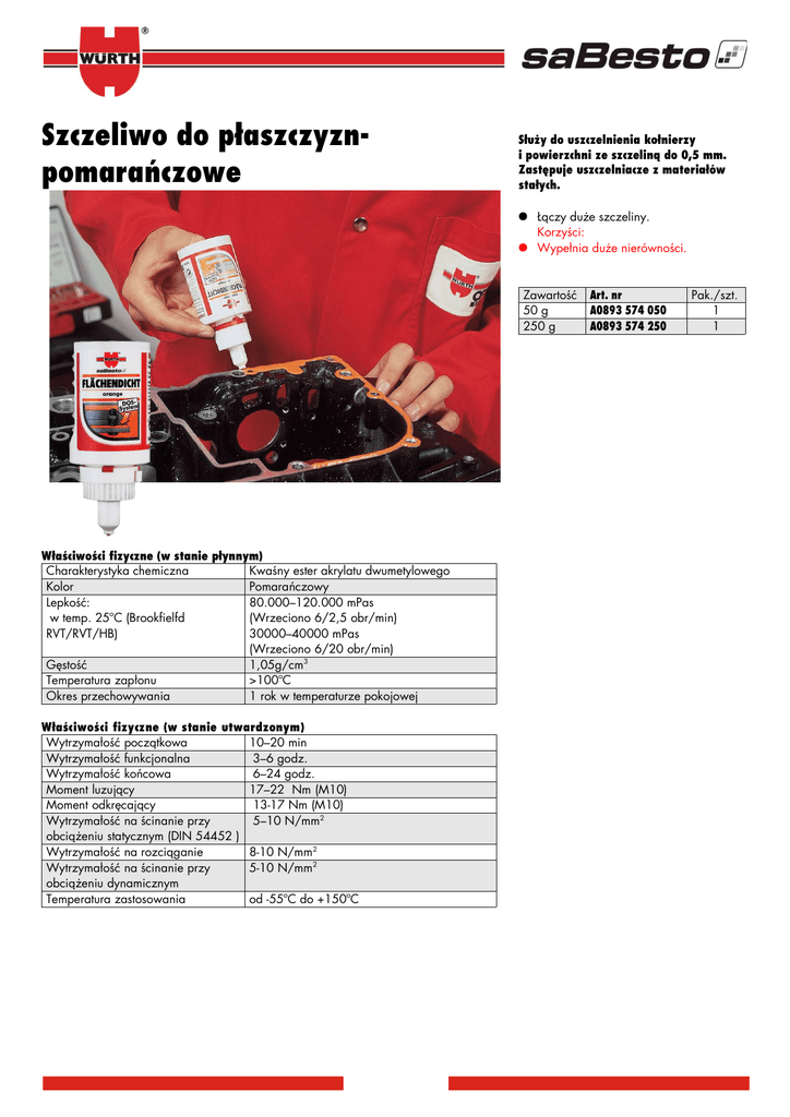 Szczeliwo do płaszczyznpomarańczowe Służy do uszczelnienia kołnierzy i powierzchni ze szczeliną do 0,5 mm. Zastępuje uszczelniacze z materiałów stałych. ● Łączy duże szczeliny. Korzyści: ● Wypełnia duże nierówności. Zawartość 50 g 250 g Właściwości fizyczne (w stanie płynnym) Charakterystyka chemiczna Kwaśny ester akrylatu dwumetylowego Kolor Pomarańczowy Lepkość: 80.000–120.000 mPas w temp. 25ºC (Brookfielfd (Wrzeciono 6/2,5 obr/min) RVT/RVT/HB) 30000–40000 mPas (Wrzeciono 6/20 obr/min) Gęstość 1,05g/cm3 Temperatura zapłonu >100ºC Okres przechowywania 1 rok w temperaturze pokojowej Właściwości fizyczne (w stanie utwardzonym) Wytrzymałość początkowa 10–20 min Wytrzymałość funkcjonalna 3–6 godz. Wytrzymałość końcowa 6–24 godz. Moment luzujący 17–22 Nm (M10) Moment odkręcający 13-17 Nm (M10) Wytrzymałość na ścinanie przy 5–10 N/mm2 obciążeniu statycznym (DIN 54452 ) Wytrzymałość na rozciąganie 8-10 N/mm2 Wytrzymałość na ścinanie przy 5-10 N/mm2 obciążeniu dynamicznym Temperatura zastosowania od -55ºC do +150ºC Art. nr A0893 574 050 A0893 574 250 Pak./szt. 1 1
