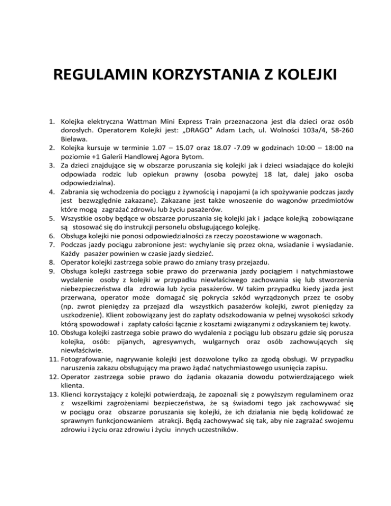 REGULAMIN KORZYSTANIA Z KOLEJKI 1. Kolejka elektryczna Wattman Mini Express Train przeznaczona jest dla dzieci oraz osób dorosłych. Operatorem Kolejki jest: „DRAGO” Adam Lach, ul. Wolności 103a/4, 58-260 Bielawa. 2. Kolejka kursuje w terminie 1.07 – 15.07 oraz 18.07 -7.09 w godzinach 10:00 – 18:00 na poziomie +1 Galerii Handlowej Agora Bytom. 3. Za dzieci znajdujące się w obszarze poruszania się kolejki jak i dzieci wsiadające do kolejki odpowiada rodzic lub opiekun prawny (osoba powyżej 18 lat, dalej jako osoba odpowiedzialna). 4. Zabrania się wchodzenia do pociągu z żywnością i napojami (a ich spożywanie podczas jazdy jest bezwzględnie zakazane). Zakazane jest także wnoszenie do wagonów przedmiotów które mogą zagrażać zdrowiu lub życiu pasażerów. 5. Wszystkie osoby będące w obszarze poruszania się kolejki jak i jadące kolejką zobowiązane są stosować się do instrukcji personelu obsługującego kolejkę. 6. Obsługa kolejki nie ponosi odpowiedzialności za rzeczy pozostawione w wagonach. 7. Podczas jazdy pociągu zabronione jest: wychylanie się przez okna, wsiadanie i wysiadanie. Każdy pasażer powinien w czasie jazdy siedzieć. 8. Operator kolejki zastrzega sobie prawo do zmiany trasy przejazdu. 9. Obsługa kolejki zastrzega sobie prawo do przerwania jazdy pociągiem i natychmiastowe wydalenie osoby z kolejki w przypadku niewłaściwego zachowania się lub stworzenia niebezpieczeństwa dla zdrowia lub życia pasażerów. W takim przypadku kiedy jazda jest przerwana, operator może domagać się pokrycia szkód wyrządzonych przez te osoby (np. zwrot pieniędzy za przejazd dla wszystkich pasażerów kolejki, zwrot pieniędzy za uszkodzenie). Klient zobowiązany jest do zapłaty odszkodowania w pełnej wysokości szkody którą spowodował i zapłaty całości łącznie z kosztami związanymi z odzyskaniem tej kwoty. 10. Obsługa kolejki zastrzega sobie prawo do wydalenia z pociągu lub obszaru gdzie się porusza kolejka, osób: pijanych, agresywnych, wulgarnych oraz osób zachowujących się niewłaściwie. 11. Fotografowanie, nagrywanie kolejki jest dozwolone tylko za zgodą obsługi. W przypadku naruszenia zakazu obsługujący ma prawo żądać natychmiastowego usunięcia zapisu. 12. Operator zastrzega sobie prawo do żądania okazania dowodu potwierdzającego wiek klienta. 13. Klienci korzystający z kolejki potwierdzają, że zapoznali się z powyższym regulaminem oraz z wszelkimi zagrożeniami bezpieczeństwa, że są świadomi tego jak zachowywać się w pociągu oraz obszarze poruszania się kolejki, że ich działania nie będą kolidować ze sprawnym funkcjonowaniem atrakcji. Będą zachowywać się tak, aby nie zagrażać swojemu zdrowiu i życiu oraz zdrowiu i życiu innych uczestników.