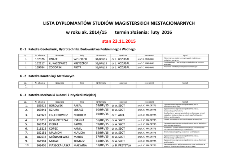 LISTA DYPLOMANTÓW STUDIÓW MAGISTERSKICH NIESTACJONARNYCH w roku ak. 2014/15 termin złożenia: luty 2016 stan 23.11.2015 K - 1 Katedra Geotechniki, Hydrotechniki, Budownictwa Podziemnego i Wodnego Lp. 1. 2. 3. Nr albumu 162326 162117 169764 Nazwisko KNAFEL ŁUKASZEWICZ ZOGÓRSKI Imię WOJCIECH KRZYSZTOF PIOTR Nr tematu 34/BPI/15 33/BPI/15 35/BPI/15 opiekun dr J. KOZUBAL dr J. KOZUBAL dr J. KOZUBAL recenzent prof. K. MYŚLECKI prof. C. MADRYAS prof. C. MADRYAS tytuł Trójwymiarowy model numeryczny pala iniekcyjnego z kontaktem rozmytym Projekt parkingu - pod istniejącym budynkiem w centrum Wrocławia Podziemny żelbetowy wodny zbiornik retencyjny K - 2 Katedra Konstrukcji Metalowych Lp. Nr albumu Nazwisko Imię Nr tematu opiekun Nr tematu opiekun recenzent temat 1. K - 3 Katedra Mechaniki Budowli i Inżynierii Miejskiej Lp. Nr albumu Nazwisko Imię prof. C. MADRYAS NIKODEM JOANNA PAWEŁ KAMIL KLAUDIA MAREK TOMASZ MALWINA 56/BPI/15 59/BPI/15 73/BPI/15 55/BPI/15 57/BPI/15 61/BPI/15 51/BPI/15 prof. C. MADRYAS 189516 BOROWSKI 169841 DZIURA RAFAŁ ŁUKASZ 3. 143923 EGLENTOWICZ 4. 5. 6. 7. 8. 9. 10. 216216 169754 216215 182151 182634 161984 169406 GZYL-PIETRZAK KIERAT KOPEĆ MALMON MIŚNIAKIEWICZ MULAK PIASECKA-LASKA recenzent 58/BPI/15 dr A. SZOT 60/BPI/15 dr A. SZOT 69/BPI/15 dr T. ABEL 1. 2. dr A. SZOT dr A. SZOT dr A. SZOT dr A. SZOT dr A. SZOT dr A. SZOT dr B. PRZYBYŁA prof. C. MADRYAS prof. C. MADRYAS prof. C. MADRYAS prof. C. MADRYAS prof. C. MADRYAS prof. C. MADRYAS prof. C. MADRYAS prof. C. MADRYAS temat Zagospodarowanie przestrzeni podziemnej pod Pl. Powstańców Warszawy Zagospodarowanie przestrzeni podziemnej przy ul. Karkonoskiej we Wrocławiu Kanał sanitarny wykonany metodą bezwykopową w ramach rozbudowy sieci wod.-kan. na osiedlu Lipa Piotrkowska i Widawa we Wrocławiu Zbiornik retencyjny na sieci kanalizacyjnej w Nowej Soli Zagospodarowanie przestrzeni podziemnej przy ul. Kazimierza Wielkiego we Wrocławiu Przebudowa systemu podziemnych przejść podziemnych w ramach Pl. Dominikańskiego we Wrocławiu Zmechanizowany parking podziemny we Wrocławiu Zagospodarowanie przestrzeni podziemnej przy ul. Wróblewskiego we Wrocławiu Zagospodarowanie przestrzeni podziemnej przy ul. Kościuszki we Wrocławiu Dwukondygnacyjny, wielostanowiskowy garaż podziemny w rejonie ul. Hoyene-Wrońskiego we Wrocławiu K - 4 Katedra Mostów i Kolei Lp. 1. 2. 3. 4. 5. 6. Nr albumu 174862 173998 169819 151829 176904 182193 Nazwisko ILASZ INGLOT JANDUŁA KOZICA TWORZYDŁO WRÓBEL Imię PAULINA MONIKA PAULINA RADOSŁAW RAFAŁ PATRYK Nr tematu 84/BPI/15 85/BPI/15 83/BPI/15 81/BPI/15 82/BPI/15 80/BPI/15 opiekun recenzent temat Rewitalizacja i modernizacja linii nr 315 Malczyce - Jawor. Etap 1: Malczyce – Wądroże Wielkie Modernizacja wiaduktu drogowego w ciągu DK3 nad linią kolejową nr 311 Jelenia Góra – Jakuszyce Modernizacja bazy sprzętowo-transportowej dr R. MAZURKIEWICZ prof. D. BRYJA dr M. HILDEBRAND prof. Cz. MACHELSKI dr R. MAZURKIEWICZ prof. D. BRYJA dr I. GISTEREK dr I. GISTEREK dr I. GISTEREK prof. D. BRYJA Modernizacja północnej głowicy stacji Międzylesie prof. D. BRYJA Podniesienie kategorii linii kolejowej 326 prof. D. BRYJA Modernizacja południowej głowicy stacji Międzylesie Z - 1 Zakład Budownictwa Ogólnego Lp. 1. Nr albumu Nazwisko Imię opiekun recenzent temat dr hab. K. SCHABOWICZ zmiana recenzenta Niski budynek mieszkalny z funkcją medyczną na parterze dr Z. MATKOWSKI Renowacja balkonów, tarasów i parkingów nad piwnicami prof. E. HOTAŁA RADOSŁAW 43/BTO/14 dr Z. MATKOWSKI dr hab. K. SCHABOWICZ zmiana recenzenta 211696 WATEMBORSKI WIKTOR 42/BTO/14 dr Z. MATKOWSKI prof. J. HOŁA 169870 ZIELIŃSKI ADAM 13/BTO/15 dr R. ANTONOWICZ prof. J. JASIEŃKO Metody rozbudowy przemysłowych hal stalowych z lekkimi suwnicami Ocena rozwiązań technologiczno-materiałowych robót wykończeniowych w pomieszczeniach czystych w obiektach opieki medycznej Analiza techniczno-ekonomiczna rozwiązań izolacji przeciwwodnych i przeciwwilgociowych w budynku wielorodzinnym z parkingiem podziemnym i tarasami Drewno egzotyczne w budownictwie ogólnym RYSZARD MARCIN ADAM 147779 NIEDZIELSKI 5. 6. 2. 3. 4. Nr tematu 46/BTO/14 dr Ł. SADOWSKI 34/BTO/14 prof. B. STAWISKI 100/KBU/14 dr A. KLIMEK 124928 CZERNIAK 165993 FRANCZAK 169869 KAPROŃ Z - 2 Zakład Dróg i Lotnisk Lp. 1. Nr albumu Nazwisko 167084 KULESZA Imię ALBERT Nr tematu opiekun 86/BPI/15 dr J. KUŹNIEWSKI recenzent prof. A. SZYDŁO temat Modernizacja skrzyżowania w wybranej miejscowości Z - 3 Zakład Fizyki Budowli i Komputerowych Metod Projektowania Lp. 1. 2. Nr albumu Nazwisko Imię Nr tematu opiekun recenzent 147650 GOLUS PRZEMYSŁAW 43/BTO/15 dr J. SZOŁOMICKI prof. A. UBYSZ 169853 KOŚCIARZ JACEK 31/BTO/15 dr G. DMOCHOWSKI prof. Z. HEJDUCKI temat Analiza konstrukcyjna budynku salonu sprzedaży samochodów z warsztatem naprawczym Analiza możliwości wykonania izolacji przeciwwodnej w dwukondygnacyjnym garażu podziemnym pod kątem technicznym i finansowym 3. 166966 SUCHECKI MICHAŁ 60/BTO/14 dr K. MARSZAŁEK prof. H. NOWAK zmiana recenzenta Uwarunkowania projektowo-wykonawcze jednorodzinnych domów pasywnych Z - 4 Zakład Konstrukcji Betonowych Lp. 1. 2. Nr albumu Nazwisko 162237 BOBROWSKI 172494 ŚLUSARCZYK Imię BARTOSZ MARCIN Nr tematu opiekun 56/BTO/15 dr W. PAWLAK 49/BTO/15 dr A. ŁODO recenzent temat prof. A. UBYSZ Technologia białej wanny prof. A. UBYSZ Produkcja żerdzi strunobetonowych z betonu wirowanego Z - 5 Zakład Materiałów Budowlanych, Konstrukcji Drewnianych i Zabytkowych Lp. Nr albumu Nazwisko Imię Nr tematu opiekun dr M. PIECHÓWKAMIELNIK 1. 154689 ADAMCZYK DOMINIKA 79/BTO/14 2. 3. 154431 ANTCZAK PATRYK 65/BTO/14 dr Ł. BEDNARZ 166249 WAIS MAŁGORZATA 4. 164445 WIĄZOWSKA ANNA dr M. PIECHÓWKA- 80/BTO/14 MIELNIK 114/BTO/15 dr D. LOGOŃ recenzent prof. J. HOŁA prof. J. JASIEŃKO temat Specyfikacja, kontrola zgodności i produkcji betonów w świetle norm Analiza stanu, propozycja technologii monito