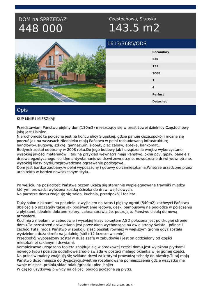 DOM na SPRZEDAŻ 448 000 Częstochowa, Słupska 143.5 m2 1613/3685/ODS Secondary 530 133 2008 1 4 Perfect Detached Opis KUP MNIE I MIESZKAJ! Przedstawiam Państwu piękny dom(130m2) mieszczący się w prestiżowej dzielnicy Częstochowy jaką jest Lisiniec. Nieruchomość ta położona jest na końcu ulicy Słupskiej, gdzie panuje cisza,spokój i można się poczuć jak na wczasach.Niedaleko mają Państwo w pełni rozbudowaną infrastrukturę handlowo-usługową, szkołę, gimnazjum, żłobek, plac zabaw, aptekę, bankomat.. Budynek został odebrany w 2008 roku.Do jego budowy jak i urządzenia wnętrz wykorzystano wysokiej jakości materiałów. I tak na przykład wewnątrz mają Państwo..okna pcv, gipsy, panele z drzewa egzotycznego, solidne antywłamaniowe drzwi zewnętrzne, nowoczesne drzwi wewnętrzne, wysokiej klasy płytki,rozprowadzone ogrzewanie podłogowe.. Dom jest bardzo zadbany,w pełni wyposażony i gotowy do zamieszkania.Wnętrze urządzone przez architekta w bardzo nowoczesnym stylu. Po wejściu na posiadłość Państwa oczom ukażą się starannie wypielęgnowane trawniki między którymi prowadzi wyłożona kostką ścieżka do drzwi wejściowych. Na parterze domu znajduję się salon, kuchnia, przedpokój i toaleta. Duży salon z oknami na południe, z wyjściem na taras i piękny ogród (540m2) zachwyci Państwa dbałością o szczegóły takie jak podświetlenie ledowe, deski bambusowe na podłodze w połączeniu z płytkami, idealnie dobrane kolory..całość sprawia że, poczują tu Państwo ciepłą domową atmosferę. Kuchnia z meblami w zabudowie i wysokiej klasy sprzętem AGD położona jest po drugiej stronie domu.Ta przestrzeń doświetlana jest przez okna wychodzące na dwie strony świata.. północ i zachód.Tutaj mogą Państwo w spokoju zjeść posiłek również w większym gronie gdyż została wydzielona duża strefa na jadalnię (stół+12 krzeseł w cenie). Przedpokój wyposażony został w dużą szafę w zabudowie i jest on oddzielony od części mieszkalnej szklanymi drzwiami. Kompleksowo urządzona toaleta znajduje się w środkowej części domu,jest wyłożona płytkami nowego typu i posiada dodatkowe źródło światła w postaci małego okienka w jej górnej części. Na przeciw toalety znajdują się szklane drzwi za którymi prowadzą schody do piwnicy.Tutaj mają Państwo dużo miejsca do dyspozycji,świetnie rozplanowane pomieszczenia gdzie wszystko ma swoje miejsce..pralnia,skład miału/groszku,piec ,bojler. W części użytkowej piwnicy na całości podłóg położone są płytki. freedom nieruchomości sp. z o.o. sp. k. Na piętro domu wchodzą Państwo po podświetlanych , dębowych schodach. Tutaj w przyjemnej kolorystyce urządzone są 3 sypialnie i łazienka. 2 pokoje posiadają wyjście na balkon, w tym większy z nich dodatkowo ma wydzieloną garderobę Każde pomieszczenie zagospodarowane bardzo praktycznie z zarazem gustownie,wszystko ma tu swoje miejsce i przeznaczenie. Jeśli chodzi o łazienkę to jest to miejsce w którym będą mogli się Państwo zrelaksować po całym dniu mając do wyboru pobyt pod prysznicem czy też w dużej wannie.Wielkim atutem jest tutaj okno w części spadowej dachu które za dnia świetnie doświetla a nocą ozdabia..bo przecież któż nie chciałby relaksować się w wannie spoglądając na gwieździste niebo:) Ten dom ma jeszcze wiele zalet,nie sposób wszystkich wymienić ale niewątpliwie do największych należą;świetnie zagospodarowana przestrzeń wokół domu, garaż z bramą wjazdową na pilota, wypielęgnowany ogród, eko - oczyszczalnia, strych ocieplony wełną i użytkowy jako obszerny skład oraz monitoring zewnętrzny. Gorąco zapraszam do obejrzenia tej nieruchomości w każdą środę po uprzednim kontakcie telefonicznym. Kalina Radomska 532 635 085 "Właścicielem ogłoszenia wraz z jej elementami jest Freedom Nieruchomości Sp. z o.o. Sp. k. lub podmioty współpracujące. Wszelkie prawa zastrzeżone. Kopiowanie, rozpowszechnianie oraz korzystanie z niniejszych materiałów w jakikolwiek inny sposób wykraczający poza dozwolony użytek określony przepisami ustawy z 4 lutego 1994 r. o prawie autorskim i prawach pokrewnych (Dz. U. 1994, nr 24 poz. 83 z późn. zm.) bez pisemnej zgody Freedom Nieruchomości Sp. z o.o. Sp. k. lub podmiotów współpracujących jest zabronione i może stanowić podstawę odpowiedzialności cywilnej oraz karnej. Ponadto niniejsze materiały stanowią tajemnicę przedsiębiorstwa Freedom Nieruchomości Sp. z o.o. Sp. k. lub podmiotów współpracujących w rozumieniu ustawy z dnia 16 kwietnia 1993 r. o zwalczaniu nieuczciwej konkurencji (Dz. U. z 2003 r., Nr 153, poz. 1503 z późn. zm.). Niniejsze ogłoszenie nie stanowi oferty w rozumieniu Kodeksu Cywilnego, lecz ma charakter informacyjny." Kalina Radomska tel. 532635085 email: [email protected] freedom nieruchomości sp. z o.o. sp. k. Powered by TCPDF (www.tcpdf.org)