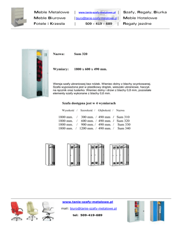 Meble Metalowe | www.tanie-szafy-metalowe.pl | Szafy, Regały, Biurka Meble Biurowe | [email protected] | Meble Hotelowe Fotele i Krzesła | Regały jezdne 509 – 419 – 689 Nazwa: Sum 320 Wymiary: 1800 x 600 x 490 mm. | Wersja szafy ubraniowej bez nóŜek. Wieniec dolny z blachy ocynkowanej. Szafa wyposaŜona jest w plastikowy drąŜek, wieszaki ubraniowe, haczyk na ręcznik oraz lusterko. Wieniec dolny i drzwi z blachy 0,8 mm, pozostałe elementy szafy wykonane z blachy 0,6 mm. Szafa dostępna jest w 4 wymiarach Wysokość / Szerokość / 1800 mm. / 300 mm. / 1800 mm. / 600 mm. / 1800 mm. / 900 mm. / 1800 mm. / 1200 mm. / Głębokość / Nazwa 490 mm 490 mm. 490 mm. 490 mm. Sum 310 Sum 320 Sum 330 Sum 340 / / / / www.tanie-szafy-metalowe.pl mail: [email protected] tel: 509-419-689
