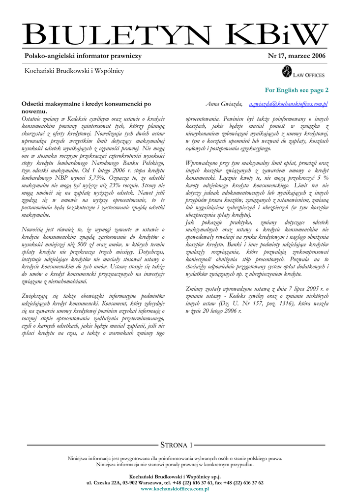 Polsko-angielski informator prawniczy Nr 17, marzec 2006 Kochański Brudkowski i Wspólnicy For English see page 2 Odsetki maksymalne i kredyt konsumencki po nowemu. Ostatnie zmiany w Kodeksie cywilnym oraz ustawie o kredycie konsumenckim powinny zainteresować tych, którzy planują skorzystać z oferty kredytowej. Nowelizacja tych dwóch ustaw wprowadza przede wszystkim limit dotyczący maksymalnej wysokości odsetek wynikających z czynności prawnej. Nie mogą one w stosunku rocznym przekraczać czterokrotności wysokości stopy kredytu lombardowego Narodowego Banku Polskiego, tzw. odsetki maksymalne. Od 1 lutego 2006 r. stopa kredytu lombardowego NBP wynosi 5,75%. Oznacza to, że odsetki maksymalne nie mogą być wyższe niż 23% rocznie. Strony nie mogą umówić się na zapłatę wyższych odsetek. Nawet jeśli zgodzą się w umowie na wyższe oprocentowanie, to te postanowienia będą bezskuteczne i zastosowanie znajdą odsetki maksymalne. Nowością jest również to, że wymogi zawarte w ustawie o kredycie konsumenckim znajdą zastosowanie do kredytów o wysokości mniejszej niż 500 zł oraz umów, w których termin spłaty kredytu nie przekracza trzech miesięcy. Dotychczas, instytucje udzielające kredytów nie musiały stosować ustawy o kredycie konsumenckim do tych umów. Ustawę stosuje się także do umów o kredyt konsumencki przeznaczonych na inwestycje związane z nieruchomościami. Zwiększają się także obowiązki informacyjne podmiotów udzielających kredyt konsumencki. Konsument, który zdecyduje się na zawarcie umowy kredytowej powinien uzyskać informację o rocznej stopie oprocentowania zadłużenia przeterminowanego, czyli o karnych odsetkach, jakie będzie musiał zapłacić, jeśli nie spłaci kredytu na czas, a także o warunkach zmiany tego Anna Gwiazda, [email protected] oprocentowania. Powinien być także poinformowany o innych kosztach, jakie będzie musiał ponieść w związku z niewykonaniem zobowiązań wynikających z umowy kredytowej, w tym o kosztach upomnień lub wezwań do zapłaty, kosztach sądowych i postępowania egzekucyjnego. Wprowadzono przy tym maksymalny limit opłat, prowizji oraz innych kosztów związanych z zawarciem umowy o kredyt konsumencki. Łącznie kwoty te, nie mogą przekroczyć 5 % kwoty udzielonego kredytu konsumenckiego. Limit ten nie dotyczy jednak udokumentowanych lub wynikających z innych przepisów prawa kosztów, związanych z ustanowieniem, zmianą lub wygaśnięciem zabezpieczeń i ubezpieczeń (w tym kosztów ubezpieczenia spłaty kredytu). Jak pokazuje praktyka, zmiany dotyczące odsetek maksymalnych oraz ustawy o kredycie konsumenckim nie spowodowały rewolucji na rynku kredytowym i nagłego obniżenia kosztów kredytu. Banki i inne podmioty udzielające kredytów znalazły rozwiązania, które pozwalają zrekompensować konieczność obniżenia stóp procentowych. Pozwala na to chociażby odpowiednio przygotowany system opłat dodatkowych i wydatków związanych np. z ubezpieczeniem kredytu. Zmiany zostały wprowadzone ustawą z dnia 7 lipca 2005 r. o zmianie ustawy - Kodeks cywilny oraz o zmianie niektórych innych ustaw (Dz. U. Nr 157, poz. 1316), która weszła w życie 20 lutego 2006 r. STRONA 1 Niniejsza informacja jest przygotowana dla poinformowania wybranych osób o stanie polskiego prawa. Niniejsza informacja nie stanowi porady prawnej w konkretnym przypadku. Kochański Brudkowski i Wspólnicy sp.j. ul. Czeska 22A, 03-902 Warszawa, tel. +48 (22) 616 37 61, fax +48 (22) 616 37 62 www.kochanskioffices.com.pl Polish-English Legal Magazine No. 17, March 2006 Kochański Brudkowski i Wspólnicy Polska wersja na stronie 1 Maximum interest and consumer credit. Recent changes in the Civil Code and the Act on Consumer Credit should be interesting for those who plan to use a crediting offer. The amendment of those two acts implements a maximum limit of interest resulting from legal acts. It can not exceed fourfold of the amount of lombard rate of the National Bank of Poland, i.e. maximum interest. Since 1st of February 2006 NBP lombard rate amounts 5,75%. It means that the maximum interest can not be higher than 23% annually. Parties of the legal act can not agree to pay higher interest. Even if they agree on higher interest, those contractual provisions will be ineffective and maximum interest shall apply. It is a novelty that obligations provided in the Act on Consumer Credit will apply for credits lower than 500 PLN as well as contracts with the payment period shorter than three months. Until now institutions granting credits were not obliged to apply provisions of the Act on Consumer Credit for those credit contracts. The Act should also apply for consumer credit contract intended for property investments. Informative obligations of the entities offering consumer credits will also increase. A consumer who will decide to conclude a credit contract should be informed of annual interest rate of overdue payment, i.e. penalty interest, which it will be obliged to pay in case it fails to pay the credit rate on time, as well as of the Anna Gwiazda, [email protected] conditions of changing this interests. The Consumer should also be informed of other costs imposed on him in relation to the failure of the contractual obligations, including costs of warning or call for payment, court costs and enforcement proceeding costs. Maximum limit of fee, commission or other costs connected with conclusion of the consumer credit was also implemented. Total limit of those costs can not exceed 5% of the amount of consumer credit. Limit does not encumber costs which are documented or result from legal provisions concerning establishing, changes or expiration of securities and insurances (including costs of credit insurance). As it is shown in practice , the changes concerning maximum interest or the Act on Consumer Credit did not result in any revolution on a credit market or a sudden decrease of credit costs. Banks and othe