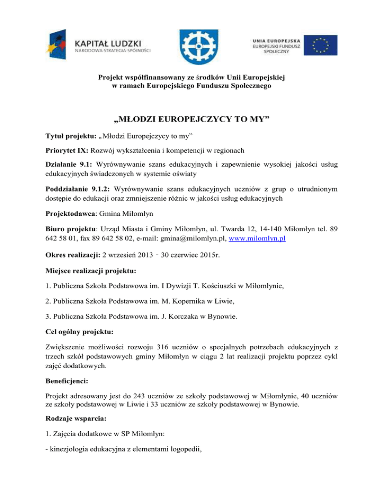 Projekt współfinansowany ze środków Unii Europejskiej w ramach Europejskiego Funduszu Społecznego „MŁODZI EUROPEJCZYCY TO MY” Tytuł projektu: „Młodzi Europejczycy to my” Priorytet IX: Rozwój wykształcenia i kompetencji w regionach Działanie 9.1: Wyrównywanie szans edukacyjnych i zapewnienie wysokiej jakości usług edukacyjnych świadczonych w systemie oświaty Poddziałanie 9.1.2: Wyrównywanie szans edukacyjnych uczniów z grup o utrudnionym dostępie do edukacji oraz zmniejszenie różnic w jakości usług edukacyjnych Projektodawca: Gmina Miłomłyn Biuro projektu: Urząd Miasta i Gminy Miłomłyn, ul. Twarda 12, 14-140 Miłomłyn tel. 89 642 58 01, fax 89 642 58 02, e-mail: [email protected], www.milomlyn.pl Okres realizacji: 2 wrzesień 2013 – 30 czerwiec 2015r. Miejsce realizacji projektu: 1. Publiczna Szkoła Podstawowa im. I Dywizji T. Kościuszki w Miłomłynie, 2. Publiczna Szkoła Podstawowa im. M. Kopernika w Liwie, 3. Publiczna Szkoła Podstawowa im. J. Korczaka w Bynowie. Cel ogólny projektu: Zwiększenie możliwości rozwoju 316 uczniów o specjalnych potrzebach edukacyjnych z trzech szkół podstawowych gminy Miłomłyn w ciągu 2 lat realizacji projektu poprzez cykl zajęć dodatkowych. Beneficjenci: Projekt adresowany jest do 243 uczniów ze szkoły podstawowej w Miłomłynie, 40 uczniów ze szkoły podstawowej w Liwie i 33 uczniów ze szkoły podstawowej w Bynowie. Rodzaje wsparcia: 1. Zajęcia dodatkowe w SP Miłomłyn: - kinezjologia edukacyjna z elementami logopedii, Projekt współfinansowany ze środków Unii Europejskiej w ramach Europejskiego Funduszu Społecznego - integracja sensoryczna z elementami korektywy, - język angielski, - zajęcia europejskie „Młody Europejczyk”, - muzykoterapia, - zajęcia muzyczne „Ja też chcę zagrać jak Chopin”, - zajęcia rytmiczno-muzyczne, - zajęcia manualne, - zajęcia „Wędrówka z bajką po Unii”, - szkolny radiowęzeł, - zajęcia humanistyczne „Koło Miłośników Kultury”, - zajęcia humanistyczne „Klub Młodych Twórców”, - zajęcia humanistyczne „Podróż przez świat z książką za pan brat”, - zajęcia szachowe. 2. Zajęcia dodatkowe w SP Liwa: - kinezjologia edukacyjna z elementami logopedii, - integracja sensoryczna z elementami korektywy, - język angielski, - zajęcia europejskie „Młody Europejczyk”. 3. Zajęcia dodatkowe w SP Bynowo: - kinezjologia edukacyjna z elementami logopedii, - integracja sensoryczna z elementami korektywy, - język angielski, - zajęcia europejskie „Młody Europejczyk”, - zajęcia matematyczne, - astronomia, - komputery dla uzdolnionych. Na wdrażanie projektu „Młodzi Europejczycy to my” Gmina Miłomłyn otrzymała dofinansowanie z Programu Operacyjnego Kapitał Ludzki w kwocie 971 786,96 zł. Wsparciem zostaną objęci uczniowie klas 0-VI szkół podstawowych z terenu miasta i gminy Miłomłyn, uczniowie zdolni, dzieci z wadami wymowy, z zaburzeniami uwagi, z trudnościami w czytaniu i pisaniu, z zaburzeniami integracji sensorycznej, z wadami postawy, uczniowie z wyraźnym deficytem umiejętności manualnych i deficytem w motoryce małej, dzieci z zaburzeniami emocjonalnymi i problemami w kontaktach społecznych. Zajęcia będą obejmowały łącznie 34 tygodnie w ciągu 2 lat szkolnych z wyłączeniem wakacji. Projekt współfinansowany ze środków Unii Europejskiej w ramach Europejskiego Funduszu Społecznego Oprócz zajęć dla uczestników organizowane będą wyjazdy studyjne, m.in. do Centrum Nauki „Kopernik” w Warszawie, do planetarium w Olsztynie i w Toruniu, do teatru i kina w Elblągu i w Olsztynie. Rekrutacja do projektu odbywać się będzie corocznie i przeprowadzana będzie przez szkolny zespół rekrutacyjny w każdej ze szkół. Na zakończenie każdy uczeń otrzyma dyplom uczestnictwa w projekcie „Młodzi Europejczycy to my.” Szkoły objęte wsparciem zostaną wyposażona w nowoczesny sprzęt oraz dodatkowe materiały dydaktyczne. W projekcie przewidziany jest transport uczniów z zajęć do domu. Osoba do kontaktu: Koordynator ds. merytorycznych Dorota Wójcicka tel. 89 642 58 24 e-mail: [email protected]