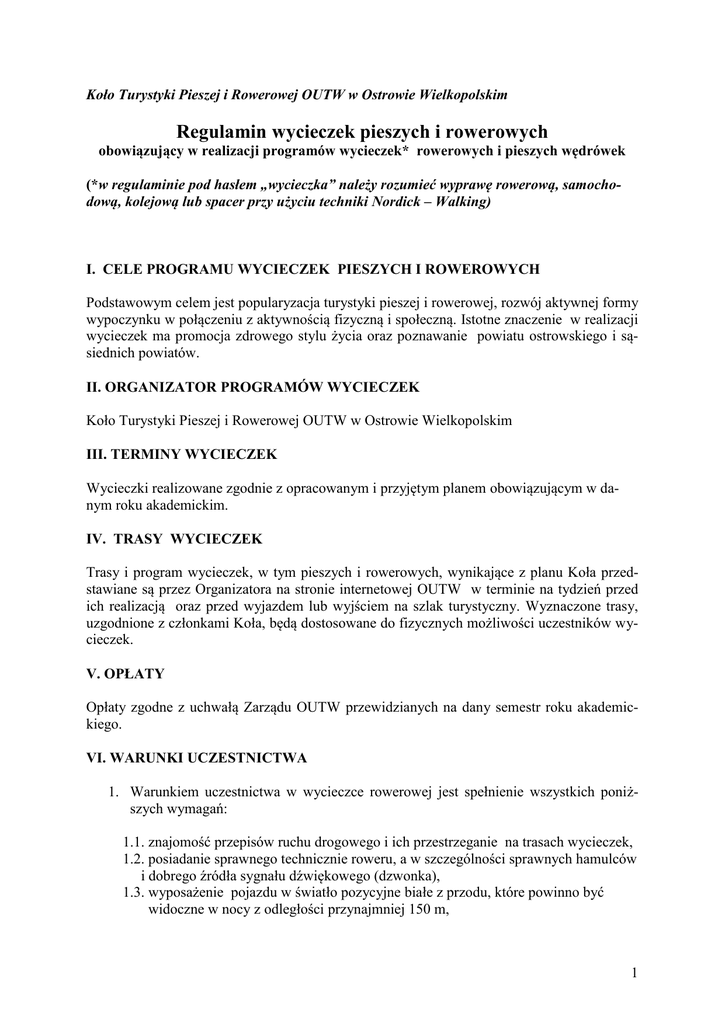 Regulamin Koła Turystyki Pieszej i Rowerowej OUTW w Ostrowie