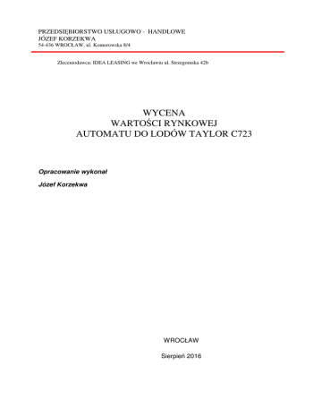 PRZEDSIĘBIORSTWO USŁUGOWO - HANDLOWE JÓZEF KORZEKWA 54-436 WROCŁAW, ul. Komorowska 8/4 Zleceniodawca: IDEA LEASING we Wrocławiu ul. Strzegomska 42b WYCENA WARTOŚCI RYNKOWEJ AUTOMATU DO LODÓW TAYLOR C723 Opracowanie wykonał Józef Korzekwa WROCŁAW Sierpień 2016 2 WYCENA WARTOŚCI RYNKOWEJ AUTOMATU DO LODÓW 1.Podstawa formalna Podstawą opracowania opinii technicznej jest zlecenie IDEA LEASING S.A. we Wrocławiu ul. Strzegomska 42b z dnia 28.07.2016 r. 2.Podstawa merytoryczna Merytoryczną podstawę opracowania stanowią: - Oferty handlowe firmy LGS Lodmar Gastro Solution Polska - Informacje o wyposażeniu i cenach strony internetowe 3.Cel opracowania Celem opracowania jest określenie stanu technicznego i ustalenie aktualnej wartości rynkowej automatu do produkcji lodów w związku z zamiarem jego zbycia. 4.Wizja lokalna W dniu 01.08.2016 r. dokonano oględzin oraz wykonano zdjęcia maszyny w miejscu jej składowania t.j. w magazynie Idea Leasing we Wrocławiu przy ul. Góralskiej 46. Informacji oraz pomocy przy oględzinach i próbach udzielili przedstawiciele Idea Leasing, który udostępnił także posiadane dokumenty. 5. Analiza wyników oględzin W wyniku oględzin ustalono następujące dane Automat do lodów Producent – TAYLOR - USA Typ C723 Nr – seryjny M2073533 Rok produkcji 2012 Moc zainstalowana 3,0 kW, 380-400V,50Hz. Układ dwusmakowy + mixt. dwa bunkry po 14 l. Automat posiada chłodzenie powietrzem, przystosowane do produkcji lodów dwusmakowych z możliwością miksowania Urządzenie sprawne, bez śladów uszkodzeń, zabrudzone wymaga dokładnego czyszczenia. Brak dźwigni do uruchamiania zawóru wersji mixt.