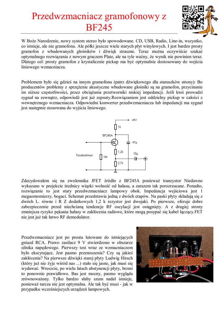 Przedwzmacniacz gramofonowy z BF245 W Boże Narodzenie, nowy system stereo było spowodowane. CD, USB, Radio, Line-in, wszystko, co istnieje, ale nie gramofonu. Ale półki jeszcze wiele starych płyt winylowych. I jest bardzo prosty gramofon z wbudowanych głośników i dźwięk straszne. Teraz można oczywiście szukać optymalnego rozwiązania z nowym graczem Plate, ale na tyle ważny, że wynik nie powinien teraz. Dlatego cel: prosty gramofon z krystalicznie pickup ma być optymalnie dostosowany do wejścia liniowego wzmacniacza. Problemem było się gdzieś na innym gramofonu (patrz dźwiękowego dla staruszków strony): Bo producentów problemy z sprzężenie akustyczne wbudowane głośniki są na gramofon, przycinanie im niższe częstotliwości, przez obciążania przetworniki niskiej impedancji. Jeśli ktoś prowadzi sygnał na zewnątrz, odpowiedź jest już zepsuty.Rozwiązaniem jest oddzielny pickup w całości z wewnętrznego wzmacniacza. Odpowiedni konwerter przedwzmacniacza lub impedancji ma sygnał jest następnie stosowana do wyjścia liniowego. Zdecydowałem się na zwolennika JFET źródło z BF245A ponieważ tranzystor Niedawno wykazano w projekcie średnicy wiązki wolność od hałasu, a zarazem tak porozrzucane. Ponadto, rozwiązanie to jest stary przedwzmacniacz lampowy obok. Impedancja wejściowa jest 1 megaomomierzy, bogaci. Schemat przedstawia jedną z dwóch etapów. Na paski płyty składają się z dwóch L. równe i R Z dodatkowych 1,2 k rezystor jest dwojaki. Po pierwsze, oferuje dobre zabezpieczenie przed niechcianą tendencje RF oscylacji jest osiągnięty. A z drugiej strony zmniejsza ryzyko pękania hałasy w zakłócenia radiowe, które mogą posypać się kabel łączący.FET nie jest już tak łatwo RF demodulator. Przedwzmacniacz jest po prostu lutowane do istniejących gniazd RCA. Prawo zasilacz 9 V stwierdzono w obszarze silnika napędowego. Pierwszy test wraz ze wzmacniaczem było ekscytujące. Jest pasmo przenoszenia? Czy są jakieś zakłócenia? Na pierwsze dźwięki starej płyty Ludwig Hirsch (który już nie żyje wśród nas ...) stało się jasne, jak musi się wydawać. Wreszcie, po wielu latach abstynencji płyty, brzmi to ponownie prawidłowo. Bas jest mocny, pasmo wygląda zrównoważony. Tylko bardzo słaby szum nadal istnieje, ponieważ tarcza nie jest optymalna. Ale tak być musi - jak w przypadku wcześniejszych urządzeń lampowych.