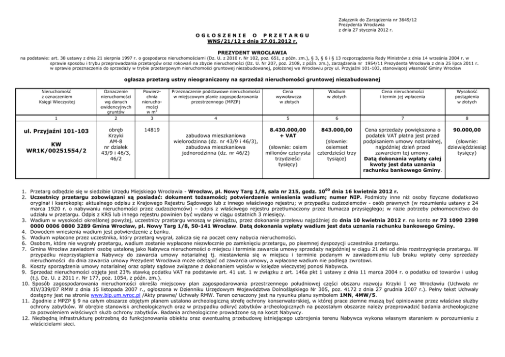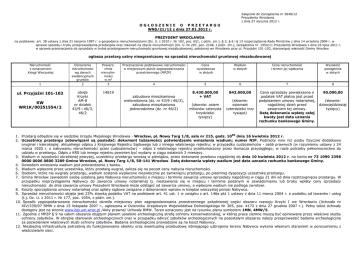 Załącznik do Zarządzenia nr 3649/12 Prezydenta Wrocławia z dnia 27 stycznia 2012 r. OGŁOSZENIE O PRZETARGU WNS/21/12 z dnia 27.01.2012 r. PREZYDENT WROCŁAWIA na podstawie: art. 38 ustawy z dnia 21 sierpnia 1997 r. o gospodarce nieruchomościami (Dz. U. z 2010 r. Nr 102, poz. 651, z późn. zm.), § 3, § 6 i § 13 rozporządzenia Rady Ministrów z dnia 14 września 2004 r. w sprawie sposobu i trybu przeprowadzania przetargów oraz rokowań na zbycie nieruchomości (Dz. U. Nr 207, poz. 2108, z późn. zm.), zarządzenia nr 1954/11 Prezydenta Wrocławia z dnia 25 lipca 2011 r. w sprawie przeznaczenia do sprzedaży w trybie przetargowym nieruchomości gruntowej niezabudowanej, położonej we Wrocławiu przy ul. Przyjaźni 101-103, stanowiącej własność Gminy Wrocław ogłasza przetarg ustny nieograniczony na sprzedaż nieruchomości gruntowej niezabudowanej Nieruchomość z oznaczeniem Księgi Wieczystej 1 ul. Przyjaźni 101-103 KW WR1K/00251554/2 Oznaczenie nieruchomości wg danych ewidencyjnych gruntów 2 Powierzchnia nieruchomości w m2 3 obręb Krzyki AM-8 nr działek 43/9 i 46/3, 46/2 14819 Przeznaczenie podstawowe nieruchomości w miejscowym planie zagospodarowania przestrzennego (MPZP) Cena wywoławcza w złotych Wadium w złotych Cena nieruchomości i termin jej wpłacenia Wysokość postąpienia w złotych 4 5 6 7 8 8.430.000,00 + VAT 843.000,00 Cena sprzedaży powiększona o podatek VAT płatna jest przed podpisaniem umowy notarialnej, najpóźniej dzień przed zawarciem tej umowy. Datą dokonania wpłaty całej kwoty jest data uznania rachunku bankowego Gminy. 90.000,00 zabudowa mieszkaniowa wielorodzinna (dz. nr 43/9 i 46/3), zabudowa mieszkaniowa jednorodzinna (dz. nr 46/2) (słownie: osiem milionów czterysta trzydzieści tysięcy) (słownie: osiemset czterdzieści trzy tysiące) (słownie: dziewięćdziesiąt tysięcy) 1. Przetarg odbędzie się w siedzibie Urzędu Miejskiego Wrocławia - Wrocław, pl. Nowy Targ 1/8, sala nr 215, godz. 1000 dnia 16 kwietnia 2012 r. 2. Uczestnicy przetargu zobowiązani są posiadać: dokument tożsamości; potwierdzenie wniesienia wadium; numer NIP. Podmioty inne niż osoby fizyczne dodatkowo oryginał i kserokopię: aktualnego odpisu z Krajowego Rejestru Sądowego lub z innego właściwego rejestru; w przypadku cudzoziemców - osób prawnych (w rozumieniu ustawy z 24 marca 1920 r. o nabywaniu nieruchomości przez cudzoziemców) – odpis z właściwego rejestru przetłumaczony przez tłumacza przysięgłego; w razie potrzeby pełnomocnictwo do udziału w przetargu. Odpis z KRS lub innego rejestru powinien być wydany w ciągu ostatnich 3 miesięcy. 3. Wadium w wysokości określonej powyżej, uczestnicy przetargu wnoszą w pieniądzu, przez dokonanie przelewu najpóźniej do dnia 10 kwietnia 2012 r. na konto nr 73 1090 2398 0000 0006 0800 3289 Gmina Wrocław, pl. Nowy Targ 1/8, 50-141 Wrocław. Datą dokonania wpłaty wadium jest data uznania rachunku bankowego Gminy. 4. Dowodem wniesienia wadium jest potwierdzenie z banku. 5. Wadium wpłacone przez uczestnika, który przetarg wygrał, zalicza się na poczet ceny nabycia nieruchomości. 6. Osobom, które nie wygrały przetargu, wadium zostanie wypłacone niezwłocznie po zamknięciu przetargu, po pisemnej dyspozycji uczestnika przetargu. 7. Gmina Wrocław zawiadomi osobę ustaloną jako Nabywca nieruchomości o miejscu i terminie zawarcia umowy sprzedaży najpóźniej w ciągu 21 dni od dnia rozstrzygnięcia przetargu. W przypadku nieprzystąpienia Nabywcy do zawarcia umowy notarialnej tj. niestawienia się w miejscu i terminie podanym w zawiadomieniu lub braku wpłaty ceny sprzedaży nieruchomości do dnia zawarcia umowy Prezydent Wrocławia może odstąpić od zawarcia umowy, a wpłacone wadium nie podlega zwrotowi. 8. Koszty sporządzenia umowy notarialnej oraz opłaty sądowe związane z dokonaniem wpisów w księdze wieczystej ponosi Nabywca. 9. Sprzedaż nieruchomości objęta jest 23% stawką podatku VAT na podstawie art. 41 ust. 1 w związku z art. 146a pkt 1 ustawy z dnia 11 marca 2004 r. o podatku od towarów i usług (t.j. Dz. U. z 2011 r. Nr 177, poz. 1054, z późn. zm.). 10. Sposób zagospodarowania nieruchomości określa miejscowy plan zagospodarowania przestrzennego południowej części obszaru rozwoju Krzyki I we Wrocławiu (Uchwała nr XIV/339/07 RMW z dnia 15 listopada 2007 r., ogłoszona w Dzienniku Urzędowym Województwa Dolnośląskiego Nr 305, poz. 4172 z dnia 27 grudnia 2007 r.). Pełny tekst Uchwały dostępny jest na stronie www.bip.um.wroc.pl /Akty prawne/ Uchwały RMW. Teren oznaczony jest na rysunku planu symbolem 1MN, 4MW/5. 11. Zgodnie z MPZP § 9 na całym obszarze objętym planem ustalono archeologiczną strefę ochrony konserwatorskiej, w której prace ziemne muszą być opiniowane przez właściwe służby ochrony zabytków. W obrębie stanowisk archeologicznych oraz w przypadku odkryć zabytków archeologicznych na pozostałym obszarze należy przeprowadzić badania archeologiczne za pozwoleniem właściwych służb ochrony zabytków. Badania archeologiczne prowadzone są na koszt Nabywcy. 12. Niezbędną infrastrukturę potrzebną do funkcjonowania obiektu oraz ewentualną przebudowę istniejącego uzbrojenia terenu Nabywca wykona własnym staraniem w porozumieniu z właścicielami sieci. 13. Na działce nr 46/3 przy granicy z dz. nr 46/1 i 37/31 zlokalizowany jest słup energetyczny. Przez teren dz. nr 46/3 przebiega napowietrzna sieć energetyczna wysokiego napięcia. Przez teren dz. nr 43/9 przy granicy z ul. Przyjaźni przebiega podziemna linia telefoniczna. 14. Nabywca zapewni służbom specjalistycznym swobodny dostęp do sieci przebiegających przez nieruchomość. Na wniosek właścicieli sieci Nabywca zobowiązany będzie do ustanowienia służebności przesyłu. 15. Na części nieruchomości planowana jest budowa przyłącza ciepłowniczego w technologii preizolowanej zasilającego inwestycję przy ul. Krzyckiej 71, dz. nr 43/8. AM-8