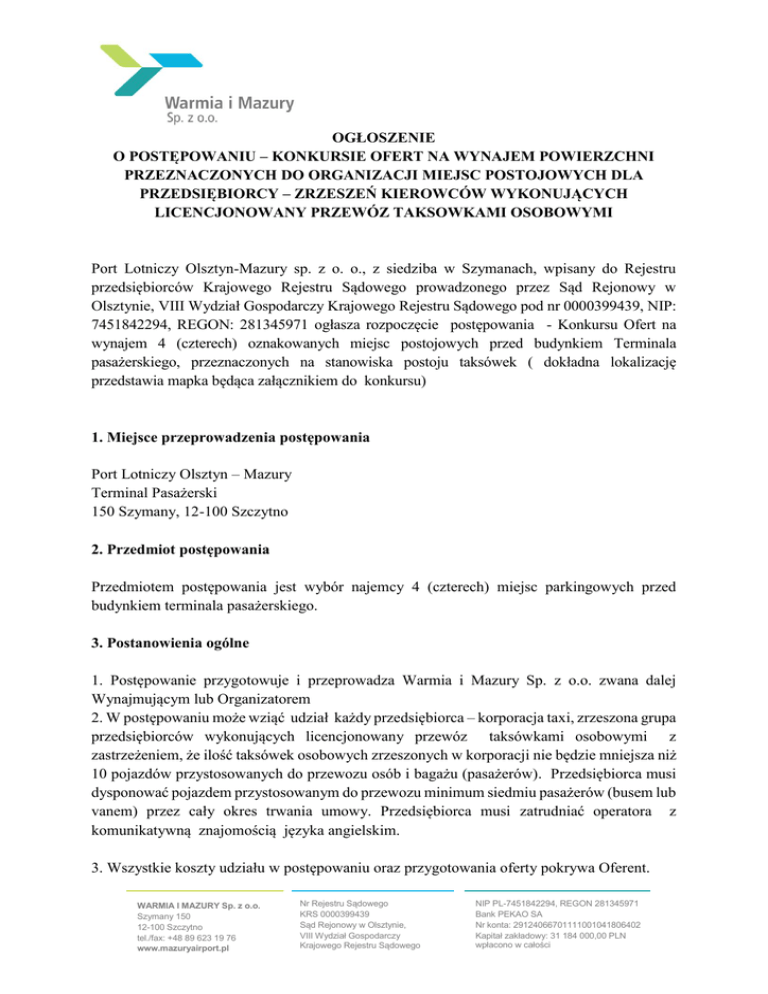 OGŁOSZENIE O POSTĘPOWANIU – KONKURSIE OFERT NA WYNAJEM POWIERZCHNI PRZEZNACZONYCH DO ORGANIZACJI MIEJSC POSTOJOWYCH DLA PRZEDSIĘBIORCY – ZRZESZEŃ KIEROWCÓW WYKONUJĄCYCH LICENCJONOWANY PRZEWÓZ TAKSOWKAMI OSOBOWYMI Port Lotniczy Olsztyn-Mazury sp. z o. o., z siedziba w Szymanach, wpisany do Rejestru przedsiębiorców Krajowego Rejestru Sądowego prowadzonego przez Sąd Rejonowy w Olsztynie, VIII Wydział Gospodarczy Krajowego Rejestru Sądowego pod nr 0000399439, NIP: 7451842294, REGON: 281345971 ogłasza rozpoczęcie postępowania - Konkursu Ofert na wynajem 4 (czterech) oznakowanych miejsc postojowych przed budynkiem Terminala pasażerskiego, przeznaczonych na stanowiska postoju taksówek ( dokładna lokalizację przedstawia mapka będąca załącznikiem do konkursu) 1. Miejsce przeprowadzenia postępowania Port Lotniczy Olsztyn – Mazury Terminal Pasażerski 150 Szymany, 12-100 Szczytno 2. Przedmiot postępowania Przedmiotem postępowania jest wybór najemcy 4 (czterech) miejsc parkingowych przed budynkiem terminala pasażerskiego. 3. Postanowienia ogólne 1. Postępowanie przygotowuje i przeprowadza Warmia i Mazury Sp. z o.o. zwana dalej Wynajmującym lub Organizatorem 2. W postępowaniu może wziąć udział każdy przedsiębiorca – korporacja taxi, zrzeszona grupa przedsiębiorców wykonujących licencjonowany przewóz taksówkami osobowymi z zastrzeżeniem, że ilość taksówek osobowych zrzeszonych w korporacji nie będzie mniejsza niż 10 pojazdów przystosowanych do przewozu osób i bagażu (pasażerów). Przedsiębiorca musi dysponować pojazdem przystosowanym do przewozu minimum siedmiu pasażerów (busem lub vanem) przez cały okres trwania umowy. Przedsiębiorca musi zatrudniać operatora z komunikatywną znajomością języka angielskim. 3. Wszystkie koszty udziału w postępowaniu oraz przygotowania oferty pokrywa Oferent. WARMIA I MAZURY Sp. z o.o. Szymany 150 12-100 Szczytno tel./fax: +48 89 623 19 76 www.mazuryairport.pl Nr Rejestru Sądowego KRS 0000399439 Sąd Rejonowy w Olsztynie, VIII Wydział Gospodarczy Krajowego Rejestru Sądowego NIP PL-7451842294, REGON 281345971 Bank PEKAO SA Nr konta: 29124066701111001041806402 Kapitał zakładowy: 31 184 000,00 PLN wpłacono w całości 4. Z ubiegania się o udział w postępowaniu ofertowym wyklucza się: a) podmioty , w stosunku do których otwarto likwidację lub których upadłość ogłoszono; b) podmioty (Oferentów), które zalegają z uiszczeniem podatków, opłat lub składek na ubezpieczenie społeczne lub zdrowotne, z wyjątkiem przypadków gdy uzyskali oni przewidziane prawem zwolnienie, odroczenie, rozłożenie na raty zaległych płatności lub wstrzymanie w całości wykonania decyzji właściwego organu; c) Oferentów, którzy złożyli oferty po terminie przewidzianym w ogłoszeniu, bądź zgłosili oferty niepełne lub nie spełniające warunków. Wynajmujący wymaga złożenia przez Oferentów stosownego oświadczenia o spełnieniu powyższych warunków. Oświadczenie traktowane jest jako integralna część oferty. 5. Postępowanie ma charakter niejawny. Nie przewiduje się publicznego otwierania ofert oraz informowania o ilości i biorących udział w postępowaniu firmach Oferentów. 6. Weryfikacji, oceny i wyboru oferty dokona Komisja powołana przez Warmia i Mazury Sp z o.o. 7. Wynajmujący zastrzega sobie prawo do: a) ogłoszenie etapu ustnego polegające na zaproszeniu wszystkich oferentów, którzy złożyli skuteczne oferty w etapie pisemnym do złożenia oferty ostatecznej, po przekazaniu przez Wynajmującego wyników ofert pisemnych; b) unieważnienia postępowania bez podania przyczyn; c) odwołania postępowania lub zmiany jego warunków; w dowolnym czasie bez ponoszenia odpowiedzialności wobec Oferentów, którzy złożyli oferty. 8. Okres obowiązywania umowy wynosi 24 miesiące 9. Okres związania ofertą powinien być nie krótszy niż 60 dni 4. Warunki udziału w postępowaniu – Konkursie Ofert Warunkiem przystąpienia do postępowania – konkursu ofert jest: 1. Złożenie prawidłowo wypełnionej oferty na wzorze Formularza Ofertowego, stanowiącego załącznik numer 3 do niniejszego Ogłoszenia z zastrzeżeniem, że oferta będzie zawierała propozycję stawki gwarantowanej całkowitego czynszu miesięcznego dla czterech miejsc postoju będących przedmiotem postępowania oraz propozycję ceny za 1km ( 2 taryfy). 2. Złożenie dokumentów zgodnie z listą wymaganych dokumentów, stanowiącą Załącznik numer 2 do niniejszego Ogłoszenia. 3. Posiadanie przez Oferenta udokumentowanego doświadczenia w prowadzeniu działalności polegającej na wykonywaniu licencjonowanego przewozu pasażerów taksówką osobową. WARMIA I MAZURY Sp. z o.o. Szymany 150 12-100 Szczytno tel./fax: +48 89 623 19 76 www.mazuryairport.pl Nr Rejestru Sądowego KRS 0000399439 Sąd Rejonowy w Olsztynie, VIII Wydział Gospodarczy Krajowego Rejestru Sądowego NIP PL-7451842294, REGON 281345971 Bank PEKAO SA Nr konta: 29124066701111001041806402 Kapitał zakładowy: 31 184 000,00 PLN wpłacono w całości 4. Posiadanie przez Oferenta floty co najmniej 10 pojazdów, w tym pojazdu do przewozu siedmiu osób wraz z kierowcami uprawnionymi do wykonywania licencjonowanego przewozu pasażerów taksówką osobową. 5. Oferent może zwrócić się do Wynajmującego o wyjaśnienie treści ogłoszenia w formie pisemnej (e – mail, fax, poczta tradycyjna). W przypadku udzielania wyjaśnień, Wynajmujący udostępni wyjaśnienia na stronie internetowej www.mazuryairport.pl. 5. Forma, miejsce i termin składania ofert 1. Termin składania ofert upływa w dniu 05.08.2016 r. 2. Oferty powinny zostać złożone w sekretariacie Biura Zarządu Portu Lotniczego Olsztyn – Mazury ( budynek administracyjny, 12-100 Szczytno, Szymany 150) 3.Ofertę należy złożyć w zamkniętej kopercie z dopiskiem: „Konkurs na najem miejsc postojowych przeznaczonych na stanowiska postoju taksówek przed budynkiem Terminala Pasażersk
