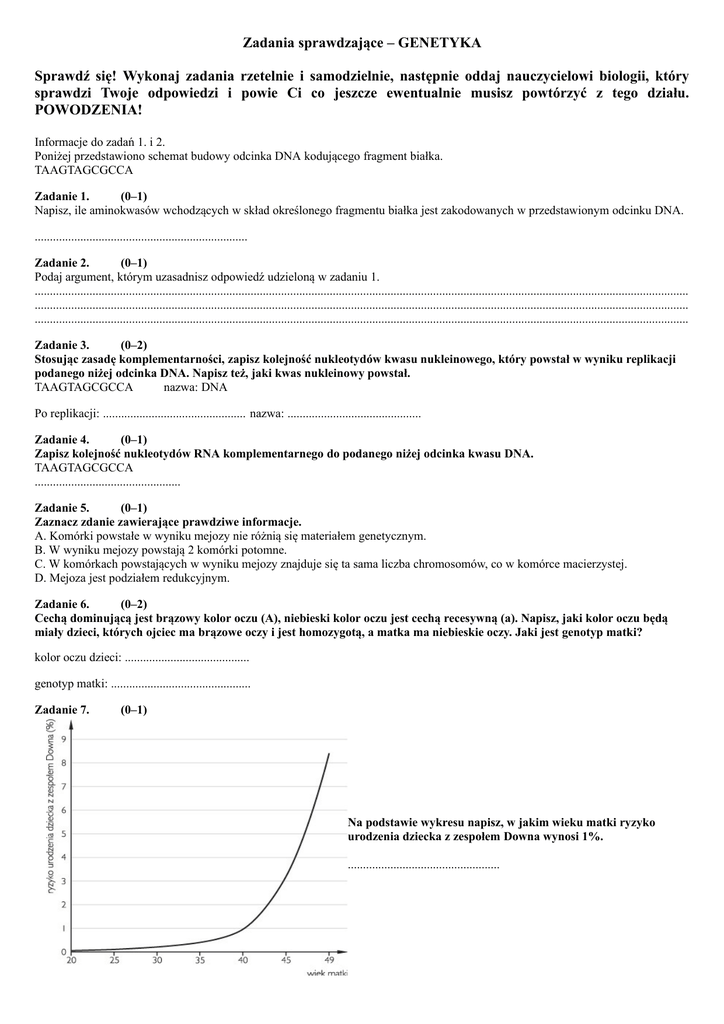 Zadania sprawdzające – GENETYKA Sprawdź się! Wykonaj zadania rzetelnie i samodzielnie, następnie oddaj nauczycielowi biologii, który sprawdzi Twoje odpowiedzi i powie Ci co jeszcze ewentualnie musisz powtórzyć z tego działu. POWODZENIA! Informacje do zadań 1. i 2. Poniżej przedstawiono schemat budowy odcinka DNA kodującego fragment białka. TAAGTAGCGCCA Zadanie 1. (0–1) Napisz, ile aminokwasów wchodzących w skład określonego fragmentu białka jest zakodowanych w przedstawionym odcinku DNA. ...................................................................... Zadanie 2. (0–1) Podaj argument, którym uzasadnisz odpowiedź udzieloną w zadaniu 1. ....................................................................................................................................................................................................................... ....................................................................................................................................................................................................................... ....................................................................................................................................................................................................................... Zadanie 3. (0–2) Stosując zasadę komplementarności, zapisz kolejność nukleotydów kwasu nukleinowego, który powstał w wyniku replikacji podanego niżej odcinka DNA. Napisz też, jaki kwas nukleinowy powstał. TAAGTAGCGCCA nazwa: DNA Po replikacji: ............................................... nazwa: ............................................ Zadanie 4. (0–1) Zapisz kolejność nukleotydów RNA komplementarnego do podanego niżej odcinka kwasu DNA. TAAGTAGCGCCA ................................................ Zadanie 5. (0–1) Zaznacz zdanie zawierające prawdziwe informacje. A. Komórki powstałe w wyniku mejozy nie różnią się materiałem genetycznym. B. W wyniku mejozy powstają 2 komórki potomne. C. W komórkach powstających w wyniku mejozy znajduje się ta sama liczba chromosomów, co w komórce macierzystej. D. Mejoza jest podziałem redukcyjnym. Zadanie 6. (0–2) Cechą dominującą jest brązowy kolor oczu (A), niebieski kolor oczu jest cechą recesywną (a). Napisz, jaki kolor oczu będą miały dzieci, których ojciec ma brązowe oczy i jest homozygotą, a matka ma niebieskie oczy. Jaki jest genotyp matki? kolor oczu dzieci: ......................................... genotyp matki: .............................................. Zadanie 7. (0–1) Na podstawie wykresu napisz, w jakim wieku matki ryzyko urodzenia dziecka z zespołem Downa wynosi 1%. .................................................. Zadanie 8. Jola ma niebieskie oczy, natomiast jej rodzice mają oczy brązowe. Zakładamy, że B oznacza gen dominujący odpowiedzialny za brązową barwę, a b oznacza gen recesywny odpowiedzialny za niebieską barwę oczu. Wykorzystaj oznaczenia bb, Bb lub BB. Wpisz do tabeli zestaw genów Joli i jej rodziców. (0-3) Jola – oczy niebieskie Mama – oczy brązowe Tata – oczy brązowe Zadanie 9. Uzupełnij poniższy tekst, zaznaczając odpowiedzi wybrane spośród a–h w taki sposób, aby informacja była prawdziwa. (0-4) Wszystkie geny danego organizmu określa się jako jego a / b, natomiast wszystkie cechy, które można u niego zaobserwować to jego a / b. Dwie formy tego samego genu określamy jako c / d. Pierwsze prawo Mendla mówi o tym, że każdy e / f ma dwa allele. Osob niki, które mają identyczne allele (AA lub aa) nazywa się g / h, a te, które mają różne allele (Aa), są nazywane g / h. a) genotyp e) chromosom b) fenotyp f) gen c) allele g) heterozygotami d) cechy h) homozygotami Zadanie 10. (0-1) Krzyżowanie heterozygoty z homozygotą recesywną nazywa się krzyżówką testową. Zaznacz zapis krzyżówki testowej. a) AA x aa d) aa x aa b) Aa x Aa e) AA x AA c) Aa x aa Zadanie 11. (0-3) U człowieka allel dominujący B warunkuje brązowy kolor oczu, a allel recesywny b – niebieski kolor oczu. Jaki kolor oczu będzie miało potomstwo brązowookiej Anny i niebieskookiego Tomasza, jeśli mama Anny była niebieskooka? Narysuj krzyżówkę obrazującą zadanie. a) 50% – brązowe oczy, 50% – niebieskie oczy b) 75% – brązowe oczy, 25% – niebieskie oczy c) 100% niebieskie oczy d) 100% brązowe oczy Pod względem barwy oczu Anna jest: a) homozygotą dominującą. b) homozygotą recesywną. c) heterozygotą. Zadanie 12. (0-3) O grupie krwi decydują trzy allele: grupę A warunkuje allel dominujący I A, grupę B – allel dominujący I B, grupa 0 jest cechą recesywną warunkowaną przez allel i 0. Jakie genotypy mają Anna i Tomasz, jeśli Anna ma grupę krwi AB, a Tomasz – grupę 0? Narysuj krzyżówkę obrazującą zadanie. a) Anna – i0i0, Tomasz – IAIB b) Anna – IAIB, Tomasz – i0i0 c) Anna – IAi0, Tomasz – IBi0 d) Anna – IAIB, Tomasz – IAIB Jakie jest prawdopodobieństwo, że dziecko Anny i Tomasza będzie miało grupę krwi A? a) 0% b) 25% c) 50% d) 100% Zadanie 13. (0-1) Magda jest nosicielką daltonizmu, Darek jest zdrowy. Zaznacz zestaw, w którym prawidłowo podano genotyp Magdy oraz genotyp Darka. a) Magda – XDXd, Darek – XdY b) Magda – XDXd, Darek – XDY c) Magda – Dd, Darek – DD d) Magda – XdXd, Darek – XY Zadanie 14. (0-2) Oceń prawdziwość stwierdzeń dotyczących kodu genetycznego. a) Kod genetyczny jest trójkowy, co oznacza, że trzy kolejne nukleotydy kodują jeden aminokwas. PRAWDA / FAŁSZ b) Kod genetyczny jest czwórkowy, co oznacza, że cztery rodzaje nukleotydów budują DNA. PRAWDA / FAŁSZ c) Kod genetyczny to informacja genetyczna. PRAWDA / FAŁSZ d) Kod genetyczny jest uniwersalny, co oznacza, że u wszystkich organizmów sposób zapisu informacji genetycznej jest taki sam. PRAWDA / FAŁSZ Zadanie 15. (0-2) Zaznacz zdania, które zawierają informacje prawdziwe. a) Mutacje to nie