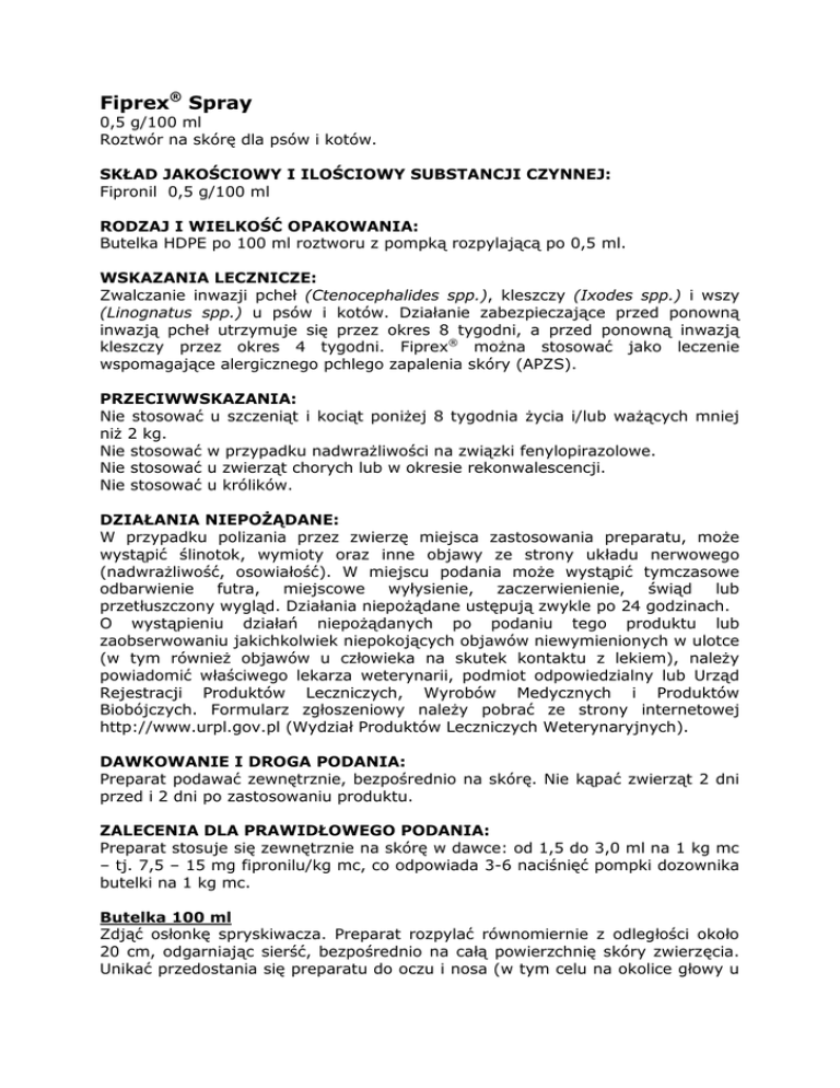 Fiprex® Spray 0,5 g/100 ml Roztwór na skórę dla psów i kotów. SKŁAD JAKOŚCIOWY I ILOŚCIOWY SUBSTANCJI CZYNNEJ: Fipronil 0,5 g/100 ml RODZAJ I WIELKOŚĆ OPAKOWANIA: Butelka HDPE po 100 ml roztworu z pompką rozpylającą po 0,5 ml. WSKAZANIA LECZNICZE: Zwalczanie inwazji pcheł (Ctenocephalides spp.), kleszczy (Ixodes spp.) i wszy (Linognatus spp.) u psów i kotów. Działanie zabezpieczające przed ponowną inwazją pcheł utrzymuje się przez okres 8 tygodni, a przed ponowną inwazją kleszczy przez okres 4 tygodni. Fiprex® można stosować jako leczenie wspomagające alergicznego pchlego zapalenia skóry (APZS). PRZECIWWSKAZANIA: Nie stosować u szczeniąt i kociąt poniżej 8 tygodnia życia i/lub ważących mniej niż 2 kg. Nie stosować w przypadku nadwrażliwości na związki fenylopirazolowe. Nie stosować u zwierząt chorych lub w okresie rekonwalescencji. Nie stosować u królików. DZIAŁANIA NIEPOŻĄDANE: W przypadku polizania przez zwierzę miejsca zastosowania preparatu, może wystąpić ślinotok, wymioty oraz inne objawy ze strony układu nerwowego (nadwrażliwość, osowiałość). W miejscu podania może wystąpić tymczasowe odbarwienie futra, miejscowe wyłysienie, zaczerwienienie, świąd lub przetłuszczony wygląd. Działania niepożądane ustępują zwykle po 24 godzinach. O wystąpieniu działań niepożądanych po podaniu tego produktu lub zaobserwowaniu jakichkolwiek niepokojących objawów niewymienionych w ulotce (w tym również objawów u człowieka na skutek kontaktu z lekiem), należy powiadomić właściwego lekarza weterynarii, podmiot odpowiedzialny lub Urząd Rejestracji Produktów Leczniczych, Wyrobów Medycznych i Produktów Biobójczych. Formularz zgłoszeniowy należy pobrać ze strony internetowej http://www.urpl.gov.pl (Wydział Produktów Leczniczych Weterynaryjnych). DAWKOWANIE I DROGA PODANIA: Preparat podawać zewnętrznie, bezpośrednio na skórę. Nie kąpać zwierząt 2 dni przed i 2 dni po zastosowaniu produktu. ZALECENIA DLA PRAWIDŁOWEGO PODANIA: Preparat stosuje się zewnętrznie na skórę w dawce: od 1,5 do 3,0 ml na 1 kg mc – tj. 7,5 – 15 mg fipronilu/kg mc, co odpowiada 3-6 naciśnięć pompki dozownika butelki na 1 kg mc. Butelka 100 ml Zdjąć osłonkę spryskiwacza. Preparat rozpylać równomiernie z odległości około 20 cm, odgarniając sierść, bezpośrednio na całą powierzchnię skóry zwierzęcia. Unikać przedostania się preparatu do oczu i nosa (w tym celu na okolice głowy u zwierząt nerwowych lub szczeniąt można nanieść produkt za pomocą zwilżonej gąbki). Po zabiegu ponownie zabezpieczyć spryskiwacz osłonką. Butelka 250 ml Przekręcić nakrętkę rozpylacza do pozycji ON. Preparat rozpylać równomiernie z odległości około 20 cm, odgarniając sierść, bezpośrednio na całą powierzchnię skóry zwierzęcia. Unikać przedostania się preparatu do oczu i nosa (w tym celu na okolice głowy u zwierząt nerwowych lub szczeniąt można nanieść produkt za pomocą zwilżonej gąbki). Po zabiegu ustawić zakrętkę w pozycji OFF. W celu uzyskania optymalnego efektu działania produkt należy podawać z zachowaniem minimum 4-tygodniowych odstępów pomiędzy kolejnymi aplikacjami. Należy zawsze mieć na uwadze aktualny stopień nasilenia inwazji pcheł i kleszczy na danym terenie. Preparat nie zabezpiecza przed przyczepieniem się kleszcza do skóry zwierzęcia. Po zabiciu kleszcze zazwyczaj spadają z kota lub psa, natomiast te które pozostaną mogą być usunięte przez delikatne strzepnięcie. W niekorzystnych warunkach po zastosowaniu preparatu mogą pozostawać na zwierzęciu pojedyncze ektopasożyty, w związku z tym nie można całkowicie wykluczyć możliwości przenoszenia chorób zakaźnych. Pchły występują również w miejscach w których przebywają zwierzęta (legowiska, dywany). Miejsca te również powinny być poddane działaniu preparatów przeciwpasożytniczych i regularnie odkurzane. Wszystkie koty i psy przebywające w gospodarstwie domowym powinny również podlegać leczeniu. SPECJALNE ŚRODKI OSTROŻNOŚCI PRZY PRZECHOWYWANIU I TRANSPORCIE: Przechowywać w temperaturze poniżej 25°C. Nie zamrażać. Nie przechowywać w lodówce. SPECJALNE OSTRZEŻENIA I ŚRODKI OSTROŻNOŚCI: Zapobiegać lizaniu sierści przez zwierzęta kilka godzin po zabiegu. Nie stosować na uszkodzoną skórę psa lub kota. Zwierzęta o stwierdzonej nadwrażliwości na którykolwiek składnik preparatu nie powinny być poddawane zabiegowi. Zaleca się podawać preparat w gumowych rękawiczkach ochronnych. Podczas zabiegu nie pić, nie jeść i nie palić. Unikać kontaktu preparatu ze skórą. Po zabiegu dokładnie umyć ręce. Nie dotykać zwierzęcia aż do całkowitego wyschnięcia preparatu. W przypadku kontaktu preparatu ze śluzówką oka należy przemyć zanieczyszczone miejsce dużą ilością wody. Osoby o stwierdzonej nadwrażliwości na którykolwiek składnik preparatu powinny zachować szczególną ostrożność przy jego aplikacji. W badaniach prowadzonych na zwierzętach laboratoryjnych nie zaobserwowano negatywnego wpływu na reprodukcję ani negatywnego działania teratogennego. Nie należy stosować u ciężarnych i karmiących suk lub kotek ze względu na brak danych dotyczących bezpieczeństwa. Ryzyko wystąpienia działań niepożądanych może wzrosnąć przy przedawkowaniu preparatu. W wyniku przedawkowania może dojść do wystąpienia niekontrolowanych skurczy mięśni i drgawek. W niektórych przypadkach obserwowano pobudzenie lub senność oraz nadwrażliwość na hałas i światło. Stwierdzano także przejściowe zawroty głowy, nadmiernie ślinienie się oraz nudności i wymioty. W miejscu podania produktu może dojść do przejściowego zaczerwieniania lub podrażnienia skóry. Wszystkie te objawy ustępują zwykle po upływie 24 godzin. W celu zmniejszenia ich intensywności można zastosować leczenie objawowe. Zastosowanie się do zaleceń producenta ograni