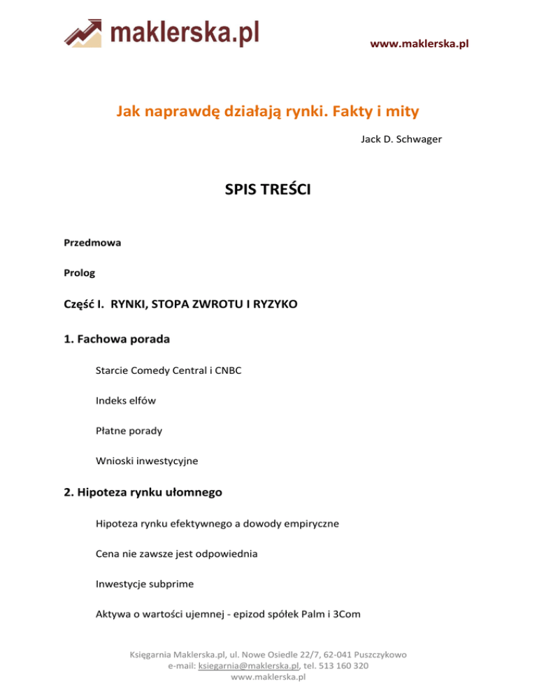 www.maklerska.pl Jak naprawdę działają rynki. Fakty i mity Jack D. Schwager SPIS TREŚCI Przedmowa Prolog Część I. RYNKI, STOPA ZWROTU I RYZYKO 1. Fachowa porada Starcie Comedy Central i CNBC Indeks elfów Płatne porady Wnioski inwestycyjne 2. Hipoteza rynku ułomnego Hipoteza rynku efektywnego a dowody empiryczne Cena nie zawsze jest odpowiednia Inwestycje subprime Aktywa o wartości ujemnej - epizod spółek Palm i 3Com Księgarnia Maklerska.pl, ul. Nowe Osiedle 22/7, 62-041 Puszczykowo e-mail: [email protected], tel. 513 160 320 www.maklerska.pl www.maklerska.pl Nadchodzi załamanie rynku - gdzie są wiadomości? Rozziew między zdarzeniami fundamentalnymi a ruchami cen Ruchy cen dyktują wiadomości finansowe Szczęście czy umiejętności? Dodatek A: wyniki historyczne funduszu ……….. ………...Renaissance Medallion Błędna przesłanka hipotezy rynku efektywnego: analogia szachowa Niektórzy gracze nawet nie próbują wygrać Brakujący składnik Słuszne wnioski z niesłusznych przesłanek: dlaczego trudno pobić rynek Diagnoza wad hipotezy rynku efektywnego Dlaczego hipoteza rynku efektywnego jest skazana na śmietnik teorii ……… ……… ..ekonomicznej Wnioski inwestycyjne 3. Tyrania historycznych stóp zwrotu Wyniki S&P w latach następujących po okresach wysokich i niskich stóp zwrotu Konsekwencje okresów wysokich i niskich stóp zwrotu dla dłuższych …………horyzontów inwestycyjnych Czy wybranie najlepszego sektora ma swoje zalety? Fundusze hedgingowe: względne wyniki strategii najwyższych historycznych ……….. stóp zwrotu Księgarnia Maklerska.pl, ul. Nowe Osiedle 22/7, 62-041 Puszczykowo e-mail: [email protected], tel. 513 160 320 www.maklerska.pl www.maklerska.pl . Dlaczego sektory i strategie o wysokich historycznych stopach zwrotu dają tak słabe wyniki? Chwileczkę, czyli to ma znaczyć, że...? Wnioski inwestycyjne 4. Błędny pomiar ryzyka Gorsze niż nic Zmienność jako miara ryzyka Źródło problemu Ryzyko ukryte Ocena ryzyka ukrytego Mylenie zmienności z ryzykiem Problem z wartością narażoną na ryzyko Ryzyko aktywów: dlaczego pozory mogą mylić, czyli cena jest ważna Wnioski inwestycyjne 5. Dlaczego w zmienności nie chodzi tylko o ryzyko i przypadek lewarowanych funduszy ETF Lewarowane fundusze ETF: możesz się nie spodziewać tego, co dostaniesz Wnioski inwestycyjne 6. Pułapki historii wyników Księgarnia Maklerska.pl, ul. Nowe Osiedle 22/7, 62-041 Puszczykowo e-mail: [email protected], tel. 513 160 320 www.maklerska.pl www.maklerska.pl Ryzyko ukryte Pułapka dotycząca odpowiedniości danych Gdy dobre wyniki historyczne są złe Pułapka polegająca na porównywaniu rzeczy nieporównywalnych Dłuższa historia wyników mogłaby być mniej istotna Wnioski inwestycyjne 7. Sensowne i bezsensowne twierdzenia na temat danych statystycznych pro forma Wnioski inwestycyjne 8. Ocena wyników historycznych Dlaczego sama stopa zwrotu jest bezwartościowa Miary stóp zwrotu skorygowanych o ryzyko Ocena wyników w postaci graficznej Krzywa zanurzenia i wykresy dwukierunkowej krzywej zanurzenia Wnioski inwestycyjne 9. Korelacja: fakty i mity Definicja korelacji Korelacja wskazuje na zależności liniowe Współczynnik determinacji (r2) Księgarnia Maklerska.pl, ul. Nowe Osiedle 22/7, 62-041 Puszczykowo e-mail: [email protected], tel. 513 160 320 www.maklerska.pl www.maklerska.pl Korelacje pozorne (nonsensowne) Błędne założenia dotyczące korelacji Skupienie się na miesiącach spadkowych Korelacja a współczynnik beta Wnioski inwestycyjne Część II. FUNDUSZE HEDGINGOWE JAKO FORMA INWESTYCJI 10. Powstanie funduszy hedgingowych 11. Fundusze hedgingowe Różnice między funduszami hedgingowymi a funduszami inwestycyjnymi Rodzaje funduszy hedgingowych Korelacja z rynkiem akcji 12. Inwestowanie w fundusze hedgingowe: wyobrażenia a rzeczywistość Przesłanki inwestowania w fundusze hedgingowe Zalety włączenia funduszy hedgingowych do portfela Szczególny przypadek managed futures Ryzyko ograniczenia się do jednego funduszu Wnioski inwestycyjne Księgarnia Maklerska.pl, ul. Nowe Osiedle 22/7, 62-041 Puszczykowo e-mail: [email protected], tel. 513 160 320 www.maklerska.pl www.maklerska.pl 13. Strach przed funduszami hedgingowymi: to ludzka rzecz Przypowieść Strach przed funduszami hedgingowymi 14. Paradoks słabszych wyników hedgingowych funduszy funduszy Wnioski inwestycyjne 15. Błąd dotyczący dźwigni finansowej Głupota umownych zasad inwestycji Dźwignia finansowa a preferencje inwestorów Kiedy dźwignia finansowa jest niebezpieczna Wnioski inwestycyjne 16. Rachunki zarządzane: korzystna dla inwestorów alternatywa dla funduszy Podstawowa różnica między rachunkami zarządzanymi a funduszami Największe zalety rachunku zarządzanego Indywidualne rachunki zarządzane a pośrednia inwestycja na zasadach …………rachunku zarządzanego Dlaczego zarządzający mieliby się godzić na rachunki zarządzane? Czy istnieją strategie nieodpowiednie dla rachunków zarządzanych? Ocena czterech powszechnych zastrzeżeń zgłaszanych wobec rachunków . …………zarządzanych Księgarnia Maklerska.pl, ul. Nowe Osiedle 22/7, 62-041 Puszczykowo e-mail: [email protected], tel. 513 160 320 www.maklerska.pl www.maklerska.pl Wnioski inwestycyjne Postscriptum do części II: czy stopy zwrotu funduszy hedgingowych to …………fatamorgana? Część III. Kwestie portfelowe 17. Dywersyfikacja: dlaczego 10 to za mało Zalety dywersyfikacji Dywersyfikacja: kiedy jest wystarczająca? Ryzyko losowości Ryzyko idiosynkratyczne Zastrzeżenie Wnioski inwestycyjne 18. Dywersyfikacja: gdy więcej znaczy mniej Wnioski inwestycyjne 19. Inwestowanie w stylu Robin Hooda Nowy test Dlaczego równoważenie portfela się sprawdza Wyjaśnienie Wnioski inwestycyjne Księgarnia Maklerska.pl, ul. Nowe Osiedle 22/7, 62-041 Puszczykowo e-mail: [email protected], tel. 513 160 320 www.maklerska.pl www.maklerska.pl 20. Czy wysoka zmienność zawsze