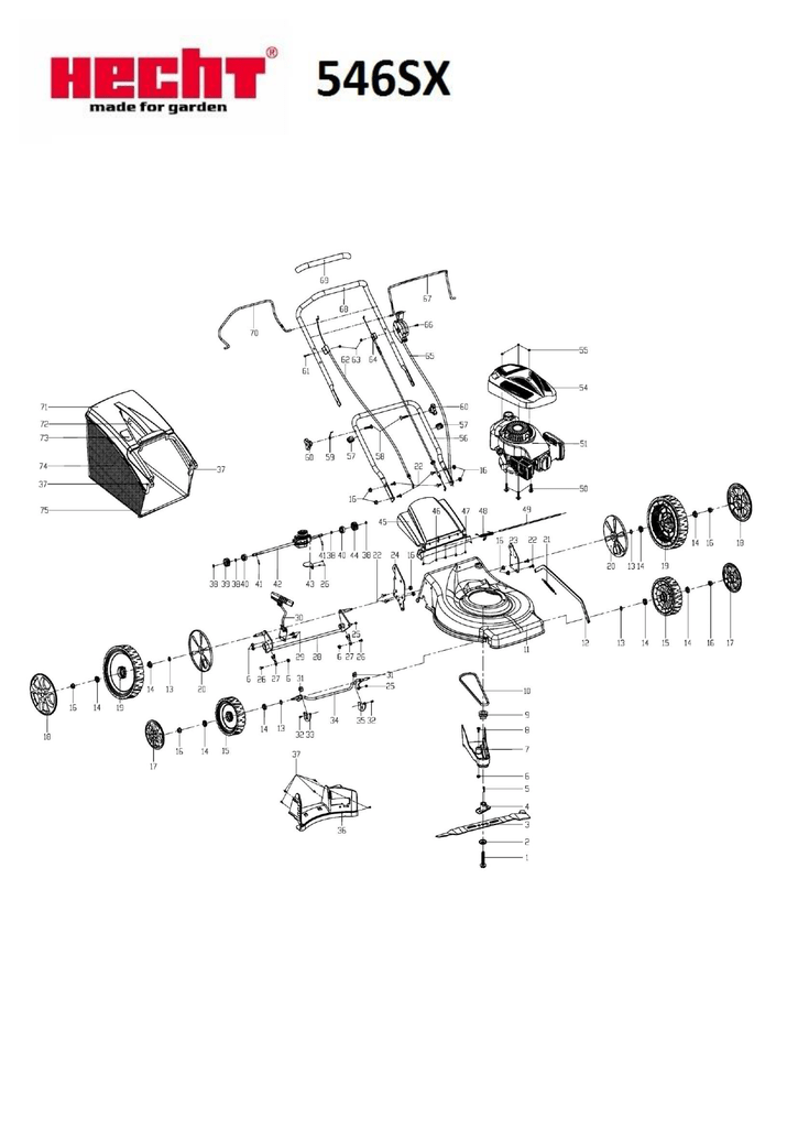 Pozice 1 2 3 4 5 6 7 8 9 10 11 12 13 14 15 16 17 18 19 20 21 22 23 24 25 26 27 28 29 30 31 32 33 34 35 36 37 38 39 40 41 42 43 44 45 46 47 48 49 50 51 54 55 56 57 Objednací číslo DY0218-52 DY0218-20 DY0608-12 DY0218-21F DY0701-31 DY0801-2 DY0218-19B Z686 DY0801-6A DY0218-15A DY0701.1W M-08 DY0701-13D DY0701-14D DY0701.2W DY0701-23 DY0302-6A SV-08*16 DY0701-18 DY0801-33 S-06*12 DY0304-10 DY0701.4H S-06*16 DY0801.5D DY0601-7 546SX0033 DY0801.3A 546SX0035 DY0801-3 ST4,2*16 PK-12 DY0218.11-1 R8RS DY0706 DY0702.30C DY0702-10C DY0218.4-1 DY0701-21C ST4,8*13 DY0701-22C DY0701-20C DY0601-14C S-08*25 1P64F Q08.12-10D DY0701-24 Název Šroub nože Podložka šroubu nože Nůž Unašeč nože Klínek unašeče 4,7x5x35 Šroub M6x16 Kryt řemenu Matice M6 Řemenice motoru Klínový řemen Z686 Šasí Táhlo zdvihu Podložka 13x20x2 Ložisko kola Přední kolo Matice M8 Poklice předního kola Poklice zadního kola Zadní kolo Vnitřní kryt kola Pružina zdvihu Šroub vratový M8x16 Držák spodního madla levý Držák spodního madla pravý Matice M6 Šroub M6x12 Pojistka zadní osy Zadní osa kol Šroub M6x16 Páka zdvihu Lůžko přední osy Šroub M6x8 Pojistka přední osy pravá Přední osa kol Pojistka přední osy levá Zadní přepážka Šroub ST4,2x16 Pojistný kroužek 12 Pravý pastorek pojezdu Ložisko R8RS Západka pojezdu 5x21,6 Převodovka pojezdu Držák převodovky Pastorek pojezdu levý Víko koše Šroub ST4,8x13 Zadní kryt Pružina víka koše Osa víka koše Šroub M8x25 Motor 1P64F Kryt motoru Matice M6 Spodní madlo Svorka bowdenu Name Blade bolt Blade bolt washer Blade Blade holder Blade holder key 4x7x5x35 Square neck bolt M6x16 Belt cover Nut M6 Engine sheave V-belt Z686 Deck Height adjusting rod Washer 13x20x2 Wheel bearing Front wheel Nut M8 Front wheel cover Rear wheel cover Rear wheel Wheel inner cover Height adjusting rod spring Carriage bolt M8x16 Lower handle left bracket Lower handle right bracket Nut M6 Hexagon bolt M6x12 Rear axle fixing clip Rear wheel axle Hexagon bolt M6x16 Height adjusting lever Front axle plastic holder Bolt M6x8 Right front axle clip Front wheel axle Left front axle clip Rear air channel Screw ST4,2x16 Shaft circlip 12 Right output gear R8RS bearing Pin 5x21,6 Gearbox assembly Gearbox fixing plate Left output gear Rear board Screw ST4,8x13 Deck rear strip plate Rear board spring Rear cover shaft Hexagon screw M8x25 Engine 1P64F Engine cover Nut M6 Lower handle Cable clamp Ks 1 1 1 1 1 5 1 1 1 1 1 1 4 8 2 12 2 2 2 2 1 8 1 1 2 4 2 1 2 1 2 2 1 1 1 1 7 4 1 2 2 1 1 1 1 7 1 1 1 3 1 1 3 1 2 Pozice 58 59 60 61 62 63 64 65 66 67 68 69 70 71 72 73 74 75 Objednací číslo Název DY0218.1-4 Šroub madla DY0218-26 Záchyt madla startování DY0218.1.4 Křídlová matice Šroub M6x35 DY0605.2 Bowden brzdy motoru M-06K Matice M6 DY0702-28E Bowden pojezdu 546SX0065 Ovládání plynu Šroub M6x55 DY0701-32 Páka brzdy motoru DY0302.2-3 Horní madlo 546SX0069 Návlek madla DY0701-33 Páka pojezdu DY0701.6-2C Horní kryt koše DY0701.6-3 Krytka pod madlem DY0701.6-4C Ukazatel plnosti koše DY0801.6.2D Potah koše DY0801.6-21D Rám koše Name Screw Rope guide hook Knob nut Bolt M6x35 Flameout cable Nut M6 Driving cable Throttle control cable Bolt M6x55 Flameout lever Upper handle Upper handle foam sheath Driving lever Grasscatcher upper cover Plastic cover Grass level indicator Grasscatcher bag Grasscatcher frame Ks 2 1 2 1 1 2 1 1 1 1 1 1 1 1 1 1 1 1 Pozice 1 2 3 4 5 6 7 8 9 10 11 12 13 14 15 16 17 18 19 20 21 22 23 24 25 26 27 28 29 30 31 32 33 34 35 36 37 38 39 40 41 42 43 44 45 46 47 48 49 50 51 52 53 54 55 Objednací číslo M-06 Q08.09-20 Q08.09-10 Q08.09-30 S-06*12 Q08.02-20 Q08.02-21 S-08*45 Q08.05-28 Q08.05-27 Q08.05-25 Q08.05-24 Q08.05-23 Q08.05-26 Q08.05-11 Q08.05-10 26800605601 746001076 Q08.02-10 Q08.05-20 Q08.05-21 Q08.02-16A Q08.07-21 Q08.07-20 Q08.08-30 Q08.08-40 Q08.08-20 Q08.06-00A Q08.06-50A Q08.08-11B M-06 Q08.08-14B Q08.08-10B Q08.03-23KR Q08.03-31 Q08.03-30A Q08.03-32 Q08.03-10 S-06*45 Q08.01-42 S-06*30 ZH51300003 Q08.01-30 Q08.07-43 Q08.07-40 Q08.01-14 Q08.01-36 Q08.05-22 Název Matice M6 Kryt výfuku Výfuk Těsnění výfuku Šroub M6x12 Ventilové víko Těsnění ventilového víka Šroub M8x45 Pojistná matice Matice ventilu Vahadlo ventilu Podložka pružiny ventilu Pružina ventilu Seřizovací šroub ventilu Vodící deska Zdvihací tyčka ventilu Svorník M6x92 Svíčka F7RTC Hlava válce Sací ventil Výfukový ventil Čep 10x16 Těsnění hlavy válce Pružina regulace otáček Táhlo regulace otáček Těsnění příruby karburátoru Příruba karburátoru Těsnění karburátoru Karburátor Těsnění vzduchového filtru Příruba vzduchového filtru Pouzdro Matice M6 Vzduchový filtr Kryt vzduchového filtru Pístní kroužky sada Pojistka pístního čepu Píst Pístní čep Ojnice Šroub M6x45 Hrdlo nalévání oleje kompletní Pouzdro Šroub M6x30 Gufero 25x38x7 Víko motoru Upínací destička Palec regulátoru Podložka Hřídel regulátoru Kolo regulátoru otáček Podložka Čep 8x14 Těsnění Klikové skříně Zdvihátko Name Nut M6 Muffler cover Muffler assembly Muffler gasket Bolt M6x12 Cylinder head cover Cylinder head cover gasket Bolt M8x45 Nut Adjustment nut Valve rocker Valve spring holder Valve spring Adjustment bolt Push rod guide plate Valve push rod Muffler screw M6x92 Spark plug F7RTC Cylinder head Intake valve Exhaust valve Pin 10x16 Cylinder head gasket Throttle tension spring Throttle rod Intake flange gasket Intake carburetor flange Carburetor gasket Carburetor Air filter gasket Air filter base Air filter base bushing Nut M6 Air filter sponge Air filter cover Piston ring set Piston pin circlip Piston Piston pin Connecting rod Bolt M6x45 Oil filler pipe assembly Bushing Bolt M6x30 Oil seal 25x38x7 Crankcase cover Pressing plate Governor slider Washer Gear shaft Governor gear Washer Position pin 8x14 Crank case gasket Tappet Ks 2 1 1 1 11 1 1 5 2 2 2 2 2 2 1 2 4 1 1 1 1 2 1 1 1 1 1 1 1 1 1 2
