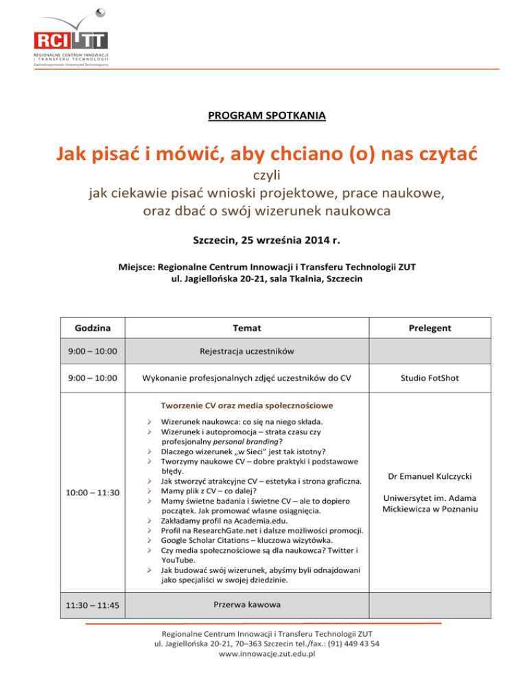 PROGRAM SPOTKANIA Jak pisać i mówić, aby chciano (o) nas czytać czyli jak ciekawie pisać wnioski projektowe, prace naukowe, oraz dbać o swój wizerunek naukowca Szczecin, 25 września 2014 r. Miejsce: Regionalne Centrum Innowacji i Transferu Technologii ZUT ul. Jagiellońska 20-21, sala Tkalnia, Szczecin Godzina Temat 9:00 – 10:00 Rejestracja uczestników 9:00 – 10:00 Wykonanie profesjonalnych zdjęć uczestników do CV Prelegent Studio FotShot Tworzenie CV oraz media społecznościowe 10:00 – 11:30 11:30 – 11:45 Wizerunek naukowca: co się na niego składa. Wizerunek i autopromocja – strata czasu czy profesjonalny personal branding? Dlaczego wizerunek „w Sieci” jest tak istotny? Tworzymy naukowe CV – dobre praktyki i podstawowe błędy. Jak stworzyć atrakcyjne CV – estetyka i strona graficzna. Mamy plik z CV – co dalej? Mamy świetne badania i świetne CV – ale to dopiero początek. Jak promować własne osiągnięcia. Zakładamy profil na Academia.edu. Profil na ResearchGate.net i dalsze możliwości promocji. Google Scholar Citations – kluczowa wizytówka. Czy media społecznościowe są dla naukowca? Twitter i YouTube. Jak budować swój wizerunek, abyśmy byli odnajdowani jako specjaliści w swojej dziedzinie. Przerwa kawowa Regionalne Centrum Innowacji i Transferu Technologii ZUT ul. Jagiellońska 20-21, 70–363 Szczecin tel./fax.: (91) 449 43 54 www.innowacje.zut.edu.pl Dr Emanuel Kulczycki Uniwersytet im. Adama Mickiewicza w Poznaniu Warsztat pisarski. Jak pisać, aby chciano (o) nas czytać 11:45 – 13:15 13:15 – 13:30 Od czego zależą nasze kompetencje i dlaczego można nauczyć się pisania. Punkt wyjścia: musimy mieć, o czym pisać. Nawyki pisarskie – uświadamianie sobie dobrych rozwiązań i rezygnowanie ze złych. Opowiadanie historii w tekście naukowym. Różne teksty – różny odbiorca: tekst naukowy, wniosek grantowy, materiał popularyzatorski. Dlaczego wnioski grantowe powinny być pisane według schematu? Redagowanie i adiustacja tekstów. Etapy prac nad tekstem: od szkicu do publikacji. Czym jest oryginalny artykuł badawczy. Podstawowe struktury tekstu. Jak unikać żargonu akademickiego i pisać zrozumiale. Podstawowe sprawy językowe: strona bierna i czynna, długość zdań, budowa akapitów. Najczęstsze błędy w strukturze pracy naukowej. Jak się przygotować do pisania. Tworzenie pierwszego szkicu. Jak zorganizować sobie pracę i ile trwa pisanie tekstu. Dr Emanuel Kulczycki Uniwersytet im. Adama Mickiewicza w Poznaniu Przerwa kawowa Prezentowanie i prezentacje 13:30 – 15:00 15:00 – 16:00 Etapy przygotowania do wystąpienia. Jak napisać scenariusz dobrej prezentacji. Zgłoszenie i pisanie interesującego abstraktu. Przygotowanie prezentacji. Podstawowe zasady budowy slajdów. Jakich narzędzi używać i jak unikać „powerpointyzacji nauki”. Jak ćwiczyć swoje wystąpienia. Komunikacja werbalna – czy naprawdę jest taka ważna? O czym warto pamiętać i o co zapytać organizatorów. Co musimy zrobić po wystąpieniu. Jak odpowiadać na pytania z sali. Dr Emanuel Kulczycki Uniwersytet im. Adama Mickiewicza w Poznaniu Wykonanie profesjonalnych zdjęć uczestników do CV Studio FotShot Szkolenie współfinansowane ze środków Ministerstwa Nauki i Szkolnictwa Wyższego Regionalne Centrum Innowacji i Transferu Technologii ZUT ul. Jagiellońska 20-21, 70–363 Szczecin tel./fax.: (91) 449 43 54 www.innowacje.zut.edu.pl