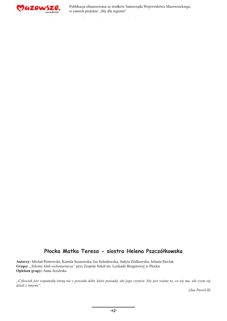 Publikacja sfinansowana ze środków Samorządu Województwa Mazowieckiego, w ramach projektu: „My dla regionu" Mikołaj Lasocki - humanista, dyplomata, mecenas Autorzy: Patryk Fistek, Aleksandra Muszyńska, Adrianna Muszyńska, Monika Dzięgielewska, Sylwia Karolak, Ewa Gasik Grupa: „Odkrywcy tajemnic” przy Gimnazjum im. Pawła Włodkowica w Brudzeniu Dużym Opiekunowie grupy: Beata Wrześniewska, Jarosław Jankowski Mikołaj Lasocki - szlachcic, herbu Dołęga. Urodzony w Lasotkach (gmina Brudzeń Duży) ok. 1380r. Syn ubogich szlachciców: Michała i Grzymisławy. Spokrewniony z Pawłem Włodkowicem, obrońca interesów polskich w sporach z krzyżakami. Zmarł 1450r. w Terni. Okres nauki Mikołaja Lasockiego Prawdopodobnie w 1407r. został zapisany na wydział prawa Akademii Krakowskiej, wcześniej uzyskał stopień magistra sztuki. Na dzień dzisiejszy nie wiadomo czy studia prawnicze ukończył. Jednakże szybki przebieg kariery, świadczy o wszechstronnym wykształceniu. Przebieg kariery dyplomatycznej M. Lasockiego Pojawia się wzmianka, iż w 1423r. Lasocki uczestniczył w procesie polsko - krzyżackim. W następnym roku był sekretarzem królewskim i kanonikiem krakowskim. Pracę w Kancelarii Herb Dołęga Królewskiej uzyskał prawdopodobnie dzięki protekcji Stanisława Ciołka z pochodzenia także Mazowszanina. Wyznaczenie w 1433r., przez króla Władysława III, Mikołaja Lasockiego na jednego z trzech delegatów na sobór bazylejski świadczy, że był bardzo ceniony przez dwór monarchy. Sobór w Bazylei pozwolił Lasockiemu na swobodne oskarżenie działań Krzyżaków, którzy pod pozorem chrystianizacji mordowali niewinnych ludzi. Domagał się likwidacji zakonu krzyżackiego, uznając go za ogromne zło w Kościele Katolickim. Na obradach soboru ustalono skład delegacji do Arras, gdzie miały zostać podjęte decyzje pokojowe między Francją, Burgundią i Anglią. W skład tej delegacji wchodził Mikołaj Lasocki. Kariera kościelna Lasockiego Po 1458r. uzyskał tytuł prałata i kustosza Gniezna. W latach 1447 - 1450 był ambasadorem Stolicy Apostolskiej. Otrzymał propozycję objęcia nominacji na biskupa pomorsko - kujawskiego, jednakże odrzucił ofertę ze względu na sprzeciw króla Kazimierza Jagiellończyka. Miał także możliwość pełnienia urzędu arcybiskupa Ostrzyhomia, jednakże proponowanej funkcji nie przyjął. Mecenas Nawiązanie znajomości z Guarinim Guarini, wybitnym pedagogiem z Werony spowodowało możliwość kształcenia i przygotowania młodzieży polskiej do działania w życiu naukowym i politycznym kraju. Guarinim Guarini Humanizm a Mikołaj Lasocki Według jednego z wielkich kronikarzy historii Polski Jana Długosza, Lasocki to: ,,Mąż rzadkiego rozumu i dziwnej do wszelkich spraw zręczności. Nauk wielki miłośnik i chwalebne dzieła tak głośną w świecie pozyskał sławę, że Polaka przez długie lata podobnego jemu nie wydała męża i kto wie, czy kiedy wydać zdoła”. Swym długoletnim trudem badawczym udostępnił młodym ludziom możliwość posiadania tak ogromnej wiedzy, jaką on sam miał. Mikołaj Lasocki to największy polski mecenas, dzięki którego pomocy i wpływom jesteśmy dumni z takich wybitnych postaci jak, Mikołaj Kopernik, Jan Kochanowski, Mikołaj Rej. Źródło: Nitecki P., Biskupi Kościoła w Polsce w latach 965 - 1999, Warszawa 2000; www.mazowsze.hist.pl; www.brudzen.pl/ciekawi-ludzie; www.naukowy.pl Płocka Matka Teresa - siostra Helena Pszczółkowska Autorzy: Michał Piotrowski, Kamila Sosnowska, Iza Schodowska, Judyta Ziółkowska, Jolanta Pawlak Grupa: „Szkolny klub wolontariusza” przy Zespole Szkół im. Leokadii Bergerowej w Płocku Opiekun grupy: Anna Jeziórska „Człowiek jest wspaniałą istotą nie z powodu dóbr, które posiada, ale jego czynów. Nie jest ważne to, co się ma, ale czym się dzieli z innymi”. (Jan Paweł II) -15- Publikacja sfinansowana ze środków Samorządu Województwa Mazowieckiego, w ramach projektu: „My dla regionu" Płocczanie, szczególnie ci starsi, niejednokrotnie słyszeli to zdanie - „Kalkuta miała Matkę Teresę, Płock ma swoją siostrę Helenę”. O kim mowa? Oczywiście o płockiej zakonnicy - siostrze Helenie Pszczółkowskiej. Wielu z nich pamięta także tą szczupłą, niską, nieco zgarbioną siostrę Szarytkę, przemierzającą codziennie płockie ulice. Widywano ją w okolicach Szpitala Świętej Trójcy, ul. Sienkiewicza i płockiej Starówki, wszędzie tam, gdzie ktoś oczekiwał jej pomocy. Siostra Helena była bez wątpienia pierwszą wielką wolontariuszką. Zdobywała leki i pieniądze dla biednych i chorych. Odwiedzała potrzebujących. Organizowała posiłki oraz środki potrzebne do codziennego życia. Nigdy nie czekała na pochwały i rozgłos. Podobno nie lubiła też porównywania do Matki Teresy z Kalkuty, którą jednak bardzo ceniła. Historia życia siostry Heleny rozpoczyna się 25 maja 1925r. we wsi Dzielin pod Przasnyszem. Po ukończeniu szkoły podstawowej w 1942r. wstąpiła do Zgromadzenia Sióstr Miłosierdzia św. Wincentego a Paulo w Warszawie. Zdobyła dyplom pielęgniarki. Pracowała w szpitalu w Kielcach, Lublinie i Otwocku, by znów wrócić do Warszawy. Kolejnym miejscem pobytu siostry było Obryte koło Pułtuska. W 1966r. siostra Helena przyjechała do Płocka i została w naszym mieście na stałe. Tu pełniła funkcję opiekunki społecznej pomagającej chorym i ubogim. Na początku lat dziewięćdziesiątych XXw. zaczęła współpracować z tutejszym Miejskim Ośrodkiem Pomocy Społecznej. Już osiem lat później otrzymała medal „Zasłużony dla Płocka”. W uzasadnieniu wniosku o nadanie tego odznaczenia napisano: „Zna doskonale płockie zakamarki, podwórka oraz ludzi, którzy wymagają pomocy, opieki i wsparcia. Wie, gdzie kto umiera, gdzie kto się rodzi, kto cierpi i kto wymaga opieki oraz pomocy. Zna, na co dzień dramaty bitych żon, opuszczonych przez rodziców dzieci…”. D