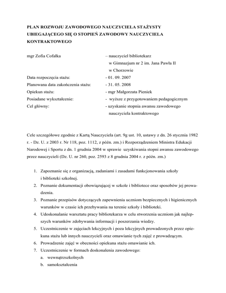 PLAN ROZWOJU ZAWODOWEGO NAUCZYCIELA STAŻYSTY UBIEGAJĄCEGO SIĘ O STOPIEŃ ZAWODOWY NAUCZYCIELA KONTRAKTOWEGO mgr Zofia Cofałka – nauczyciel bibliotekarz w Gimnazjum nr 2 im. Jana Pawła II w Chorzowie Data rozpoczęcia stażu: - 01. 09. 2007 Planowana data zakończenia stażu: - 31. 05. 2008 Opiekun stażu: - mgr Małgorzata Pieniek Posiadane wykształcenie: - wyższe z przygotowaniem pedagogicznym Cel główny: - uzyskanie stopnia awansu zawodowego nauczyciela kontraktowego Cele szczegółowe zgodnie z Kartą Nauczyciela (art. 9g ust. 10, ustawy z dn. 26 stycznia 1982 r. - Dz. U. z 2003 r. Nr 118, poz. 1112, z późn. zm.) i Rozporządzeniem Ministra Edukacji Narodowej i Sportu z dn. 1 grudnia 2004 w sprawie uzyskiwania stopni awansu zawodowego przez nauczycieli (Dz. U. nr 260, poz. 2593 z 8 grudnia 2004 r. z późn. zm.) 1. Zapoznanie się z organizacją, zadaniami i zasadami funkcjonowania szkoły i biblioteki szkolnej. 2. Poznanie dokumentacji obowiązującej w szkole i bibliotece oraz sposobów jej prowadzenia. 3. Poznanie przepisów dotyczących zapewnienia uczniom bezpiecznych i higienicznych warunków w czasie ich przebywania na terenie szkoły i biblioteki. 4. Udoskonalanie warsztatu pracy bibliotekarza w celu stworzenia uczniom jak najlepszych warunków zdobywania informacji i poszerzania wiedzy. 5. Uczestniczenie w zajęciach lekcyjnych i poza lekcyjnych prowadzonych przez opiekuna stażu lub innych nauczycieli oraz omawianie tych zajęć z prowadzącym. 6. Prowadzenie zajęć w obecności opiekuna stażu omawianie ich. 7. Uczestniczenie w formach doskonalenia zawodowego: a. wewnątrzszkolnych b. samokształcenia Znajomość organizacji, zadań i zasad funkcjonowania szkoły (§ 6 ust. 2, pkt 1)* Lp Zadania Formy realizacji Termin 1 Poznanie procedury awansu zawodowego Analiza przepisów prawa oświatowego dotyczącego awansu zawodowego tj. ustawy i rozporządzenia wrzesień 2007 2 Poznanie tygodniowego rozkładu zajęć w szkole, rozkładu dyżurów, zastępstw oraz zasad współpracy dyrektora z pracownikami. 3 Nawiązanie współpracy nauczyciela stażysty z opiekunem stażu. 4 Opracowanie Planu Rozwoju Zawodowego i przedłożenie go Dyrektorowi w celu uzyskania zatwierdzenia. 5 Poznanie organizacji, zadań i zasad funkcjonowania szkoły. Obserwacja, udział w Radach Pedagogicznych i konferencjach, systematyczne przeglądanie Zeszytu Zarządzeń Dyrektora i ogłoszeń wywieszanych na tablicy informacyjnej. wrzesień 2007 – maj 2008 Rozmowy i konsultacje z opiekunem dotyczące sposobu realizacji stażu; zawarcie ustnego kontraktu z opiekunem. wrzesień 2007 Zredagowanie Planu Rozwoju Zawodowego i przedłożenie go Dyrektorowi w celu zatwierdzenia. wrzesień 2007 Zapoznanie się z podstawowymi aktami prawnymi regulującymi pracę szkoły, biblioteki szkolnej: rozporządzenia i ustawy Ministra właściwego ds. oświaty, Statut Szkoły, Procedury ISO, akty prawne dotyczące organizacji i działalności bibliotek szkolnych. Zapoznanie się z rodzajem i sposobem prowadzenia dokumentacji szkolnej i bibliotecznej: dziennik lekcyjny, protokolarz Rady Pedagogicznej, biblioteczne dzienniki statystyczne, księgi inwentarzowe, księgi ubytków, specyfikacje. wrzesień, październik 2007 6 Poznanie prowadzenia dokumentacji Wynik potwierdzający zaplanowany efekt Zapoznanie się z wymaganiami dotyczącymi uzyskania stopnia nauczyciela kontraktowego. Organizacja pracy nauczyciela bibliotekarza. Stosowanie ustalonych zasad współpracy. Plan rozwoju zawodowego. Pisemny plan rozwoju zawodowego zatwierdzony przez Dyrektora. Notatki własne lub ksero dokumentów. wrzesień Prawidłowe pro2007 wadzenie doku-maj 2008 mentacji szkolnej i bibliotecznej. 2 7 Zapoznanie się z zasadami BHP i PPOŻ obowiązującymi w szkole. Udział w szkoleniach BHP i PPOŻ, lektura własna dotycząca obowiązujących przepisów, praktyczne stosowanie wytycznych w codziennym wykonywaniu obowiązków nauczyciela bibliotekarza. 8 Dokumentowanie Gromadzenie dokumentacji: zarealizacji planu świadczeń, potwierdzeń scenarozwoju zaworiuszy lekcji, projektów scenariudowego szy z prowadzonych zajęć dodatkowych. 9 Sporządzenie Przygotowanie sprawozdania sprawozdania opisującego przebieg oraz stoz przebiegu stażu pień realizacji przyjętego planu i przedłożenie go rozwoju, w tym uwzględnienie Dyrektorowi zmian i modyfikacji planu rozw celu zatwierwoju. dzenia. 10 Złożenie wniosku Sporządzenie wniosku o podjęcie postę- i przygotowanie wymaganej dopowania kwalifi- kumentacji. kacyjnego na stopień nauczyciela kontraktowego wraz z dołączoną dokumentacją. wrzesień 2007 – maj 2008 Zaświadczenia o ukończeniu kursów. wrzesień 2007 – maj 2008 Teczka stażysty. maj 2008 Sprawozdanie z realizacji stażu. czerwiec 2008 Wniosek i wymagana dokumentacja. Umiejętność prowadzenia zajęć w sposób zapewniający właściwą realizację statutowych zadań szkoły i biblioteki (§ 6 ust. 2, pkt 2) * Lp Zadania 1 Zapoznanie się z programem wychowania czytelniczo-medialnego realizowanym w szkole gimnazjalnej. 2 Uczestnictwo w doskonaleniu zawodowym wewnątrzszkolnym i formach samokształcenia Formy realizacji Termin Analiza podstawy programowej. wrzesień 2007 Udział w szkoleniach organizowanych dla nauczycieli i bibliotekarzy oraz Radach Pedagogicznych. Lektura literatury fachowej z zakresu bibliotekarstwa (szczególnie dotycząca bi- wrzesień 2007 – maj 2008 Wynik potwierdzający zaplanowany efekt Notatki własne, opracowane scenariusze lekcji. Potwierdzenia udziału przez prowadzących. Protokolarz Rady Pedagogicznej. Notatki własne. 3 3 Doskonalenie multimedialnych technik pracy. 4 Propagowanie czytelnictwa wśród młodzieży 5 Rozbudzanie zainteresowań uczniów tematyką związaną z fantasty i fantastyką naukową . 6 Stworzenie uczniom jak najlepszych warunków zdobywania dodatkowej wiedzy i poszerzania informacji. bliotek szkolnych), pedagogiki, psychologii oraz czasopism specjalistycznych p