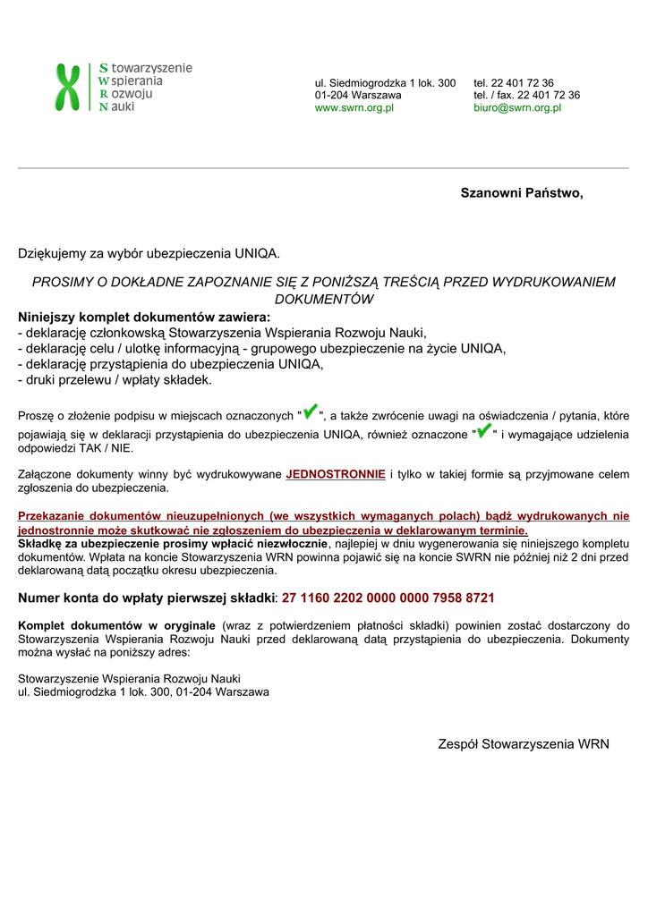ul. Siedmiogrodzka 1 lok. 300 01-204 Warszawa www.swrn.org.pl tel. 22 401 72 36 tel. / fax. 22 401 72 36 [email protected] Szanowni Państwo, Dziękujemy za wybór ubezpieczenia UNIQA. PROSIMY O DOKŁADNE ZAPOZNANIE SIĘ Z PONIŻSZĄ TREŚCIĄ PRZED WYDRUKOWANIEM DOKUMENTÓW Niniejszy komplet dokumentów zawiera: - deklarację członkowską Stowarzyszenia Wspierania Rozwoju Nauki, - deklarację celu / ulotkę informacyjną - grupowego ubezpieczenie na życie UNIQA, - deklarację przystąpienia do ubezpieczenia UNIQA, - druki przelewu / wpłaty składek. Proszę o złożenie podpisu w miejscach oznaczonych " ", a także zwrócenie uwagi na oświadczenia / pytania, które pojawiają się w deklaracji przystąpienia do ubezpieczenia UNIQA, również oznaczone " odpowiedzi TAK / NIE. " i wymagające udzielenia Załączone dokumenty winny być wydrukowywane JEDNOSTRONNIE i tylko w takiej formie są przyjmowane celem zgłoszenia do ubezpieczenia. Przekazanie dokumentów nieuzupełnionych (we wszystkich wymaganych polach) bądź wydrukowanych nie jednostronnie może skutkować nie zgłoszeniem do ubezpieczenia w deklarowanym terminie. Składkę za ubezpieczenie prosimy wpłacić niezwłocznie, najlepiej w dniu wygenerowania się niniejszego kompletu dokumentów. Wpłata na koncie Stowarzyszenia WRN powinna pojawić się na koncie SWRN nie później niż 2 dni przed deklarowaną datą początku okresu ubezpieczenia. Numer konta do wpłaty pierwszej składki: 27 1160 2202 0000 0000 7958 8721 Komplet dokumentów w oryginale (wraz z potwierdzeniem płatności składki) powinien zostać dostarczony do Stowarzyszenia Wspierania Rozwoju Nauki przed deklarowaną datą przystąpienia do ubezpieczenia. Dokumenty można wysłać na poniższy adres: Stowarzyszenie Wspierania Rozwoju Nauki ul. Siedmiogrodzka 1 lok. 300, 01-204 Warszawa Zespół Stowarzyszenia WRN DEKLARACJA CELU - GRUPOWE UBEZPIECZENIE NA ŻYCIE UNIQA Dlaczego warto przystąpić do ubezpieczenia... Ubezpieczenie skonstruowane jest na warunkach grupowego ubezpieczenia, a co za tym idzie wysokość opłacanej składki jest znacznie niższa niż w ubezpieczeniu indywidualnym. Karencje (okresy ograniczenia odpowiedzialności): - śmierć ubezpieczonego, rodziców/teściów, dziecka - 6 m-cy, poważne zachorowania ubezpieczonego - 6 m-cy, poważne zachorowania dziecka - 6 m-cy; pobyt w szpitalu ubezpieczonego - 3 m-ce; urodzenie dziecka/ciąża mnoga - 9 m-cy; operacje chirurgiczne - 6 m-cy; brak odpowiedzialności za operacje chirurgiczne planowane przed datą objęcia ochroną ubezpieczeniową; brak odpowiedzialności za śmierć ubezpieczonego, która nastąpiła w okresie 18 miesięcy od początku ochrony, w wyniku chorób zdiagnozowanych lub leczonych przed datą objęcia ochroną ubezpieczeniową. Karencje nie mają zastosowania do zdarzeń będących skutkiem NW. Zakres ubezpieczenia zgodny z OWU RODZINA & ODPOWIEDZIALNOŚĆ - GOP - 03 wraz z umowami dodatkowymi (OWUD) Skumulowane wysokości świadczeń : Zgon ubezpieczonego w wyniku: a) wypadku komunikacyjnego 175 000 zł b) nieszczęśliwego wypadku 85 000 zł d) choroby / śmierci naturalnej 40 000 zł Trwały uszczerbek na zdrowiu ubezpieczonego w wyniku NW - za 1% / za 100% 400 / 40 000 zł Poważne zachorowanie ubezpieczonego zawału serca, nowotwór, udar mózgu, niewydolności nerek, porażenia (paraplegia, tetraplegia), utraty wzroku, śpiączka, oparzenia, utrata mowy, utrata słuchu, guz mózgu, utrata kończyn, operacja bypass, przeszczep narządów, operacja zastawek serca, operacja aorty. Poddanie się operacji chirurgicznej przez ubezpieczonego (w zależności od klasy) 5 000 zł 4 200 / 3 000 / 1 800 / 900 / 300 / 120 Dzienne świadczenie szpitalne za: a) pobyt ubezpieczonego w szpitalu w wyniku wypadku/dzień (odpowiedzialność od 1 dnia pobytu) b) pobyt ubezpieczonego w szpitalu w wyniku choroby/dzień (min. pobyt 3 dni) 1-180dzień 150 zł 1-15 dzień - 80 zł 16-180 dzień - 40 zł 1-15 dzień - 200 zł 16-180 dzień - 100 zł c) OIOM - dodatkowo/dzień (odpow. od 1 dnia pobytu) DZIECI UBEZPIECZONEGO: 800 zł Urodzenie się dziecka ubezpieczonemu Urodzenie się dzieci ubezpieczonemu w wyniku ciąży mnogiej (za każde dziecko) 1 200 zł Urodzenie się martwego dziecka ubezpieczonemu 3 000 zł Zgon dziecka ubezpieczonemu 7 500 zł Osierocenie dziecka przez ubezpieczonego (dla każdego dziecka) 7 500 zł Osierocenie dziecka - jednoczesny zgon ubezpieczonego i jego współmałżonka 15 000 zł Poważne zachorowanie dziecka: nowotwór, niewydolność nerek, utrata wzroku, śpiączka, oparzenia, utrata mowy, utrata słuchu, utrata kończyn, dziecięce porażenie mózgowe, dystrofia mięśniowa, zespół Down'a, mukowiscydoza, pneumokokowe zapalenie opon mózgowo-rdzeniowych, przeszczep narządów, operacja zastawek serca 5 000 zł Trwały uszczerbek na zdrowiu dziecka w wyniku NW - za 1% / za 100% 150 / 15 000 zł RODZICE I TEŚCIOWIE UBEZPIECZONEGO: Zgon rodziców i teściów ubezpieczonego 1 800 zł Miesięczna składka łączna (w tym składka członkowska w wysokości 12 zł): Imię i nazwisko: 64 zł PESEL: Adres: Przystępując do proponowanego ubezpieczenia: jestem/byłem zatrudniony w: informację otrzymałem od: Oświadczam, że przed wyrażeniem zgody na przystąpienie do ubezpieczenia zostały mi dostarczone przez Stowarzyszenie WRN właściwe warunki ubezpieczenia na trwałym nośniku, za jaki uważa się plik pdf, płytę CD lub format drukowany. ............................................ data ................................................................. własnoręczny czytelny podpis Oświadczam, że jestem zainteresowany/a przystąpieniem od dnia ___ __/dzień__________/miesiąc____________/rok do ubezpieczenia proponowanego przez UNIQA TU na Życie S.A . Niniejszym zobowiązuję się wpłacać składkę łączną z góry (do 15 dnia każdego miesiąca) na konto bankowe w Stowarzyszeniu Wspierania Rozwoju Nauki, ul. Giełdowa 4A lok. 82, 01-211 Warszaw