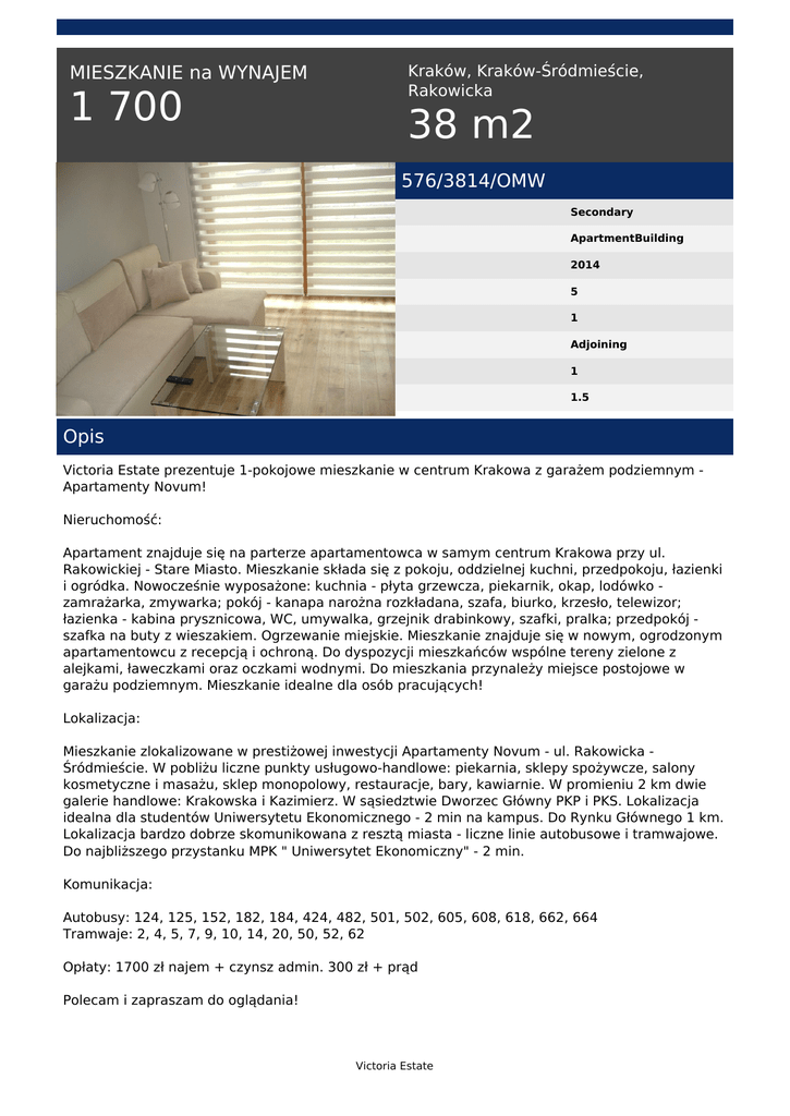 MIESZKANIE na WYNAJEM 1 700 Kraków, Kraków-Śródmieście, Rakowicka 38 m2 576/3814/OMW Secondary ApartmentBuilding 2014 5 1 Adjoining 1 1.5 Opis Victoria Estate prezentuje 1-pokojowe mieszkanie w centrum Krakowa z garażem podziemnym Apartamenty Novum! Nieruchomość: Apartament znajduje się na parterze apartamentowca w samym centrum Krakowa przy ul. Rakowickiej - Stare Miasto. Mieszkanie składa się z pokoju, oddzielnej kuchni, przedpokoju, łazienki i ogródka. Nowocześnie wyposażone: kuchnia - płyta grzewcza, piekarnik, okap, lodówko zamrażarka, zmywarka; pokój - kanapa narożna rozkładana, szafa, biurko, krzesło, telewizor; łazienka - kabina prysznicowa, WC, umywalka, grzejnik drabinkowy, szafki, pralka; przedpokój szafka na buty z wieszakiem. Ogrzewanie miejskie. Mieszkanie znajduje się w nowym, ogrodzonym apartamentowcu z recepcją i ochroną. Do dyspozycji mieszkańców wspólne tereny zielone z alejkami, ławeczkami oraz oczkami wodnymi. Do mieszkania przynależy miejsce postojowe w garażu podziemnym. Mieszkanie idealne dla osób pracujących! Lokalizacja: Mieszkanie zlokalizowane w prestiżowej inwestycji Apartamenty Novum - ul. Rakowicka Śródmieście. W pobliżu liczne punkty usługowo-handlowe: piekarnia, sklepy spożywcze, salony kosmetyczne i masażu, sklep monopolowy, restauracje, bary, kawiarnie. W promieniu 2 km dwie galerie handlowe: Krakowska i Kazimierz. W sąsiedztwie Dworzec Główny PKP i PKS. Lokalizacja idealna dla studentów Uniwersytetu Ekonomicznego - 2 min na kampus. Do Rynku Głównego 1 km. Lokalizacja bardzo dobrze skomunikowana z resztą miasta - liczne linie autobusowe i tramwajowe. Do najbliższego przystanku MPK " Uniwersytet Ekonomiczny" - 2 min. Komunikacja: Autobusy: 124, 125, 152, 182, 184, 424, 482, 501, 502, 605, 608, 618, 662, 664 Tramwaje: 2, 4, 5, 7, 9, 10, 14, 20, 50, 52, 62 Opłaty: 1700 zł najem + czynsz admin. 300 zł + prąd Polecam i zapraszam do oglądania! Victoria Estate Paulina Zajdel tel. +48 789 453 049 email: [email protected] Victoria Estate Powered by TCPDF (www.tcpdf.org)