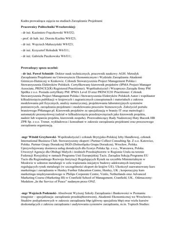 Kadra prowadząca zajęcia na studiach Zarządzanie Projektami Pracownicy Politechniki Wrocławskiej: - dr inż. Kazimierz Frączkowski W8/I32; - prof. dr hab. inż. Dorota Kuchta W8/I23; - dr inż. Wojciech Małuszyński W8/I23; - dr inż. Krzysztof Hołodnik W6/I11; - dr inż. Gabriela Paszkowska W6/I11; Prowadzący spoza uczelni: - dr inż. Paweł Schmidt- Doktor nauk technicznych, pracownik naukowy AGH. Metodyk Zarządzania Projektami na Uniwersytecie Ekonomicznym i Wydziale Zarządzania Akademii Górniczo-Hutniczej w Krakowie. Członek Stowarzyszenia Project Management Polska i Stowarzyszenia Elektryków Polskich. Certyfikowany kierownik projektów (IPMA Project Manager Associate, PRINCE2(R) Registered Practitioner). Współzałożyciel i Wiceprezes Zarządu firmy PM Spółka z o.o. Posiada certyfikaty PM: IPMA Level D oraz PRINCE2® Practitioner. Członek Stowarzyszenia Project Management Polska i Stowarzyszenia Elektryków Polskich Autor i współautor kilkudziesięciu publikacji w krajowych i zagranicznych czasopismach i materiałach z zakresu modelowania pól fizycznych, analizy numerycznej, projektowania laboratoryjnych systemów pomiarowych, zarządzania projektami i modelowania procesów biznesowych. Założyciel portalu branżowego PManager.pl. Kierownik projektów ze specjalizacją w branży IT oraz metrologii i automatyki przemysłowej (udział w kilkudziesięciu przedsięwzięciach jako kierownik projektu, nadzór lub wsparcie projektu, kierownik zespołu). Przewodniczący Rady Nadzorczej Huty Buczek HB ZPR Sp. z o.o. Trener, wykładowca i konsultant w zakresie zarządzania projektami oraz procesowego zarządzania organizacją. -mgr Witold Grzybowski- Współzałożyciel i członek Brytyjsko-Polskiej Izby Handlowej, członek International Business Club. Stowarzyszony ekspert i Partner Collect Consulting Sp. Z o.o. Katowice, Polska. Partner Grupy Doradczej DGD (Dolnośląska Grupa Doradcza), Wrocław, Polska. Uprzywilejowany dostawca usług doradczych dla Ecorys Polska Sp. z o.o., Warszawa, Polska. Utworzył Agencje dla Obsługi Małych i średnich Przedsiębiorstw w Regionie Uralu na terenie Federacji Rosyjskiej w ramach Programu Unii Europejskiej Tacis. Zarządza Sekcją Programu EU Tacis dla Regionalnego Rozwoju Instytucji Regulujących Rynek na szczeblu Ministerialnym w Moskwie w sektorze metalurgii w celu wspierania inicjatyw budowy adekwatnych instytucji regulujących rynek metalurgii (w szczególności eksport do krajów UE). Ukończył zaawansowany kurs marketingu i zarządzania w Henley Further Education Centre, Henley, UK ; korporacyjny kurs marketingu międzynarodowego w Philips Corporate Centre, Venlo, Netherlands oraz Advanced Marketing Course (Marketing III) w Cranfield School of Management, Cranfield, UK.. Odznaczony: Medalem „In the Service of Peace” nadanym przez ONZ. -mgr Wojciech Podemski- Absolwent Wyższej Szkoły Zarządzania i Bankowości w Poznaniu (magister – specjalizacja: zarządzanie przedsiębiorstwem), Akademii Ekonomicznej we Wrocławiu Studiów podyplomowych w zakresie zarządzania bhp (główny specjalista bhp) oraz wielu kursów doskonalących z zakresu zarządzania i audytowania systemów zarządzania, m.in. Toptech Studies: Systemy Zarządzania Ryzykiem i Bezpieczeństwem (TU Delft, Holandia), Zarządzanie wiedzą (Price Waterhous Coopers, Berlin, Niemcy), Global Networker: Przywództwo i zarządzanie zmianą (Akademia Junior ChamberInternational, Yamagata, Japonia), The Leading Edge (Franklin Covey Institute, Tampere, Finlandia). Audytor wiodący ISO 9001:2000 (Dekra, Wrocław, Polska), Audytor SZ BHP (DNV/ISRS/4098/PL), Lean Principles 2 (Cardiff Business School, Cardiff, Wlk. Brytania), kursy w zakresie systemów zarządzania ISO 9001, 14001, 18001 i ich integracji oraz systemu BRC/IOP(TÜV, Polska). Prowadzi działalność doradczą i szkoleniową dla firm i instytucji od ponad 15 lat. Właściciel specjalistycznej firmy doradczo szkoleniowej Systemax Podemski (rok założenia 1995). Ekspert BHP Centralnego Instytutu Ochrony Pracy – Państwowy Instytut Badawczy. Akredytowany ekspert PARP w programach UE. Członek Stowarzyszenia Project Management Polska (IPMA), członek Zarządu Oddziału Wrocławskiego Towarzystwa Nauk Organizacji i Kierowania (TNOiK), członek Rady Doradców Loży Dolnośląskiej BCC, członek Zespołu Koordynacyjnego Dolnośląskiej Rady Przedsiębiorczości i Nauki, członek Zespołu ds. Opieki Zdrowotnej Wojewódzkiej Komisji Dialogu Społecznego. Członek Rady OD NFZ. -mgr inż. Maksymilian Kowalczyk- Ukończył Informatykę na Wydziale Informatyki i Zarządzania Politechniki Wrocławskiej. Stypendysta na Universitat Autonoma de Barcelona. Specjalizuje się we planowaniu oraz zarządzaniu projektami wdrożeń systemów wsparcia obiegu informacji oraz zarządzania projektami. Microsoft Certified Trainer, Microsoft Certified IT Professional oraz Microsoft Certified Technology Specialist w obszarze Enterprise Project Management. Trener z wieloletnim doświadczeniem w zakresie prowadzenia szkoleń w obszarze systemów informatycznych wsparcia zarządzania projektami. Szkolił kierowników projektów kilkudziesięciu firm z sektora bankowego, IT, energetyki i przemysłu oraz licznych instytucji publicznych. Aktualnie pełni funkcję wiceprezesa zarządu IT-Dev Sp. z o.o., gdzie odpowiada za wdrożenia rozwiązań informatycznych dla klientów z sektora finansowego, administracji publicznej i energetyki. -mgr inż. Łukasz Sienkiewicz- absolwent Politechniki Wrocławskiej na kierunku Informatyka, specjalność- Inżynieria oprogramowania. Obecnie doktorant na Uniwersytecie Ekonomicznym we Wrocławiu. Certyfikat IPMA na poziomie C i D. Certyfikowany Scrum Master - szkolenie dające certyfikat renomowanej grupy Scrum Alliance uprawniający do legitymowania się certyfikatem Scrum Master'a. Odbyty kurs pedagogiczny dla czynnych zawodowo nauczycieli po którym uzyskał uprawnienia pedagogiczne do prowadzenia zaj