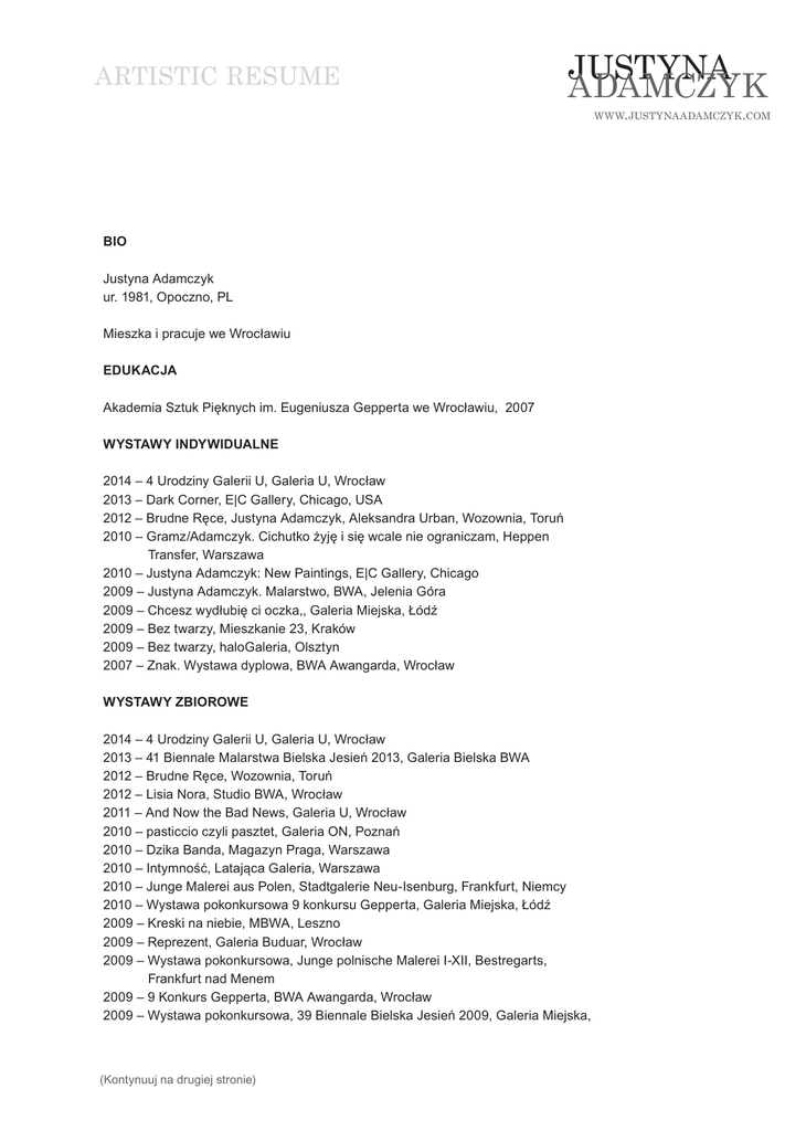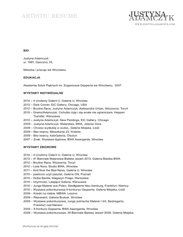 artistic resume justyna adamczyk www.justynaadamczyk.com BIO Justyna Adamczyk ur. 1981, Opoczno, PL Mieszka i pracuje we Wrocławiu EDUKACJA Akademia Sztuk Pięknych im. Eugeniusza Gepperta we Wrocławiu, 2007 WYSTAWY INDYWIDUALNE 2014 – 4 Urodziny Galerii U, Galeria U, Wrocław 2013 – Dark Corner, E|C Gallery, Chicago, USA 2012 – Brudne Ręce, Justyna Adamczyk, Aleksandra Urban, Wozownia, Toruń 2010 – Gramz/Adamczyk. Cichutko żyję i się wcale nie ograniczam, Heppen Transfer, Warszawa 2010 – Justyna Adamczyk: New Paintings, E|C Gallery, Chicago 2009 – Justyna Adamczyk. Malarstwo, BWA, Jelenia Góra 2009 – Chcesz wydłubię ci oczka,, Galeria Miejska, Łódź 2009 – Bez twarzy, Mieszkanie 23, Kraków 2009 – Bez twarzy, haloGaleria, Olsztyn 2007 – Znak. Wystawa dyplowa, BWA Awangarda, Wrocław WYSTAWY ZBIOROWE 2014 – 4 Urodziny Galerii U, Galeria U, Wrocław 2013 – 41 Biennale Malarstwa Bielska Jesień 2013, Galeria Bielska BWA 2012 – Brudne Ręce, Wozownia, Toruń 2012 – Lisia Nora, Studio BWA, Wrocław 2011 – And Now the Bad News, Galeria U, Wrocław 2010 – pasticcio czyli pasztet, Galeria ON, Poznań 2010 – Dzika Banda, Magazyn Praga, Warszawa 2010 – Intymność, Latająca Galeria, Warszawa 2010 – Junge Malerei aus Polen, Stadtgalerie Neu-Isenburg, Frankfurt, Niemcy 2010 – Wystawa pokonkursowa 9 konkursu Gepperta, Galeria Miejska, Łódź 2009 – Kreski na niebie, MBWA, Leszno 2009 – Reprezent, Galeria Buduar, Wrocław 2009 – Wystawa pokonkursowa, Junge polnische Malerei I-XII, Bestregarts, Frankfurt nad Menem 2009 – 9 Konkurs Gepperta, BWA Awangarda, Wrocław 2009 – Wystawa pokonkursowa, 39 Biennale Bielska Jesień 2009, Galeria Miejska, (Kontynuuj na drugiej stronie) artistic resume justyna adamczyk www.justynaadamczyk.com Bielsko Biała 2008 – Wystawa pokonkursowa, Ogólnopolskie Biennale Malarstwa i Tkaniny Unikatowej, Muzeum Miejskie, Gdynia 2008 – Most Sztuki, Galeria Info i Youngs Gallery, Warszawa 2008 – Rozmówki polsko-polskie, Galeria EMDES, Wrocław 2008 – De Immundo, BWA Studio, Wrocław 2008 – Obrazy muzyką malowane, Fundacja Kultury im. Ignacego Jana Paderewskiego, Kraków 2008 – 30 Premio Internacional de Pintura de Caja de Extremadura Aula de Cultura de Plasencia, Hiszpania/Portugalia 2007 – Wystawa pokonkursowa. Promocje. 17 Przegląd Malarstwa Młodych, Legnica 2006 – Wystawa zbiorowa, Galeria na Czystej, Wrocław 2006 – Wild Thing, Studio BWA, Wrocław 2006 – Sakrum i Płeć, Galeria Wzgórze Zamkowe, Lubin 2006 – Rozmówki polsko-polskie, Galeria BCK, Brzeg 2006 – Survival 4, Dworzec Główny PKP, Wrocław 2006 – More or Less, Musemu da Ciencia e da Industria, Porto, Portugalia 2006 – Włos, Galeria Sputnik, Wrocław 2005 – Survival 3, Browar Mieszczański Wrocław 2005 – 500% sztuki, Studio BWA Wrocław, Rozbrat, Poznań 2005 – Wrocław NonStop, Browar Mieszczański Wrocław TARGI SZTUKI 2011 - Vienna Art Fair, Wiedeń 2010 – Najlepsze kasztany są na Palcu Pigalle ( z Heppen Transfer Gallery), Warszawa NAGRODY I WYRÓŻNIENIA 2010 – Nominowana do 9 Konkursu Gepperta pt. Malarstwo. Bez ram. 2007 – Wyróżnienie w 17 Przeglądzie Malarstwa Młodych Promocje, Legnica 2005 – Laureatka Stypendium Ministra Kultury i Dziedzictwa Narodowego (2005/2006)