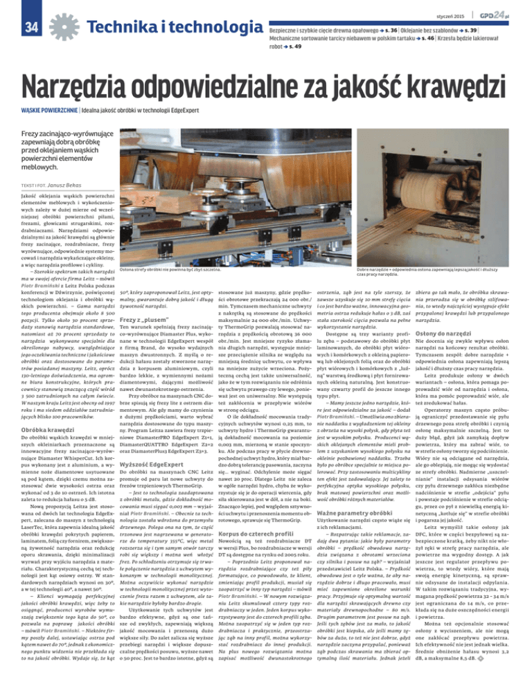 styczeń 2015 34 Technika i technologia Bezpieczne i szybkie cięcie drewna opałowego â s. 36 | Oklejanie bez szablonów â s. 39 | Mechaniczne sortowanie tarcicy niebawem w polskim tartaku â s. 46 | Krzesła będzie lakierował robot â s. 49 Narzędzia odpowiedzialne za jakość krawędzi WĄSKIE POWIERZCHNIE | Idealna jakość obróbki w technologii EdgeExpert Frezy zacinająco-wyrównujące zapewniają dobrą obróbkę przed oklejaniem wąskich powierzchni elementów meblowych. TEKST I FOT. Janusz Bekas Jakość oklejania wąskich powierzchni elementów meblowych i wykończeniowych zależy w dużej mierze od wcześniejszej obróbki powierzchni piłami, frezami, głowicami strugarskimi, rozdrabniaczami. Narzędziami odpowiedzialnymi za jakość krawędzi są głównie frezy zacinające, rozdrabniacze, frezy wyrównujące, odpowiednie systemy mocowań i narzędzia wykańczające okleiny, a więc narzędzia profilowe i cykliny. – Szerokie spektrum takich narzędzi ma w swojej ofercie firma Leitz – mówił Piotr Bramiński z Leitz Polska podczas konferencji w Dźwirzynie, poświęconej technologiom oklejania i obróbki wąskich powierzchni. – Gama narzędzi tego producenta obejmuje około 8 500 pozycji. Tylko około 30 procent sprzedaży stanowią narzędzia standardowe, natomiast aż 70 procent sprzedaży to narzędzia wykonywane specjalnie dla określonego nabywcy, uwzględniające jego oczekiwania techniczne i jakościowe obróbki oraz dostosowane do parametrów posiadanej maszyny. Leitz, oprócz 130-letniego doświadczenia, ma ogromne biura konstrukcyjne, których pracownicy stanowią znaczącą część wśród 3 500 zatrudnionych na całym świecie. W naszym kraju Leitz jest obecny od 1997 roku i ma siedem oddziałów zatrudniających blisko 100 pracowników. Obróbka krawędzi Do obróbki wąskich krawędzi w mniejszych okleiniarkach przeznaczone są innowacyjne frezy zacinająco-wyrównujące Diamaster WhisperCut. Ich korpus wykonany jest z aluminium, a wymienne noże diamentowe usytuowane są pod kątem, dzięki czemu można zastosować dwie wysokości ostrza oraz wykonać od 3 do 10 ostrzeń. Ich istotna zaleta to redukcja hałasu o 5 dB. Nową propozycją Leitza jest stosowana od dwóch lat technologia EdgeExpert, zalecana do maszyn z technologią LaserTec, która zapewnia idealną jakość obróbki krawędzi pokrytych papierem, laminatem, folią czy fornirem, zwiększoną żywotność narzędzia oraz redukcję oporu skrawania, dzięki minimalizacji wyrwań przy wyjściu narzędzia z materiału. Charakterystyczną cechą tej technologii jest kąt osiowy ostrzy. W standardowych narzędziach wynosi on 30º, a w tej technologii 40º, a nawet 50º. – Klienci wymagają perfekcyjnej jakości obróbki krawędzi, więc żeby to osiągnąć, producenci wyrobów wymuszają zwiększenie tego kąta do 50º, co pozwala na poprawę jakości obróbki – mówił Piotr Bramiński. – Niektóre firmy poszły dalej, ustawiając ostrza pod kątem nawet do 70º, jednak z ekonomicznego punktu widzenia nie przekłada się to na jakość obróbki. Wydaje się, że kąt Osłona strefy obróbki nie powinna być zbyt szczelna. stosowane już maszyny, gdzie prędkości obrotowe przekraczają 24 000 obr./ min. Tymczasem mechaniczne uchwyty z nakrętką są stosowane do prędkości maksymalnie 24 000 obr./min. UchwyFrezy z „plusem” Ten warunek spełniają frezy zacinają- ty ThermoGrip pozwalają stosować naco-wyrównujące Diamaster Plus, wyko- rzędzia z prędkością obrotową 36 000 nane w technologii EdgeExpert wespół obr./min. Jest mniejsze ryzyko złamaz firmą Brand, do wysoko wydajnych nia długich narzędzi, występuje mniejmaszyn dwustronnych. Z myślą o re- sze przeciążenie silnika ze względu na dukcji hałasu zostały stworzone narzę- mniejszą średnicę uchwytu, co wpływa dzia z korpusem aluminiowym, czyli na mniejsze zużycie wrzeciona. Pożybardzo lekkie, z wymiennymi nożami teczną cechą jest także uniwersalność, diamentowymi, dającymi możliwość jako że w tym rozwiązaniu nie odróżnia się uchwytu prawego czy lewego, ponienawet dwunastokrotnego ostrzenia. Przy obróbce na maszynach CNC do- waż jest on uniwersalny. Nie występują brze spisują się frezy lite z ostrzem dia- też zakłócenia w przepływie wiórów mentowym. Ale gdy mamy do czynienia w stronę odciągu. z dużymi prędkościami, warto wybrać O ile dokładność mocowania tradynarzędzia dostosowane do typu maszy- cyjnych uchwytów wynosi 0,25 mm, to ny. Program Leitza zawiera frezy trzpie- uchwyty hydro i ThermoGrip gwarantuniowe DiamasterPRO EdgeExpert Z1+1, ją dokładność mocowania na poziomie DiamasterQUATTRO EdgeExpert Z2+2 0,003 mm, mierzoną w stanie spoczynku. Ale podczas pracy w płycie drewnooraz DiamasterPlus3 EdgeExpert Z3+3. pochodnej uchwyt hydro, który miał bardzo dobrą tolerancję pasowania, zaczyna Wyższość EdgeExpert Do obróbki na maszynach CNC Leitz się… wyginać. Odchylenie może sięgać promuje od paru lat nowe uchwyty do nawet 20 proc. Dlatego Leitz nie zaleca w ogóle narzędzi hydro, chyba że wykofrezów trzpieniowych ThermoGrip. – Jest to technologia zaadaptowana rzystuje się je do operacji wiercenia, gdy z obróbki metalu, gdzie dokładność mo- siła skierowana jest w dół, a nie na boki. cowania musi sięgać 0,003 mm – wyjaś- Znacząco lepiej, pod względem sztywnoniał Piotr Bramiński. – Obecnie ta tech- ści uchwytu i przenoszenia momentu obnologia została wdrożona do przemysłu rotowego, sprawuje się ThermoGrip. drzewnego. Polega ona na tym, że część trzonowa jest nagrzewana w generato- Korpus do czterech profili rze do temperatury 355ºC, więc metal Nowością są też rozdrabniacze DT rozszerza się i tym samym otwór tarczy w wersji Plus, bo rozdrabniacze w wersji robi się większy i można weń włożyć DT są dostępne na rynku od 2005 roku. – Poprzednio Leitz proponował nafrez. Po schłodzeniu otrzymuje się 