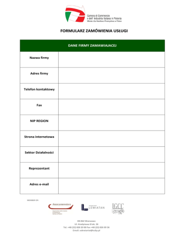 FORMULARZ ZAMÓWIENIA USŁUGI DANE FIRMY ZAMAWIAJACEJ Nazwa firmy Adres firmy Telefon kontaktowy Fax NIP REGION Strona internetowa Sektor Działalności Reprezentant Adres e-mail MEMBER OF: 00-062 Warszawa Ul. Kredytowa 8 lok. 26 Tel. +48 (22) 828 20 08 Fax +48 (22) 826 09 36 Email: [email protected] ZAMÓWIONA OFERTA CENA NETTO CENA BRUTTO 500, 00 PLN 615, 00 PLN 2 000, 00 PLN 2 460, 00 PLN Faza nr 1: Poszukiwanie partnerów- lista firm • • • Wyszukanie firm z wybranego sektora Selekcja firm zgodnych z pożądanym profilem Opracowanie listy firm( 15- 20 pozycji), która zawiera: adres firmy, telefon kontaktowy, fax, adres e-mail, stronę internetową Faza nr 2: Poszukiwanie partnerów- lista potencjalnych kontaktów • • • Przygotowanie mailingu do firm, które zostały wyselekcjonowane w fazie nr 1 i wysłanie prezentacji Państwa firmy Telefoniczna weryfikacja zainteresowania wśród wybranych firm oraz prowadzenie stałych działań w ramach follow up’u Opracowanie danych (adres firmy, telefon kontaktowy, adres e-mail, strona internetowa) firm, które potencjalnie są zainteresowane nawiązaniem współpracy Wsparcie prawnika i konsultanta W cenę nie są wliczone ewentualne koszty przejazdu, zakwaterowania, wyżywienia Wsparcie polsko- włoskiego prawnika obecnego w trakcie spotkania 60, 00 EUR\ godz. 73, 80 EUR\ godz. Wsparcie polsko- włoskiego konsultanta obecnego w trakcie spotkania w Polsce 500, 00 PLN\ dzień 615, 00 PLN\ dzień Wsparcie polsko- włoskiego konsultanta obecnego w trakcie spotkania we Włoszech 200, 00 EUR\ dzień 246, 00 EUR\ dzień USŁUGA WARUNKI UMOWY: 1. Zamawiający zobowiązuje się do wpłacenia 100% sumy i przesłania potwierdzenia wpłaty pod nr fax 0048 022 8260936. 2. Wpłata dokonywana jest bezpośrednio na konto CCIIP: Włoska Izba Handlowo-Przemysłowa w Polsce Ul. Kredytowa 8 lok. 26 00- 062 Warszawa Bank PEKAO S.A. PL 63 1240 1066 1111 0000 0006 5360 SWIFT: PKOPPLPW . 3. Usługa zostanie wykonana w czasie i na warunkach ustalonych w zależności od usługi. 4. Faktura zostanie przesłana pocztą. 5. CCIIP nie ponosi odpowiedzialności za ewentualne spory czy błędy ze strony wskazanych firm. …………………………………………. …………………………………………. DATA PODPIS I PIECZĘĆ ZAMAWIAJĄCEGO NALEŻY PRZESŁAĆ DO: CAMERA DI COMMERCIO E DELL' INDUSTRIA ITALIANA IN POLONIA WŁOSKA IZBA HANDLOWO - PRZEMYSŁOWA W POLSCE ul. Kredytowa 8 lok. 26 00-062 Warszawa tel.: +48 22 828 20 08 fax: +48 22 826 09 36 e-mail: [email protected]