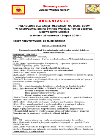 Stowarzyszenie „Mamy Wielkie Serca” ___________________________________________________________________________________ O R G A N I Z U J E: PÓŁKOLONIE DLA DZIECI I MŁODZIEŻY NA BAZIE SOSW W STEMPLEWIE, gmina Świnice Warckie, Powiat Łęczyca, województwo Łódzkie w dniach 28 czerwca – 9 lipca 2010 r. KOSZT POBYTU WYNOSI 25 ZŁ OD DZIECKA PROGRAM PÓŁKOLONII Program ulega modyfikacji i uatrakcyjnieniu w zależności od pogody i dodatkowo pozyskiwanych funduszy . Poniedziałek, 28.06.2010 r. 8.00 - 9.00 – zbiórka dzieci i młodzieży 9.00 – 11.30 – podział na grupy i drużyny, przydział opiekunów. Wykonanie totemu-znaku grupy. 11.30 – 13.00 – zajęcia integracyjne „Poznajemy się” , zapoznanie z pomieszczeniami i terenem. Regulaminy , prawa i obowiązki. Deser na powitanie lata – lody z truskawkami i bitą śmietaną. 13.00 – 14.00 – Zajęcia w terenie – podchody – przecieramy szlaki 14.00-14.30 Obiad – relaks po posiłku 14.30 – 16.30 – Spotkanie z językiem angielskim / zajęcia rozpoznawcze-podział na 2 grupy w zależności od poziomu umiejętności/ 15.00-16.00 Spotkanie z językiem angielskim / zajęcia rozpoznawcze-podział na 2 grupy w zależności od poziomu umiejętności/ Wtorek, 8.00 – 9.00 – zajęcia integracyjno- świetlicowe / schodzenie się dzieci do świetlicy/ 9.00 – 13.00 –konkurs SANEPIDU – ZDROWE I AKTYWNE WAKACJE: Rysunki tematyczne- indywidualne Hasła prozdrowotne i krzyżówka - grupowe Zawody sportowe z nagrodami 13.00-14.00- nauka komunikacji w języku angielskim/ w grupach po 1 godzinie / Powitania , pożegnania i kilka rozmówek o sobie i swojej rodzinie. 14.00 – 14.30 – Obiad, relaks po obiedzie – słuchamy muzyki, zajęcia relaksacyjne, 14.30 – 15.30 – nauka komunikacji w języku angielskim/ w grupach po 1 godzinie / Powitania , pożegnania i kilka rozmówek o sobie i swojej rodzinie. Zajęcia w grupach wymiennie ze spotkaniami z komputerem- projektowanie i wykonanie tabeli punktów i wyników na czas półkolonii/ indywidualnej i grupowej. Przygotowanie do pozytywnej rywalizacji z różnych dziedzin. Środa, 8.00 – 9.00 – zajęcia integracyjno – ruchowe /schodzenie się dzieci do świetlicy/ 9.00 - 11.00– nauka komunikacji w języku angielskim/ w grupach po 1 godzinie / Świat kolorów i pór roku . 11.00 – 15.00 Wycieczka do Uniejowa na basen – Wody Termalne . Zwiedzanie parku i zabytków. Nauka pływania na basenie, korzystanie z kąpieli w solance-Zdrowo i bezpiecznie / karta wycieczki + zgoda rodzica/ 15.00-15.30- obiad i relaks muzyczny po obiedzie Czwartek, 8.00 – 9.00 – zajęcia integracyjno- świetlicowe – gry planszowe /schodzenie się dzieci do świetlicy / 9.00 - 11.00 – konkursy sprawnościowe w integracji z młodzieżą niepełnosprawną „Razem się bawimy i wspieramy. 11.00 – 13.00 – spotkanie na padoku z końmi, przejażdżki konne. Rysunki konia z natury/ prace plenerowe z wykorzystaniem sztalug, podkładek/ 13.00 – 14.00- Obiad, wypoczynek, wspólne czytanie wybranej baśni. 14.00 – 16.00 – komunikacja w języku angielskim- Świat wokół nas - słówka- i nauka piosenki Na farmie . 2 grupy naprzemiennie z zajęciami w pracowni komputerowej- konkurs w pisaniu – Mistrz Klawiatury. Piątek, 8.00 – 9.00 – zajęcia integracyjne- przygotowywanie zadań i zagadek ekologicznych przez grupy. /schodzenie się dzieci do świetlicy / 9.00 – 13.00 – W lesie- zabawy harcerskie, gry terenowe, metody harcerskie połączone z zadaniami ekologicznymi. 13.00 – 14.00 – obiad i wypoczynek 14.00 – 16.00 – nauka języka angielskiego- Dni, tygodnie, godziny. Proste rozmówki. Sobota 8.00- 16.00 wyjazd do Łodzi / ZOO, Ogród Botaniczny, spacer Piotrkowską i Mac Donald Poniedziałek, 8.00 – 9.00 – zajęcia integracyjne – rysunki naszych emocji /schodzenie się dzieci do świetlicy 9.00 – 11.30 – zajęcia ekologiczne- układanki, hasła, porządkowanie skalnika i pomnika przyrody, projektowanie i wykonanie strojów ekologicznych połączonych z pokazem mody 11.30 – 13.00 – Ekologiczna dyskoteka- pląsy i tance przy muzyce. 13.00 – 14.00 – Obiad- wypoczynek- czytamy wspólnie Kubusia Puchatka. 14.00 – 16.00 – nauka języka angielskiego – Ubiór i moda. 2 grupy zamiennie z zajęciami w pracowni komputerowej. Szukamy w Internecie informacji o naszej miejscowości. Przygotowanie i opracowanie trasy na wycieczkę rowerową. Wtorek, 8.00 – 9.00 –zajecia integracyjne- gimnastyka poranna/ schodzenie się dzieci do świetlicy/ 9.00 – 11.00 – Zdrowie i bezpieczeństwo- zajęcia z pierwszej pomocy przedmedycznej- film , spotkanie z ratownikami, warsztaty praktyczne. 11.00 – 13.00 – Spotkanie z koniem, przejażdżki bryczką, zabawy sprawnościowe na placu zabaw i boisku. Rysunek kolorowa kredą na asfalcie. 13.00 – 14.00 – Obiad – wypoczynek przy muzyce 14.00 – 16.00 – nauka języka angielskiego – W sklepie- jak zrobić zakupy2 grupy naprzemiennie z konkursem plastycznym na plakat związany z bezpieczeństwem, zdrowiem i pierwsza pomocą. Środa, 8.00 – 9.00 – zajęcia integracyjne- przypomnienie regulaminów i zasad obowiązujących na wycieczce 9.00 – 13.00 – Rajd rowerowy do dworku Marii Konopnickiej w Gusinie oraz domu Św. Faustyny Kowalskiej: Stemplew – Świnice Warckie-Głogowiec-Gusin 13.00 – 14.00 – obiad – wypoczynek 14.00 – 16.00 – nauka języka angielskiego – Układanie obrazków przestrzennych zgodnie z instrukcją / To jest mój pokój/. Zajęcia naprzemiennie z zajęciami w pracowni komputerowej- Robimy kartkę do kroniki z wycieczki- zdjęcia i informacje. Czwartek, 8.00 – 9.00 –zajęcia integracyjne- zabawy w kręgu/ schodzenie się dzieci do świetlicy/ 9.00 – 11.00 – gry zespołowe: mecze w piłkę nożną, koszykową, ringo, itp. Konkurs fair play 11.00 – 13.00 – nauka języka angielskiego – Mówimy o sporcie.2 grupy naprzemiennie z konkursem plastycznym 