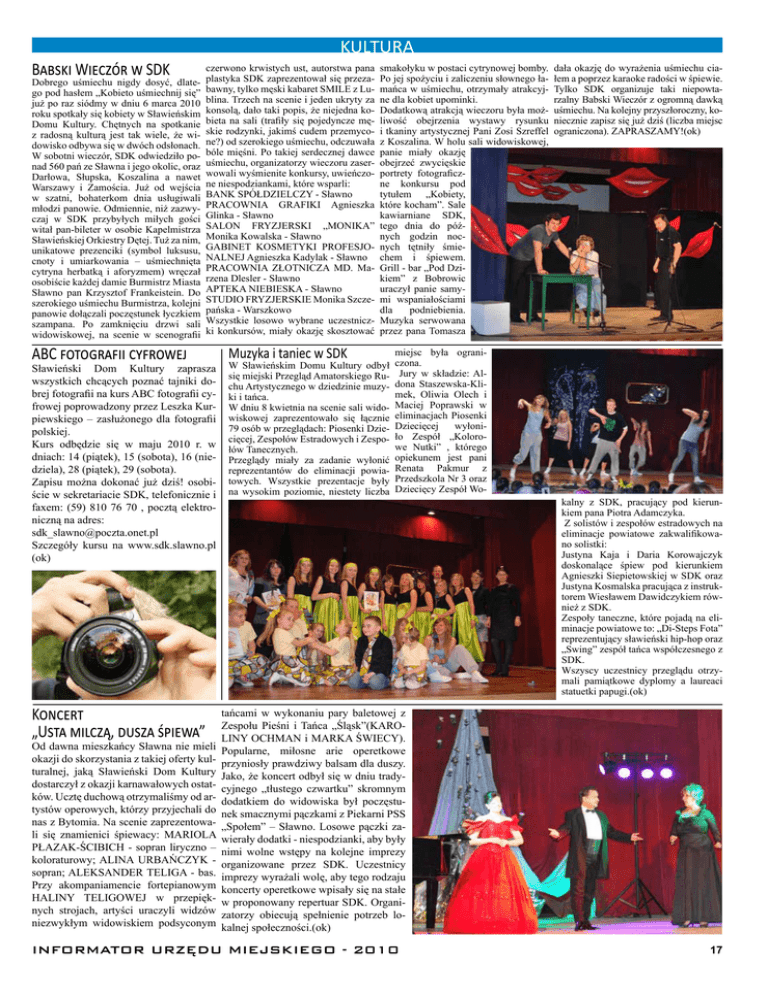 KULTURA Babski Wieczór w SDK Dobrego uśmiechu nigdy dosyć, dlatego pod hasłem „Kobieto uśmiechnij się” już po raz siódmy w dniu 6 marca 2010 roku spotkały się kobiety w Sławieńskim Domu Kultury. Chętnych na spotkanie z radosną kulturą jest tak wiele, że widowisko odbywa się w dwóch odsłonach. W sobotni wieczór, SDK odwiedziło ponad 560 pań ze Sławna i jego okolic, oraz Darłowa, Słupska, Koszalina a nawet Warszawy i Zamościa. Już od wejścia w szatni, bohaterkom dnia usługiwali młodzi panowie. Odmiennie, niż zazwyczaj w SDK przybyłych miłych gości witał pan-bileter w osobie Kapelmistrza Sławieńskiej Orkiestry Dętej. Tuż za nim, unikatowe prezenciki (symbol luksusu, cnoty i umiarkowania – uśmiechnięta cytryna herbatką i aforyzmem) wręczał osobiście każdej damie Burmistrz Miasta Sławno pan Krzysztof Frankeistein. Do szerokiego uśmiechu Burmistrza, kolejni panowie dołączali poczęstunek łyczkiem szampana. Po zamknięciu drzwi sali widowiskowej, na scenie w scenografii czerwono krwistych ust, autorstwa pana plastyka SDK zaprezentował się przezabawny, tylko męski kabaret SMILE z Lublina. Trzech na scenie i jeden ukryty za konsolą, dało taki popis, że niejedna kobieta na sali (trafiły się pojedyncze męskie rodzynki, jakimś cudem przemycone?) od szerokiego uśmiechu, odczuwała bóle mięśni. Po takiej serdecznej dawce uśmiechu, organizatorzy wieczoru zaserwowali wyśmienite konkursy, uwieńczone niespodziankami, które wsparli: BANK SPÓŁDZIELCZY - Sławno PRACOWNIA GRAFIKI Agnieszka Glinka - Sławno SALON FRYZJERSKI „MONIKA” Monika Kowalska - Sławno GABINET KOSMETYKI PROFESJONALNEJ Agnieszka Kadylak - Sławno PRACOWNIA ZŁOTNICZA MD. Marzena Dlesler - Sławno APTEKA NIEBIESKA - Sławno STUDIO FRYZJERSKIE Monika Szczepańska - Warszkowo Wszystkie losowo wybrane uczestniczki konkursów, miały okazję skosztować ABC fotografii cyfrowej Sławieński Dom Kultury zaprasza wszystkich chcących poznać tajniki dobrej fotografii na kurs ABC fotografii cyfrowej poprowadzony przez Leszka Kurpiewskiego – zasłużonego dla fotografii polskiej. Kurs odbędzie się w maju 2010 r. w dniach: 14 (piątek), 15 (sobota), 16 (niedziela), 28 (piątek), 29 (sobota). Zapisu można dokonać już dziś! osobiście w sekretariacie SDK, telefonicznie i faxem: (59) 810 76 70 , pocztą elektroniczną na adres: [email protected] Szczegóły kursu na www.sdk.slawno.pl (ok) Koncert „Usta milczą, dusza śpiewa” Od dawna mieszkańcy Sławna nie mieli okazji do skorzystania z takiej oferty kulturalnej, jaką Sławieński Dom Kultury dostarczył z okazji karnawałowych ostatków. Ucztę duchową otrzymaliśmy od artystów operowych, którzy przyjechali do nas z Bytomia. Na scenie zaprezentowali się znamienici śpiewacy: MARIOLA PŁAZAK-ŚCIBICH - sopran liryczno – koloraturowy; ALINA URBAŃCZYK sopran; ALEKSANDER TELIGA - bas. Przy akompaniamencie fortepianowym HALINY TELIGOWEJ w przepięknych strojach, artyści uraczyli widzów niezwykłym widowiskiem podsyconym Muzyka i taniec w SDK smakołyku w postaci cytrynowej bomby. Po jej spożyciu i zaliczeniu słownego łamańca w uśmiechu, otrzymały atrakcyjne dla kobiet upominki. Dodatkową atrakcją wieczoru była możliwość obejrzenia wystawy rysunku i tkaniny artystycznej Pani Zosi Szreffel z Koszalina. W holu sali widowiskowej, panie miały okazję obejrzeć zwycięskie portrety fotograficzne konkursu pod tytułem „Kobiety, które kocham”. Sale kawiarniane SDK, tego dnia do późnych godzin nocnych tętniły śmiechem i śpiewem. Grill - bar „Pod Dzikiem” z Bobrowic uraczył panie samymi wspaniałościami dla podniebienia. Muzyka serwowana przez pana Tomasza W Sławieńskim Domu Kultury odbył się miejski Przegląd Amatorskiego Ruchu Artystycznego w dziedzinie muzyki i tańca. W dniu 8 kwietnia na scenie sali widowiskowej zaprezentowało się łącznie 79 osób w przeglądach: Piosenki Dziecięcej, Zespołów Estradowych i Zespołów Tanecznych. Przeglądy miały za zadanie wyłonić reprezentantów do eliminacji powiatowych. Wszystkie prezentacje były na wysokim poziomie, niestety liczba dała okazję do wyrażenia uśmiechu ciałem a poprzez karaoke radości w śpiewie. Tylko SDK organizuje taki niepowtarzalny Babski Wieczór z ogromną dawką uśmiechu. Na kolejny przyszłoroczny, koniecznie zapisz się już dziś (liczba miejsc ograniczona). ZAPRASZAMY!(ok) miejsc była ograniczona. Jury w składzie: Aldona Staszewska-Klimek, Oliwia Olech i Maciej Poprawski w eliminacjach Piosenki Dziecięcej wyłoniło Zespół „Kolorowe Nutki” , którego opiekunem jest pani Renata Pakmur z Przedszkola Nr 3 oraz Dziecięcy Zespół Wokalny z SDK, pracujący pod kierunkiem pana Piotra Adamczyka. Z solistów i zespołów estradowych na eliminacje powiatowe zakwalifikowano solistki: Justyna Kaja i Daria Korowajczyk doskonalące śpiew pod kierunkiem Agnieszki Siepietowskiej w SDK oraz Justyna Kosmalska pracująca z instruktorem Wiesławem Dawidczykiem również z SDK. Zespoły taneczne, które pojadą na eliminacje powiatowe to: „Di-Steps Fota” reprezentujący sławieński hip-hop oraz „Swing” zespół tańca współczesnego z SDK. Wszyscy uczestnicy przeglądu otrzymali pamiątkowe dyplomy a laureaci statuetki papugi.(ok) tańcami w wykonaniu pary baletowej z Zespołu Pieśni i Tańca „Śląsk”(KAROLINY OCHMAN i MARKA ŚWIECY). Popularne, miłosne arie operetkowe przyniosły prawdziwy balsam dla duszy. Jako, że koncert odbył się w dniu tradycyjnego „tłustego czwartku” skromnym dodatkiem do widowiska był poczęstunek smacznymi pączkami z Piekarni PSS „Społem” – Sławno. Losowe pączki zawierały dodatki - niespodzianki, aby były nimi wolne wstępy na kolejne imprezy organizowane przez SDK. Uczestnicy imprezy wyrażali wolę, aby tego rodzaju koncerty operetkowe wpisały się na stałe w proponowany repertuar SDK. Organizatorzy obiecują spełnienie potrzeb lokalne