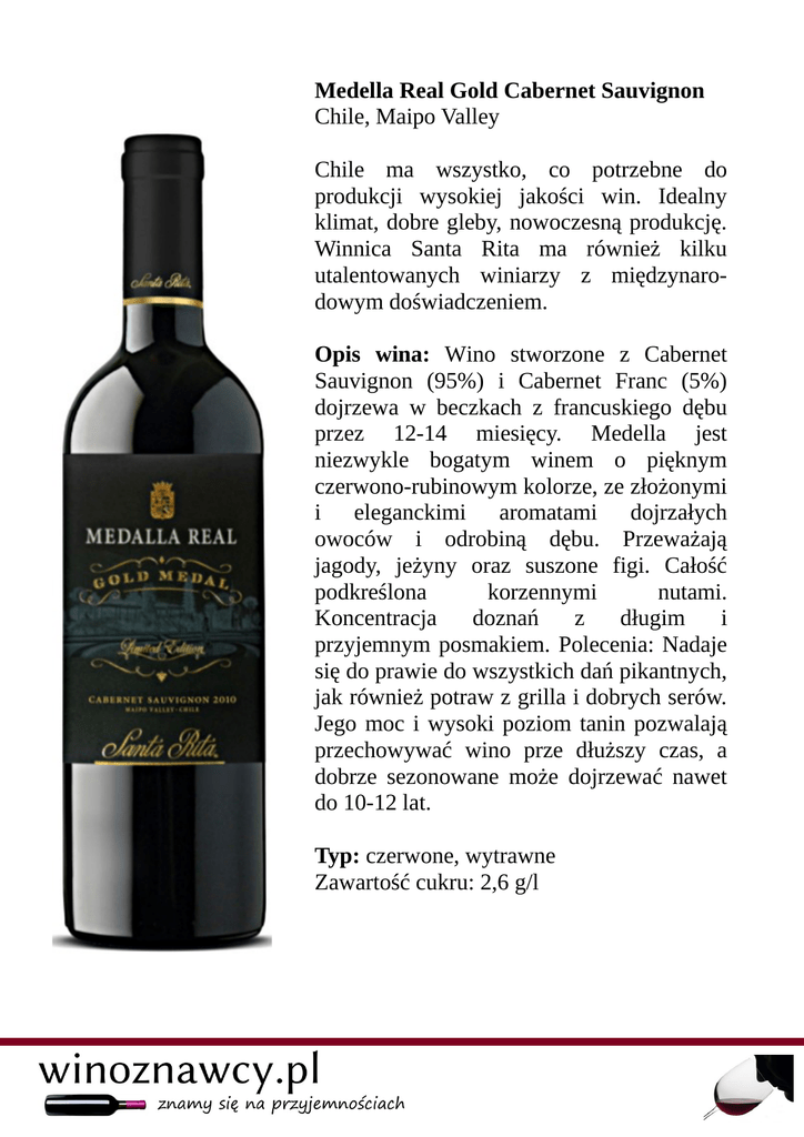 Medella Real Gold Cabernet Sauvignon Chile, Maipo Valley Chile ma wszystko, co potrzebne do produkcji wysokiej jakości win. Idealny klimat, dobre gleby, nowoczesną produkcję. Winnica Santa Rita ma również kilku utalentowanych winiarzy z międzynarodowym doświadczeniem. Opis wina: Wino stworzone z Cabernet Sauvignon (95%) i Cabernet Franc (5%) dojrzewa w beczkach z francuskiego dębu przez 12-14 miesięcy. Medella jest niezwykle bogatym winem o pięknym czerwono-rubinowym kolorze, ze złożonymi i eleganckimi aromatami dojrzałych owoców i odrobiną dębu. Przeważają jagody, jeżyny oraz suszone figi. Całość podkreślona korzennymi nutami. Koncentracja doznań z długim i przyjemnym posmakiem. Polecenia: Nadaje się do prawie do wszystkich dań pikantnych, jak również potraw z grilla i dobrych serów. Jego moc i wysoki poziom tanin pozwalają przechowywać wino prze dłuższy czas, a dobrze sezonowane może dojrzewać nawet do 10-12 lat. Typ: czerwone, wytrawne Zawartość cukru: 2,6 g/l