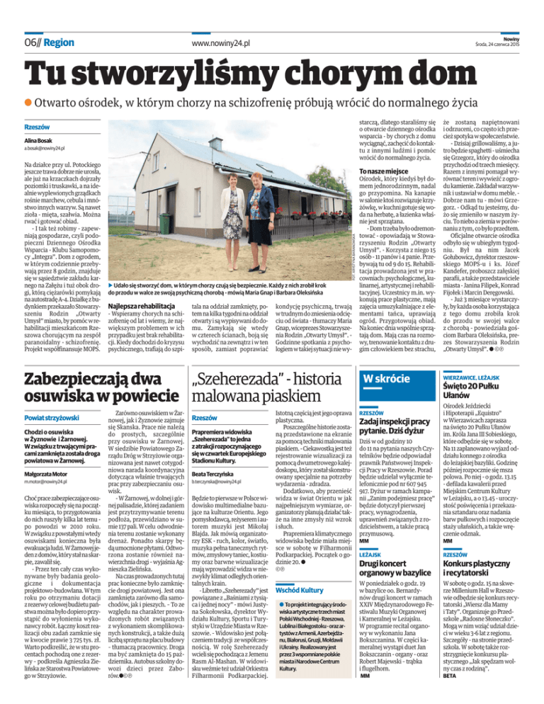 06// Region Nowiny Środa, 24 czerwca 2015 www.nowiny24.pl Tu stworzyliśmy chorym dom a Otwarto ośrodek, w którym chorzy na schizofrenię próbują wrócić do normalnego życia starczą, dlatego staraliśmy się o otwarcie dziennego ośrodka wsparcia - by chorych z domu wyciągnąć, zachęcić do kontaktu z innymi ludźmi i pomóc wrócić do normalnego życia. Rzeszów Alina Bosak [email protected] To nasze miejsce FOT. KRYSTYNA BARANOWSKA Na działce przy ul. Potockiego jeszcze trawa dobrze nie urosła, ale już na krzaczkach dojrzały poziomki i truskawki, a na idealnie wyplewionych grządkach rośnie marchew, cebula i mnóstwo innych warzyw. Są nawet zioła - mięta, szałwia. Można rwać i gotować obiad. - I tak też robimy - zapewniają gospodarze, czyli podopieczni Dziennego Ośrodka Wsparcia - Klubu Samopomocy „Integra”. Dom z ogrodem, w którym codziennie przebywają przez 8 godzin, znajduje się w sąsiedztwie zakładu karnego na Załężu i tuż obok drogi, którą ciężarówki pomykają na autostradę A-4. Działkę z budynkiem przekazało Stowarzyszeniu Rodzin „Otwarty Umysł” miasto, by pomóc w rehabilitacji mieszkańcom Rzeszowa chorującym na zespół paranoidalny - schizofrenię. Projekt współfinansuje MOPS. b Udało się stworzyć dom, w którym chorzy czują się bezpiecznie. Każdy z nich zrobił krok do przodu w walce ze swoją psychiczną chorobą - mówią Maria Gnap i Barbara Oleksińska Najlepsza rehabilitacja - Wspieramy chorych na schizofrenię od lat i wiemy, że największym problemem w ich przypadku jest brak rehabilitacji. Kiedy dochodzi do kryzysu psychicznego, trafiają do szpi- tala na oddział zamknięty, potem na kilka tygodni na oddział otwarty i są wypisywani do domu. Zamykają się wtedy w czterech ścianach, boją się wychodzić na zewnątrz i w ten sposób, zamiast poprawiać kondycję psychiczną, trwają w trudnym do zniesienia odcięciu od świata - tłumaczy Maria Gnap, wiceprezes Stowarzyszenia Rodzin „Otwarty Umysł”. Godzinne spotkania z psychologiem w takiej sytuacji nie wy- Zabezpieczają dwa „Szeherezada” - historia osuwiska w powiecie malowana piaskiem Powiat strzyżowski Chodzi o osuwiska w Żyznowie i Żarnowej. W związku z trwającymi pracami zamknięta została droga powiatowa w Żarnowej. Małgorzata Motor [email protected] Choćpracezabezpieczająceosuwiska rozpoczęły się na początku miesiąca, to przygotowania do nich ruszyły kilka lat temu po powodzi w 2010 roku. Wzwiązku z powstałymi wtedy osuwiskami konieczna była ewakuacjaludzi.WŻarnowejjeden zdomów, który stał na skarpie, zawalił się. - Przez ten cały czas wykonywane były badania geologiczne i dokumentacja projektowo-budowlana. W tym roku po otrzymaniu dotacji z rezerwy celowej budżetu państwa można było dopiero przystąpić do wyłonienia wykonawcy robót. Łączny koszt realizacji obu zadań zamknie się w kwocie prawie 3 725 tys. zł. Warto podkreślić, że w stu procentach pochodzą one z rezerwy – podkreśla Agnieszka Zielińska ze Starostwa Powiatowego w Strzyżowie. Zarówno osuwiskiem w Żarnowej, jak i Żyznowie zajmuje się Skanska. Prace nie należą do prostych, szczególnie przy osuwisku w Żarnowej. W siedzibie Powiatowego Zarządu Dróg w Strzyżowie organizowana jest nawet cotygodniowa narada koordynacyjna dotycząca właśnie trwających prac przy zabezpieczaniu osuwisk. - W Żarnowej, w dolnej i górnej palisadzie, której zadaniem jest przytrzymywanie terenu podłoża, przewidziano w sumie 137 pali. W celu odwodnienia terenu zostanie wykonany drenaż. Ponadto skarpy będą umocnione płytami. Odtworzona zostanie również nawierzchnia drogi – wyjaśnia Agnieszka Zielińska. Na czas prowadzonych tutaj prac konieczne było zamknięcie drogi powiatowej. Jest ona zamknięta zarówno dla samochodów, jak i pieszych. – To ze względu na charakter prowadzonych robót związanych z wykonaniem skomplikowanych konstrukcji, a także dużą liczbą sprzętu na placu budowy – tłumaczą pracownicy. Droga ma być zamknięta do 15 października. Autobus szkolny dowozi dzieci przez Zaborów.aą Rzeszów Prapremiera widowiska „Szeherezada” to jedna z atrakcji rozpoczynającego się w czwartek Europejskiego Stadionu Kultury. Beata Terczyńska [email protected] Będzie to pierwsze w Polsce widowisko multimedialne bazujące na kulturze Orientu. Jego pomysłodawcą, reżyserem i autorem muzyki jest Mikołaj Blajda. Jak mówią organizatorzy ESK - ruch, kolor, światło, muzyka pełna tanecznych rytmów, zmysłowy taniec, kostiumy oraz barwne wizualizacje mają wprowadzić widza w niezwykły klimat odległych orientalnych krain. - Libretto „Szeherezady” jest powiązane z „Baśniami z tysiąca i jednej nocy” - mówi Justyna Sokołowska, dyrektor Wydziału Kultury, Sportu i Turystyki w Urzędzie Miasta w Rzeszowie. - Widowisko jest połączeniem tradycji ze współczesnością. W rolę Szeherezady wcieli się pochodząca z Jemenu Rasm Al-Mashan. W widowisku weźmie też udział Orkiestra Filharmonii Podkarpackiej. Istotną częścią jest jego oprawa plastyczna. Poszczególne historie zostaną przedstawione na ekranie za pomocą techniki malowania piaskiem. - Ciekawostką jest też rejestrowanie wizualizacji za pomocą dwumetrowego kalejdoskopu, który został skonstruowany specjalnie na potrzeby wydarzenia - zdradza. Dodatkowo, aby przenieść widza w świat Orientu w jak najpełniejszym wymiarze, organizatorzy planują działać także na inne zmysły niż wzrok i słuch. Prapremiera klimatycznego widowiska będzie miała miejsce w sobotę w Filharmonii Podkarpackiej. Początek o godzinie 20. a ą Wschód Kultury A Toprojektintegrującyśrodowiskaartystycznetrzechmiast PolskiWschodniej-Rzeszowa, LublinaiBiałegostoku-orazartystówzArmenii,Azerbejdżanu,Białorusi,Gruzji,Mołdawii iUkrainy. Realizowanyjest przez3wspomnianepolskie miastaiNarodoweCentrum Kultury. Ośrodek, który kiedyś był domem jednorodzi