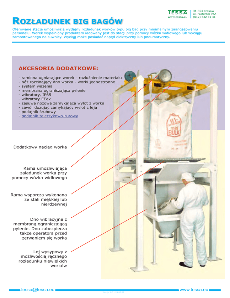 ROZŁADUNEK BIG BAGÓW www.tessa.eu 31-354 Kraków ul. Pasternik 94A (012) 632 81 41 Oferowane stacje umożliwiają wydajny rozładunek worków typu big bag przy minimalnym zaangażowaniu personelu. Worek wypełniony produktem ładowany jest do stacji przy pomocy wózka widłowego lub wyciągu zamontowanego na suwnicy. Wyciąg może posiadać napęd elektryczny lub pneumatyczny. AKCESORIA DODATKOWE: - ramiona ugniatające worek - rozluźnienie materiału nóż rozcinający dno worka - worki jednostronne system ważenia membrana ograniczająca pylenie wibratory, IP65 wibratory EEex zasuwa nożowa zamykająca wylot z worka zawór dozując zamykający wylot z leja podajnik śrubowy podajnik talerzykowo-rurowy Dodatkowy naciąg worka Rama umożliwiająca załadunek worka przy pomocy wózka widłowego Rama wsporcza wykonana ze stali miękkiej lub nierdzewnej Dno wibracyjne z membraną ograniczającą pylenie. Dno zabezpiecza także operatora przed zerwaniem się worka Lej wysypowy z możliwością ręcznego rozładunku niewielkich worków [email protected] Wersja 1.0 - 20.07.09 www.tessa.eu Stacje rozładunku big bagów mogą posiadać certyfikat ATEX co uprawnia je do pracy w strefie zagrożonej wybuchem. Suwnica Wyciąg z napędem elektrycznym lub pneumatycznym Rama umożliwiająca załadunek worka przy pomocy wyciągu Rama wsporcza wykonana ze stali miękkiej lub nierdzewnej Dno wibracyjne z membraną ograniczajacą pylenie. Dno zabezpiecza także operatora przed zerwaniem się worka Panel sterowania Lej wysypowy z dzrwiczkami umożliwiającymi dostęp operatorowy do wylotu z worka [email protected] Wersja 1.0 - 20.07.09 www.tessa.eu Przykłady stosowanych rozwiązań Zasuwa nożowa zamykająca wylot z worka - pozycja zamknięta. Stacja z odbiorem produktu poprzez podajnikiem talerzykowo-rurowym. Drzwiczki w leju wysypowym umożliwiające operatorowi rozwiązanie wylotu z worka. Stacja z ramionami ugniatającymi big bag - rozwiązanie stosowane w przypadku sprawiających problemy przy rozładunku. [email protected] Podwójna stacja z odbiorem produktu poprzez podajnik śrubowy. Wersja 1.0 - 20.07.09 www.tessa.eu