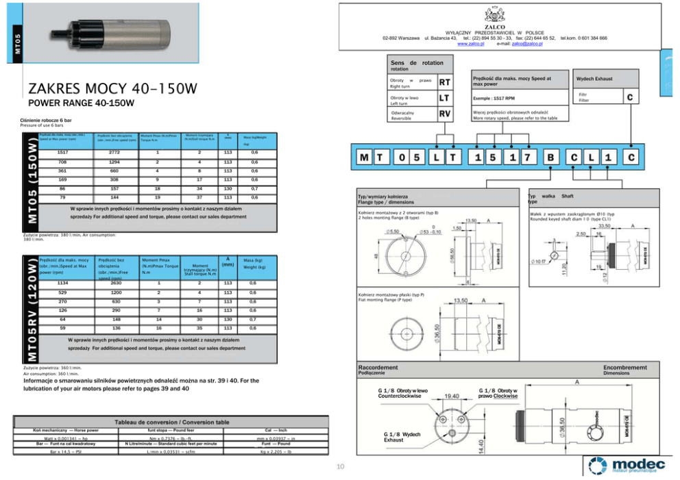 ZALCO 02-892 Warszawa WYŁĄCZNY PRZEDSTAWICIEL W POLSCE ul. Bażancia 43, tel.: (22) 894 55 30 - 33, fax: (22) 644 65 52, www.zalco.pl e-mail: [email protected] MOTEUR MT05 (40-150W) tel.kom. 0 601 384 666 Sens de rotation rotation Obroty w Right turn ZAKRES MOCY 40-150W POWER RANGE 40-150W Ciśnienie robocze 6 bar prawo Prędkość dla maks. mocy Speed at max power Wydech Exhaust Filtr Filter Obroty w lewo Left turn Exemple : 1517 RPM Odwracalny Reversible Więcej prędkości obrotowych odnaleźć More rotary speed, please refer to the table Pressure of use 6 bars Prędkość dla maks. mocy (obr./min.) Prędkość bez obciążenia Moment Pmax (N.m)Pmax Speed at Max power (rpm) (obr./min.)Free speed (rpm) Torque N.m Moment trzymający (N.m)Stall torque N.m A (mm) Masa (kg)Weight (kg) 1517 2772 1 2 113 0,6 708 1294 2 4 113 0,6 361 660 4 8 113 0,6 169 308 9 17 113 0,6 86 157 18 34 130 0,7 79 144 19 37 113 0,6 Typ wałka type Typ/wymiary kołnierza Flange type / dimensions W sprawie innych prędkości i momentów prosimy o kontakt z naszym działem Kołnierz montażowy z 2 otworami (typ B) 2 holes monting flange (B type) sprzedaży For additional speed and torque, please contact our sales department Shaft Wałek z wpustem zaokrąglonym Ø10 (typ Rounded keyed shaft diam 1 0 (type CL1) Zużycie powietrza: 380 l/min. Air consumption: 380 l/min. Prędkość dla maks. mocy Prędkość bez Moment Pmax (obr./min.)Speed at Max obciążenia (N.m)Pmax Torque power (rpm) (obr./min.)Free N.m Moment trzymający (N.m) Stall torque N.m A (mm) Masa (kg) Weight (kg) speed (rpm) 1134 2630 1 2 113 0,6 529 270 1200 2 4 113 0,6 630 3 7 113 0,6 126 290 7 16 113 0,6 64 148 14 30 130 0,7 59 136 16 35 113 0,6 Kołnierz montażowy płaski (typ P) Fiat monting flange (P type) W sprawie innych prędkości i momentów prosimy o kontakt z naszym działem sprzedaży For additional speed and torque, please contact our sales department Zużycie powietrza: 360 l/min. Raccordement Encombrememt Air consumption: 360 l/min. Podłączenie Dimensions Informacje o smarowaniu silników powietrznych odnaleźć można na str. 39 i 40. For the lubrication of your air motors please refer to pages 39 and 40 G 1/8 Obroty w lewo Counterclockwise Koń mechaniczny — Horse power funt stopa — Pound feer Cal — Inch Watt x 0,001341 = hp Bar — Funt na cal kwadratowy Nm x 0,7376 = lb.-ft. N Litre/minute — Standard cubic feet per minute mm x 0,03937 = in Funt — Pound Bar x 14,5 = PSI L/min x 0,03531 = scfm Kg x 2,205 = lb G 1/8 Wydech Exhaust G 1/8 Obroty w prawo Clockwise ----------------------------------------------------------------------------------------------------------------------------------------Mom —i -------------------------------Torq Krzywe mocy MT05LT/RT Power curves MT05LT/RT Krzywe mocy IWT05RV Power curves IWT05RV 6 bars 6 bars 5 bars Moment (Nm) / Torque (Nm) 4 bars Moc (W / Power (W) Moc / Power (W) 5 bars Prędkość (obr./min.) / Speed (rpm) Zużycie powietrza (l/min.) Zużycie powietrza (l/min.) Prędkość (obr./min.) / Speed (rpm) _4bars Prędkość (obr./min.) / Speed r.p.m Prędkość (obr./min.) / Speed r.p.m Kv mini dystrybutor Kv mini distributor Średnica złącza mini Mini fittinq diameter Średnica rury mini Mini pipe diameter Europe 10 Kv 5 mm 6 mm US 0,7 Cv 0,197 in 0,2364 in Kv mini dystrybutor Kv mini distributor Średnica złącza mini mini Mini fittinq diameter Średnica rury mini Mini pipe diameter Europe 20 Kv 5 mm 6 mm US 1,4 Cv 0,197 in 0,2364 in MOTEUR MT07 (40-150W) Sens de rotation rotation ZAKRES MOCY 40-150W POWER RANGE 40-150W Right turn Prędkość dla maks. mocy Speed at max power Obroty w lewo Left Exemple : 75 RPM Obroty w prawo Wydech Exhaust Filtr Filter turn Więcej prędkości obrotowych odnaleźć można w tabeli More rotary speed, please refer to the table Odwracalny Reversible Ciśnienie robocze 6 bar Pressure of use 6 bars Prędkość dla maks. mocy (obr./min.) Speed at Max power (rpm) Moment trzymający (N.m) Stall torque N.m A (mm) 20 39 206 2,3 115 24 47 206 2,3 90 30 59 206 2,3 64 43 83 206 2,3 54 50 100 206 2,3 Prędkość bez obciążenia (obr./min.)Free speed (rpm) 138 35 Moment Pmax (N.m) Pmax Torque N.m^| Masa (kg) Weight (kg) D'autres vitesses et couples sont disponibles, nous consulter W Rodzaj kołnierza (patrz str. 2 0 ) Flange type (refer to page 20) sprawie innych prędkości i momentów prosimy o kontakt z naszym działem Rodzaj wałka (patrz str. 2 1 ) Shaft type (refer to page 2 1 ) sprzedaży Wymiary Dimensions Zużycie powietrza: 380 l/min. Air consumption: 380 l/min. Prędkość dla maks. mocy (obr./min.) Speed at Max power (rpm) Prędkość bez Moment Pmax (N.m) Moment obciążenia Pmax Torque N.m^| trzymający (N.m) (obr./min.)Free speed 130 17 110 85 Stall torque N.m A (mm) Masa (kg) Weight (kg) 35 206 2,3 20 40 206 2,3 25 50 206 2,3 62 35 70 206 2,3 51 42 85 206 2,3 40 49 105 206 2,3 Podłączenie Connecting D'autres vitesses et couples sont disponibles, nous consulter W sprawie innych prędkości i momentów prosimy o kontakt z naszym działem sprzedaży G 1 / 8 Obroty w lewo Counterclockwise Zużycie powietrza: 360 l/min. Air consumption: 360 l/min. Informacje o smarowaniu silników powietrznych odnaleźć można na str. 39 i 40. For the lubrication of your air motors please refer to pages 39 and 40 Tableau de conversion / Conversion table Koń mechaniczny — Horse power funt stopa — Pound feer Cal — Inch Watt x 0,001341 = hp Bar — Funt na cal kwadratowy Nm x 0,7376 = lb.-ft. N Litre/minute — Standard cubic feet per minute mm x 0,03937 = in Funt — Pound Bar x 14,5 = PSI L/min x 0,03531 = scfm Kg x 2,205 = lb G Wydech Exhaust G 1 / 8 Obroty w prawo Clockwise Krzywe mocy MT07LT/RT Power curves MT07LT/RT Krzywe mocy MT07 RV Power curves MT07 RV Moc (W / Power (W) 6 bars 6 bars Moment / Torque (Nm) 4 bars Moment / Torque (Nm) Moc (W / Power (W) c (W / Power (W) 5 bars 5 bars 4 bars i ) Prędkość (obr./min.) / Speed (rpm) I Zużycie pow