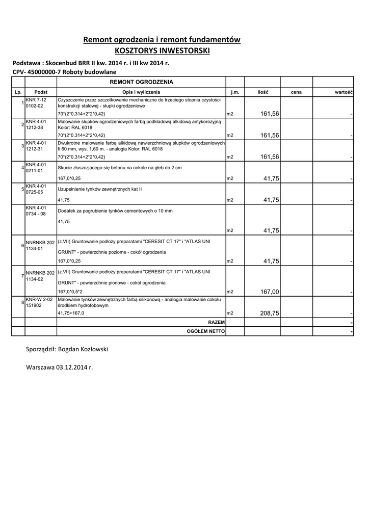 Remont ogrodzenia i remont fundamentów KOSZTORYS INWESTORSKI Podstawa : Skocenbud BRR II kw. 2014 r. i III kw 2014 r. CPV- 45000000-7 Roboty budowlane REMONT OGRODZENIA Lp. Podst Opis i wyliczenia j.m. KNR 7-12 1 0102-02 Czyszczenie przez szczotkowanie mechaniczne do trzeciego stopnia czystości konstrukcji stalowej - słupki ogrodzeniowe KNR 4-01 2 1212-38 Malowanie słupków ogrodzeniowych farbą podkładową alkidową antykorozyjną Kolor: RAL 6018 70*(2*0,314+2*2*0,42) 70*(2*0,314+2*2*0,42) KNR 4-01 3 1212-31 m2 161,56 - m2 161,56 - m2 161,56 - m2 41,75 - m2 41,75 - m2 41,75 - m2 41,75 - m2 167,00 - m2 208,75 - Uzupełnienie tynków zewnętrznych kat II 41,75 KNR 4-01 0734 - 08 wartość Skucie złuszczjacego się betonu na cokole na głeb do 2 cm 167,0*0,25 KNR 4-01 5 0725-05 cena Dwukrotne malowanie farbą alkidową nawierzchniową słupków ogrodzeniowych fi 60 mm, wys. 1,60 m. - analogia Kolor: RAL 6018 70*(2*0,314+2*2*0,42) KNR 4-01 4 0211-01 ilość Dodatek za pogrubienie tynków cementowych o 10 mm 41,75 6 NNRNKB 202 (z.VII) Gruntowanie podłoży preparatami "CERESIT CT 17" i "ATLAS UNI 1134-01 GRUNT" - powierzchnie poziome - cokół ogrodzenia 167,0*0,25 7 NNRNKB 202 (z.VII) Gruntowanie podłoży preparatami "CERESIT CT 17" i "ATLAS UNI 1134-02 GRUNT" - powierzchnie pionowe - cokół ogrodzenia 167,0*0,5*2 KNR-W 2-02 8 151902 Malowanie tynków zewnętrznych farbą silikonową - analogia malowanie cokołu środkiem hydrofobowym 41,75+167,0 RAZEM OGÓŁEM NETTO Sporządził: Bogdan Kozłowski Warszawa 03.12.2014 r. REMONT FUNDAMENTÓW KNR 4-01 1 0211-01 Skucie złuszczjacego się betonu na cokole na głeb do 2 cm m2 16,00 - m2 16,00 - m2 16,00 - m2 38,01 - m2 52,80 - 38,01+52,80 m2 90,81 - umocowanie pokrycia z papy z zakitowaniem ubytków m2 12,00 - m2 4,00 - m2 4,00 - m2 4,00 - m2 5,34 - m2 5,34 - 5,34+5,34 m2 10,68 - KNR 4-01 0519-01 umocowanie pokrycia z papy z zakitowaniem ubytków m2 12,00 - kalkulacja indywidualna umocowanie pokrycia papy do krawędzi dachu przy uzyciu kątownika mb 16,00 KNR 4-01 2 0725-05 Uzupełnienie tynków zewnętrznych kat II 16 KNR 4-01 0734 - 08 Dodatek za pogrubienie tynków cementowych o 10 mm 41,75 3 NNRNKB 202 (z.VII) Gruntowanie podłoży preparatami "CERESIT CT 17" i "ATLAS UNI 1134-01 GRUNT" - powierzchnie poziome - góra stóp fundamentowych 12*1,6*1,6+9*0,9*0,9 4 NNRNKB 202 (z.VII) Gruntowanie podłoży preparatami "CERESIT CT 17" i "ATLAS UNI 1134-02 GRUNT" - powierzchnie pionowe boki stóp fundamentowych 12*4*0,5+9*4*0,8 KNR-W 2-02 5 151902 KNR 4-01 6 0519-01 KNR 4-01 0211-01 KNR 4-01 7 0725-05 Malowanie tynków zewnętrznych farbą silikonową - analogia malowanie stóp fundamentowych środkiem hydrofobowym Skucie złuszczjacego się betonu na cokole na głeb do 2 cm na fundamencie kontenera Uzupełnienie tynków zewnętrznych kat II 4 KNR 4-01 0734 - 08 Dodatek za pogrubienie tynków cementowych o 10 mm 4 8 NNRNKB 202 (z.VII) Gruntowanie podłoży preparatami "CERESIT CT 17" i "ATLAS UNI 1134-01 GRUNT" - powierzchnie poziome - góra fundamentu kontenera 2*(6,00+2,90)*0,3 9 NNRNKB 202 (z.VII) Gruntowanie podłoży preparatami "CERESIT CT 17" i "ATLAS UNI 1134-02 GRUNT" - powierzchnie pionowe boki fundamentu kontenera 2*(6,00+2,90)*0,30 KNR-W 2-02 10 151902 Malowanie tynków zewnętrznych farbą silikonową - analogia malowanie fundamentu kontenera środkiem hydrofobowym RAZEM OGÓŁEM NETTO Sporządził: Bogdan Kozłowski Warszawa 03.12.2014 r. -