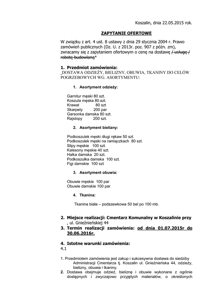 Koszalin, dnia 22.05.2015 rok. ZAPYTANIE OFERTOWE W związku z art. 4 ust. 8 ustawy z dnia 29 stycznia 2004 r. Prawo zamówień publicznych (Dz. U. z 2013r. poz. 907 z późn. zm), zwracamy się z zapytaniem ofertowym o cenę na dostawę / usługę / robotę budowlaną* 1. Przedmiot zamówienia: DOSTAWA ODZIEŻY, BIELIZNY, OBUWIA, TKANINY DO CELÓW POGRZEBOWYCH WG. ASORTYMENTU: 1. Asortyment odzieży: Garnitur męski 80 szt. Koszula męska 80.szt. Krawat 80 szt Skarpety 200 par Garsonka damska 80 szt. Rajstopy 200 szt. 2. Asortyment bielizny: Podkoszulek męski długi rękaw 50 szt. Podkoszulek męski na ramiączkach 80 szt. Slipy męskie 100 szt. Kalesony męskie 40 szt. Halka damska 20 szt. Podkoszulka damska 100 szt. Figi damskie 100 szt 3. Asortyment obuwia: Obuwie męskie 100 par Obuwie damskie 100 par 4. Tkanina: Tkanina biała – podszewkowa 50 bel po 100 mb. 2. Miejsce realizacji: Cmentarz Komunalny w Koszalinie przy , ul. Gnieźnieńskiej 44 3. Termin realizacji zamówienia: od dnia 01.07.2015r do 30.06.2016r. 4. Istotne warunki zamówienia: 4.1 1. Przedmiotem zamówienia jest zakup i sukcesywna dostawa do siedziby Administracji Cmentarza tj. Koszalin ul. Gnieźnieńska 44, odzieży, bielizny, obuwia i tkaniny. 2. Dostawa obejmuje odzież, bieliznę i obuwie wykonane z ogólnie dostępnych i zwyczajowo przyjętych materiałów, o określonych parametrach, w ilościach przedstawionych, w wykazie asortymentu odzieży, bielizny, obuwia i tkaniny. 3. Zamawiający zastrzega sobie możliwość zakupu mniejszej ilości odzieży, bielizny i obuwia niż to określono w wykazie z powodu zmian okoliczności, których nie można było przewidzieć, na które Zamawiający nie miał wpływu. W sytuacji takiej Dostawca nie będzie wnosił żadnych zastrzeżeń oraz roszczeń. 4.Dostawy realizowane będą przez Dostawcę własnym transportem w oparciu o zgłoszenie telefoniczne potwierdzone faksem przez Zamawiającego maksymalnie w ciągu 24 godzin. 4.2 O zamówienie mogą ubiegać się oferenci, którzy spełniają następujące warunki: a) b) c) d) posiadają uprawnienia do występowania w obrocie prawnym, zgodnie z wymaganiami ustawowymi, posiadają uprawnienia niezbędne do wykonania określonych prac lub czynności, jeżeli ustawy nakładają obowiązek posiadania takich uprawnień, dysponują niezbędną wiedzą i doświadczeniem, a także potencjałem ekonomicznym i technicznym oraz pracownikami zdolnymi do wykonania danego zamówienia, znajdują się w sytuacji finansowej zapewniającej wykonanie zamówienia. 3. Wymagane warunki płatności; przelew – 30 dni. 4. Sposób przygotowania oferty. 4.1. Ofertę należy sporządzić na załączonym druku „OFERTA”. 4.2. Termin złożenia oferty: 08.06.2015 roku, do godz. 1230. 4.3. Ofertę należy złożyć w siedzibie Zamawiającego. 5. Osoby upoważnione do udzielania informacji ze strony Zamawiającego; 1) Bogusław Płóciennik , tel. 505 182 709, [email protected] Z poważaniem Płóciennik Bogusław Przedsiębiorstwo Gospodarki Komunalnej Spółka zo.o. 75-724 Koszalin, ul Komunalna 5 NIP 669-05-05-783 pieczęć zamawiającego OFERTA Dostawa / usługa / robota budowlana* Dane dotyczące oferenta Nazwa............................................................................................ Siedziba......................................................................................... Nr telefonu/faksu ........................................................ nr NIP ......................................................................... nr REGON ..................................................................... Zobowiązuję się zrealizować przedmiot zamówienia za kwotę: netto.......................................................................................zł (słownie: .................................................................................zł) brutto.......................................................................................zł (słownie: ..................................................................................zł) Zobowiązuję się dostarczyć przedmiot zamówienia w terminie uzgodnionym z Zamawiającym. ……………………………………………………………………… (imię i nazwisko) podpis uprawnionego przedstawiciela oferenta *właściwe zaznaczyć