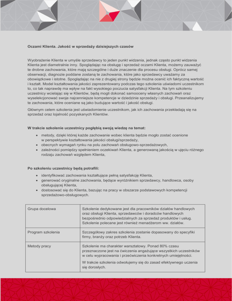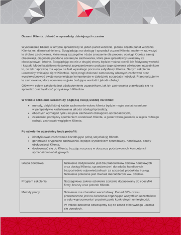 Oczami Klienta. Jakość w sprzedaży dzisiejszych czasów Wyobrażenie Klienta w umyśle sprzedawcy to jeden punkt widzenia, jednak często punkt widzenia Klienta jest diametralnie inny. Spoglądając na obsługę i sprzedaż oczami Klienta, możemy zauważyć te drobne zachowania, które mają szczególne i duże znaczenie dla procesu obsługi. Oprócz samej obserwacji, diagnozie poddane zostaną te zachowania, które jako sprzedawcy uważamy za obowiązkowe i istotne. Spoglądając na nie z drugiej strony będzie można ocenić ich faktyczną wartość i kształt. Model kształtowania jakości zaprezentowany podczas tego szkolenia uświadomi uczestnikom to, co tak naprawdę ma wpływ na fakt wysokiego poczucia satysfakcji Klienta. Na tym szkoleniu uczestnicy wcielając się w Klientów, będą mogli dokonać samooceny własnych zachowań oraz wyselekcjonować swoje najcenniejsze kompetencje w dziedzinie sprzedaży i obsługi. Przeanalizujemy te zachowania, które oceniane są jako budujące wartość i jakość obsługi. Głównym celem szkolenia jest uświadomienie uczestnikom, jak ich zachowania przekładają się na sprzedaż oraz lojalność pozyskanych Klientów. W trakcie szkolenie uczestnicy pogłębią swoją wiedzę na temat: metody, dzięki której każde zachowanie wobec klienta będzie mogło zostać ocenione w perspektywie kształtowania jakości obsługi/sprzedaży, obecnych wymagań rynku na polu zachowań obsługowo-sprzedażowych, zależności pomiędzy spełnieniem oczekiwań Klienta, a generowaną jakością w ujęciu różnego rodzaju zachowań względem Klienta, Po szkoleniu uczestnicy będą potrafili: identyfikować zachowania kształtujące pełną satysfakcję Klienta, generować oryginalne zachowania, będące wyróżnikiem sprzedawcy, handlowca, osoby obsługującej Klienta, dostosować się do Klienta, bazując na pracy w obszarze podstawowych kompetencji sprzedażowo-obsługowych. Grupa docelowa Szkolenie dedykowane jest dla pracowników działów handlowych oraz obsługi Klienta, sprzedawców i doradców handlowych bezpośrednio odpowiedzialnych za sprzedaż produktów i usług. Szkolenie polecane jest również menadżerom ww. działów. Program szkolenia Szczegółowy zakres szkolenia zostanie dopasowany do specyfiki firmy, branży oraz potrzeb Klienta. Metody pracy Szkolenie ma charakter warsztatowy. Ponad 80% czasu przeznaczone jest na ćwiczenia angażujące wszystkich uczestników w celu wypracowania i przećwiczenia konkretnych umiejętności. W trakcie szkolenia odwołujemy się do zasad efektywnego uczenia się dorosłych. Wykorzystane zostaną następujące techniki: burza mózgów, ćwiczenia indywidualne i grupowe, testy, gry symulacyjne, analizy case study, psychodrama. Charakter szkolenia Otwarte lub wewnętrzne realizowane w grupie od 4-16 osób lub według indywidualnych ustaleń. Czas trwania Od 2 do 6 dni. Każdy z modułów szkoleniowych trwa 90 minut. Szkolenie odbywa się w godzinach 9-17 lub w uzgodnionych indywidualnie z Klientem. Materiały szkoleniowe Materiały szkoleniowe są uzupełnieniem do materiału omawianego w trakcie szkolenia. Uczestnicy otrzymują je w formie drukowanej. Miejsce realizacji szkolenia W siedzibie Klienta lub w miejscu przez niego wskazanym. Raport poszkoleniowy Po realizacji szkolenia przygotowywany jest raport zawierający podsumowanie szkolenia, najważniejsze wnioski, rekomendacje dotyczące działań na przyszłość. Wsparcie szkoleniowe W ciągu jednego miesiąca po szkoleniu służymy wsparciem. Zapraszamy do kontaktu, zadawania pytania odnośnie zagadnień realizowanych na szkoleniu. Wyślij zapytanie, a przedstawimy Ci szkolenie dostosowane do specyfiki i potrzeb Twojej firmy! Zapraszamy do kontaktu, tel. 22/ 839 55 99 wew. 225 MCS sp. z o.o. sp. k., ul. Czerska 14, 00-732 Warszawa [email protected], www.mcs.edu.p