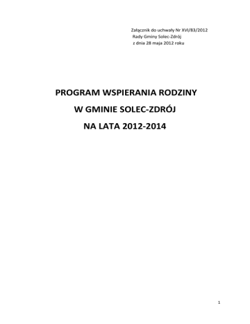 Załącznik do uchwały Nr XVI/83/2012 Rady Gminy Solec-Zdrój z dnia 28 maja 2012 roku PROGRAM WSPIERANIA RODZINY W GMINIE SOLEC-ZDRÓJ NA LATA 2012-2014 1 WSTĘP Rodzina to podstawowa komórka społeczna i naturalne środowisko wychowawcze dziecka, kształtujące jego osobowość, przekazujące system wartości, normy, tradycje, ukierunkowujące jego aktywność i postępowanie na całe życie. Jest najbardziej stabilnym punktem odniesienia w dziecka oraz źródłem zaspokajania jego potrzeb zarówno w sferze psychicznej jak i materialno-bytowej. Wszystkie dzieci wymagają ochrony praw i wolności oraz pomocy dla zapewnienia harmonijnego rozwoju i przyszłej samodzielności życiowej. Szczególnej uwagi wymagają dzieci i młodzież z rodzin niewydolnych wychowawczo. Dysfunkcje rodziny, spowodowane w głównej mierze uzależnieniami i bezrobociem przyczyniają się do powstawania znacznych strat rozwojowych dzieci żyjących w tych rodzinach. Niewydolność rodziców zaburza zaspokajanie podstawowych potrzeb rozwojowych dziecka, prowadzi między innymi do niepowodzeń szkolnych oraz izolacji społecznej. Rodzina wypełniając swoją funkcję, zwłaszcza wychowawczą, wpływa na „jakość” młodego pokolenia, jego rozwój emocjonalny i intelektualny. Złe warunki materialne rodziny, powodujące sytuacje, w których rodzina nie będzie w stanie własnymi siłami zaspokoić podstawowych potrzeb życiowych swoich członków, to tylko jeden z czynników prowadzących do wykluczenia społecznego. Często u jego podłoża leżą inne problemy zaburzające funkcjonowanie rodziny. Należą do nich przede wszystkim alkoholizm, przemoc, przestępczość, demoralizacja i niedostosowanie społeczne. Rodzina jako naturalne środowisko rozwoju dziecka, przeżywając trudności w opiekowaniu się i wychowywaniu dzieci, wymaga wsparcia dla dobra nie tyko dzieci, ale też wszystkich jej członków. Przywrócenie prawidłowego funkcjonowania rodzin jest największym zyskiem dla społeczności lokalnej, w każdej sferze życia. DIAGNOZA Diagnoza lokalna dotycząca dysfunkcjonalności rodziny w zakresie pełnienia funkcji opiekuńczo-wychowawczej została dokonana w oparciu o dane pochodzące z Gminnego Ośrodka Pomocy Społecznej w Solcu-Zdroju oraz Powiatowego Centrum Pomocy Rodzinie w Busku-Zdroju. Według analizy pracowników socjalnych bezradność w sprawach opiekuńczowychowawczych zdiagnozowano w 6 rodzinach z terenu gminy, przy czym rodziny te przy zapewnieniu wsparcia Gminnego Ośrodka Pomocy Społecznej są w stanie zapewnić dziecku właściwy rozwój fizyczny i duchowy, co daje szansę na 2 pozostawienie dziecka w rodzinie naturalnej. Po dokonaniu dogłębnej analizy powyższych środowisk należy uznać, że działania podejmowane przez Ośrodek są wystarczające. Zatem można założyć, że prawdopodobieństwo umieszczenia dziecka w placówce opiekuńczo-wychowaczej lub rodzinie zastępczej jest niewielkie. Z danych z Powiatowego Centrum Pomocy Rodzinie wynika, że z terenu Gminy Solec-Zdrój w 2010 roku w 2 rodzinach zastępczych przebywało 3 dzieci, w 2011 roku w 2 rodzinach zastępczych przebywało 3 dzieci, obecnie na terenie Gminy Solec Zdrój funkcjonują 2 rodziny zastępcze, w których przebywa 2 dzieci. 2010 rok 2011rok Rodziny zastępcze Liczba rodzin zastępczych na terenie gminy SolecZdrój Liczba dzieci przebywający w rodzinach zastępczych z terenu gminy Solec-Zdrój 2012rok (stan na 29.02.2012r.) 2 2 2 3 3 2 W placówkach opiekuńczo-wychowawczych z terenu naszej gminy w roku 2010 przebywało 3 dzieci, w roku 2011 2 dzieci, w 2012 roku nie przebywa żadne dziecko. Placówki opiekuńczowychowawcze Liczba dzieci przebywających w placówkach op.wych. z terenu gminy Solec-Zdrój 2010 rok 2011 rok 2012 rok 3 2 0 ZASOBY INSTYTUCJONALNE DZIAŁAJĄCE W OBSZARZE WSPIERANIA RODZINY NA TERENIE GMINY SOLEC-ZDRÓJ: 1. Gminny Ośrodek Pomocy Społecznej w Solcu-Zdroju. 2. Komisariat Policji w Solcu-Zdroju. 3. Gminny Zespół Interdyscyplinarny. 3 4. 5. 6. 7. Gminna Komisja Rozwiązywania Problemów Alkoholowych. Niepubliczny Zakład Opieki Zdrowotnej „Eskulap” Urząd Gminy w Solcu-Zdroju. Punkt konsultacyjny dla osób uzależnionych i współuzależnionych. PODEJMOWANE DZIAŁANIA NA RZECZ WSPIERANIA RODZINY Gmina Solec-Zdrój realizuje wiele działań, których celem jest m.in. wspieranie rodziny. Na terenie Gminy funkcjonuje punkt konsultacyjny dla osób uzależnionych i współuzależnionych. W punkcie tym osoby zainteresowane mogą uzyskać informacje o chorobie alkoholowej, jej przyczynach, przebiegu i skutkach, o problemach występujących w rodzinach alkoholowych o tym jak sobie z nimi radzić. W punkcie konsultacyjnym można uzyskać informacje na temat zjawiska przemocy w rodzinie, a także na temat możliwości udzielania wszelkiej niezbędnej pomocy rodzinom i ofiarom przemocy domowej. W punkcie konsultacyjnym udzielane jest również wsparcie psychologiczne osobom będącym w kryzysie. W zakresie rozwiązywania problemów rodzin uwikłanych w chorobę alkoholową, która jest jedną z głównych przyczyn wszelkich dysfunkcjonalności rodziny działa Gminna Komisja Rozwiązywania Problemów Alkoholowych. W placówkach oświatowych na terenie Gminy realizowane są również różnego rodzaju programy profilaktyczne dla dzieci i młodzieży, których celem jest m.in. przekazywanie dzieciom informacji jak radzić sobie w trudnych sytuacjach, gdzie można szukać pomocy. W Gimnazjum prowadzony jest wielopoziomowy program profilaktyczny „Veto wobec przemocy, alkoholu i narkotyków”. W okresie wakacyjnym organizowane są imprezy plenerowe, pikniki rodzinne zawierające elementy profilaktyki antyuzależnieniowej i antyalkoholowej. Dzieci z rodzin, w których występują różnego rodzaju dysfunkcje wyjeżdżają co roku na kolonie, podczas których realizowane są również programy profilaktyczne. Na terenie Gminy działa Zespół Interdyscyplinarny, członkowie któreg
