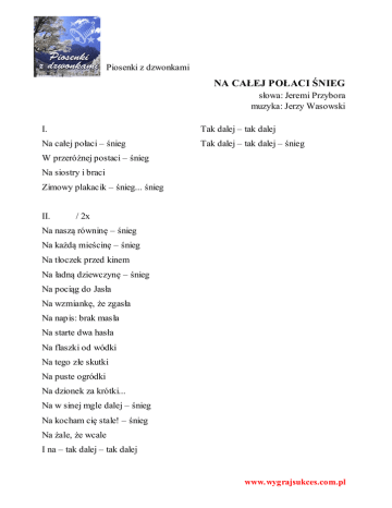 Piosenki z dzwonkami NA CAŁEJ POŁACI ŚNIEG słowa: Jeremi Przybora muzyka: Jerzy Wasowski I. Tak dalej – tak dalej Na całej połaci – śnieg Tak dalej – tak dalej – śnieg W przeróżnej postaci – śnieg Na siostry i braci Zimowy plakacik – śnieg... śnieg II. / 2x Na naszą równinę – śnieg Na każdą mieścinę – śnieg Na tłoczek przed kinem Na ładną dziewczynę – śnieg Na pociąg do Jasła Na wzmiankę, że zgasła Na napis: brak masła Na starte dwa hasła Na flaszki od wódki Na tego złe skutki Na puste ogródki Na dzionek za krótki... Na w sinej mgle dalej – śnieg Na kocham cię stale! – śnieg Na żale, że wcale I na – tak dalej – tak dalej www.wygrajsukces.com.pl
