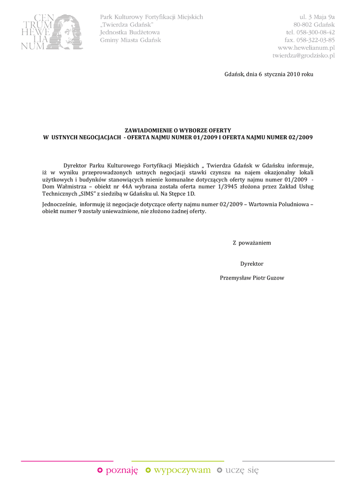Gdańsk, dnia 6 stycznia 2010 roku ZAWIADOMIENIE O WYBORZE OFERTY W USTNYCH NEGOCJACJACH - OFERTA NAJMU NUMER 01/2009 I OFERTA NAJMU NUMER 02/2009 Dyrektor Parku Kulturowego Fortyfikacji Miejskich „ Twierdza Gdańsk w Gdańsku informuje, iż w wyniku przeprowadzonych ustnych negocjacji stawki czynszu na najem okazjonalny lokali użytkowych i budynków stanowiących mienie komunalne dotyczących oferty najmu numer 01/2009 Dom Wałmistrza – obiekt nr 44A wybrana została oferta numer 1/3945 złożona przez Zakład Usług Technicznych „SIMS” z siedzibą w Gdańsku ul. Na Stępce 1D. Jednocześnie, informuję iż negocjacje dotyczące oferty najmu numer 02/2009 – Wartownia Poludniowa – obiekt numer 9 zostały unieważnione, nie złożono żadnej oferty. Z poważaniem Dyrektor Przemysław Piotr Guzow