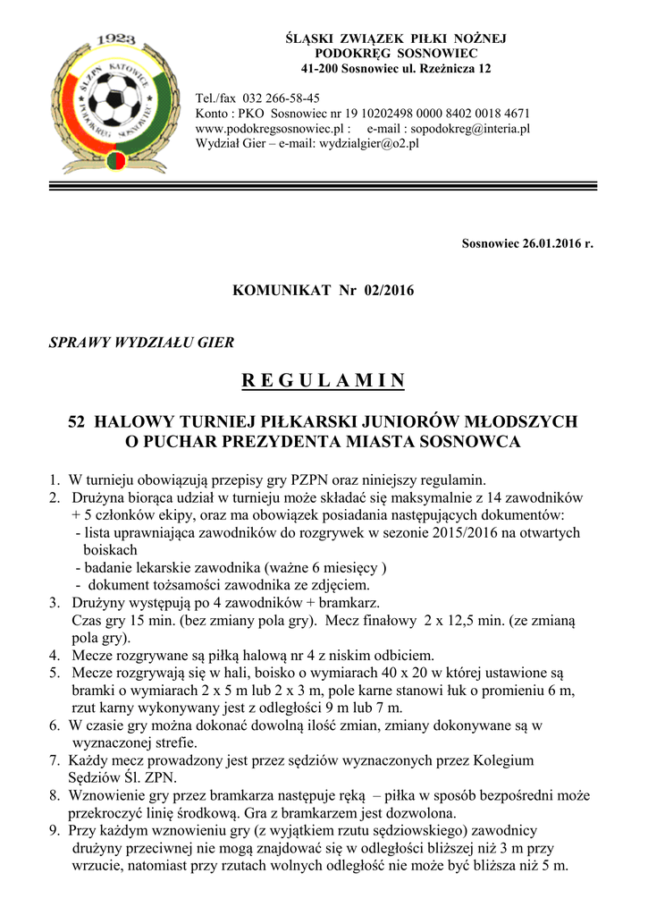 ŚLĄSKI ZWIĄZEK PIŁKI NOŻNEJ PODOKRĘG SOSNOWIEC 41-200 Sosnowiec ul. Rzeżnicza 12 Tel./fax 032 266-58-45 Konto : PKO Sosnowiec nr 19 10202498 0000 8402 0018 4671 www.podokregsosnowiec.pl : e-mail : [email protected] Wydział Gier – e-mail: [email protected] Sosnowiec 26.01.2016 r. KOMUNIKAT Nr 02/2016 SPRAWY WYDZIAŁU GIER REGULAMIN 52 HALOWY TURNIEJ PIŁKARSKI JUNIORÓW MŁODSZYCH O PUCHAR PREZYDENTA MIASTA SOSNOWCA 1. W turnieju obowiązują przepisy gry PZPN oraz niniejszy regulamin. 2. Drużyna biorąca udział w turnieju może składać się maksymalnie z 14 zawodników + 5 członków ekipy, oraz ma obowiązek posiadania następujących dokumentów: - lista uprawniająca zawodników do rozgrywek w sezonie 2015/2016 na otwartych boiskach - badanie lekarskie zawodnika (ważne 6 miesięcy ) - dokument tożsamości zawodnika ze zdjęciem. 3. Drużyny występują po 4 zawodników + bramkarz. Czas gry 15 min. (bez zmiany pola gry). Mecz finałowy 2 x 12,5 min. (ze zmianą pola gry). 4. Mecze rozgrywane są piłką halową nr 4 z niskim odbiciem. 5. Mecze rozgrywają się w hali, boisko o wymiarach 40 x 20 w której ustawione są bramki o wymiarach 2 x 5 m lub 2 x 3 m, pole karne stanowi łuk o promieniu 6 m, rzut karny wykonywany jest z odległości 9 m lub 7 m. 6. W czasie gry można dokonać dowolną ilość zmian, zmiany dokonywane są w wyznaczonej strefie. 7. Każdy mecz prowadzony jest przez sędziów wyznaczonych przez Kolegium Sędziów Śl. ZPN. 8. Wznowienie gry przez bramkarza następuje ręką – piłka w sposób bezpośredni może przekroczyć linię środkową. Gra z bramkarzem jest dozwolona. 9. Przy każdym wznowieniu gry (z wyjątkiem rzutu sędziowskiego) zawodnicy drużyny przeciwnej nie mogą znajdować się w odległości bliższej niż 3 m przy wrzucie, natomiast przy rzutach wolnych odległość nie może być bliższa niż 5 m. 10. Piłka jest w grze, jeśli nie odbije się od sufitu (wznowienie gry z linii bocznej) i nie opuści pola gry ograniczonego na całym obwodzie liniami. 11. Wszystkie przewinienia traktowane są jako rzuty wolne pośrednie za wyjątkiem rzutu karnego. 12. Jeżeli piłka opuści pole gry, wznowienie gry następuje poprzez zagranie piłki z autu, z rzutu różnego lub rzutu od bramki. 13. Gol nie jest uznany, jeśli piłka wpadnie do bramki bezpośrednio ze: - wznowienia gry od bramki, - wznowienia gry z autu , - wznowienia gry ze środka boiska, - rzutu wolnego, - natomiast w przypadku przechwycenia przez bramkarza piłki z akcji może on zdobyć bramkę zagrywając ją nogą. 14. Zmiany zawodników w trakcie gry, dozwolone są pod warunkiem wcześniejszego opuszczenia pola gry przez zawodnika uczestniczącego w grze, po czym w jego miejsce może wejść inny zawodnik. 15. Zmiany zawodników mogą być dokonywane tylko w wyznaczonej strefie zmian - drużyna, która nieprawidłowo wykona zmianę, będzie karane rzutem wolnym pośrednim z miejsca przewinienia. 16. Jeżeli na boisku znajduje się więcej niż 5 zawodników jednej drużyny – w wyniku złej zmiany – sędzia usunie z boiska nadliczbowego zawodnika i ukarze drużynę 1 minutowa kara, odsuwając od gry zawodnika z pola wskazanego przez kapitana drużyny. 17. Stosuje się kary wychowawcze: a) 1 min. (żółta kartka) Po utracie bramki przez drużynę grającą w osłabieniu, skład drużyny zostaje uzupełniony. 18. Jeżeli zawodnik otrzyma 2 min.(czerwona kartka) : a) opuszcza boisko, nie może grać w tym meczu, a po upływie 2 min. od jego zejścia skład może być uzupełniony przez innego zawodnika. b) za brutalną grę oraz za wysoce niesportowe zachowanie opuszcza boisko, a o dalszym jego uczestnictwie w turnieju decyduje organizator. 19. Nie obowiązują przepisy o spalonym. 20. Zespoły biorące udział w tym turnieju ubezpieczają się od nieszczęśliwych wypadków we własnym zakresie. Organizator nie ponosi odpowiedzialności za ewentualne wypadki, jedynie zabezpiecza pierwszą pomoc. 21. We wszystkich sprawach spornych nie ujętych w powyższym regulaminie decyduje organizator. 22. O kolejności miejsc decyduje: - ilość zdobytych pkt. (3 -1 -0) - wynik bezpośredniego spotkania - korzystniejsza różnica bramek - więcej zdobytych bramek - rzuty karne (dotyczy dwóch drużyn) - dodatkowa tabela uwzględniająca mecze pomiędzy zainteresowanymi drużynami (dotyczy trzech drużyn). 23. Do finału awansują drużyny, które zajmą 1 i 2 miejsce w grupie eliminacyjnej. Przewodniczący Wydziału Gier Henryk Kurek REGULAMIN XXI HALOWYCH MISTRZOSTW ZAGŁĘBIA SENIORÓW W PIŁCE NOŻNEJ 1. W turnieju obowiązują przepisy gry PZPN oraz niniejszy regulamin. 2. Drużyna biorąca udział w turnieju może składać się maksymalnie z 14 zawodników + 5 członków ekipy, oraz ma obowiązek posiadania następujących dokumentów: - lista uprawniająca zawodników do rozgrywek w sezonie 2015/2016 na otwartych boiskach - badanie lekarskie zawodnika (ważne 6 miesięcy ) - dokument tożsamości zawodnika ze zdjęciem. 3. Drużyny występują po 4 zawodników + bramkarz. Czas gry 20 min. (bez zmiany pola gry). Mecz finałowy 2 x 12,5 min. (ze zmianą pola gry). 4. Mecze rozgrywane są piłką halową nr 4 z niskim odbiciem. 5. Mecze rozgrywają się w hali, boisko o wymiarach 40 x 20 w której ustawione są bramki o wymiarach 2 x 5 m lub 2 x 3 m, pole karne stanowi łuk o promieniu 6 m, rzut karny wykonywany jest z odległości 9 m lub 7 m. 6. W czasie gry można dokonać dowolną ilość zmian, zmiany dokonywane są w wyznaczonej strefie. 7. Każdy mecz prowadzony jest przez sędziów wyznaczonych przez Kolegium Sędziów Śl. ZPN. 8. Wznowienie gry przez bramkarza następuje ręką – piłka w sposób bezpośredni może przekroczyć linię środkową. Gra z bramkarzem jest dozwolona. 9. Przy każdym wznowieniu gry (z wyjątkiem rzutu sędziowskiego) zawodnicy drużyny przeciwnej nie mogą znajdować się w odległości bliższej niż 3 m przy wrzucie, natomiast przy r
