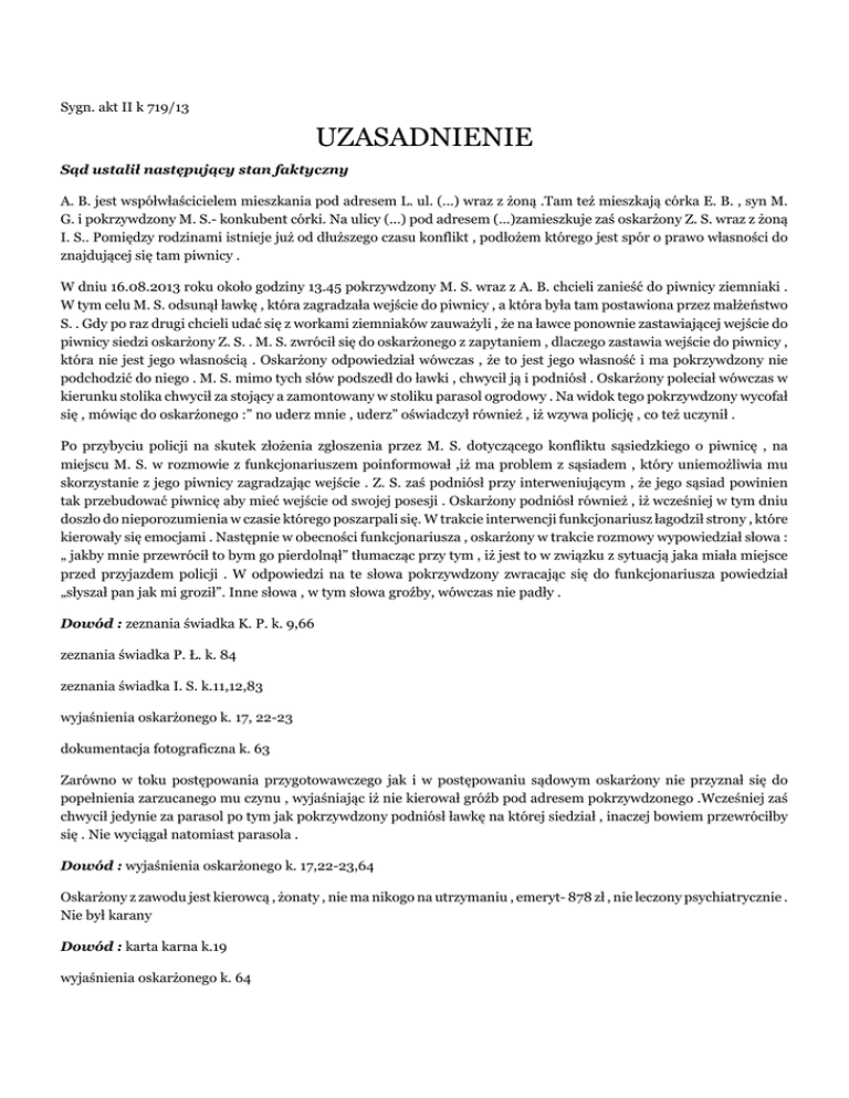 Sygn. akt II k 719/13 UZASADNIENIE Sąd ustalił następujący stan faktyczny A. B. jest współwłaścicielem mieszkania pod adresem L. ul. (...) wraz z żoną .Tam też mieszkają córka E. B. , syn M. G. i pokrzywdzony M. S.- konkubent córki. Na ulicy (...) pod adresem (...)zamieszkuje zaś oskarżony Z. S. wraz z żoną I. S.. Pomiędzy rodzinami istnieje już od dłuższego czasu konflikt , podłożem którego jest spór o prawo własności do znajdującej się tam piwnicy . W dniu 16.08.2013 roku około godziny 13.45 pokrzywdzony M. S. wraz z A. B. chcieli zanieść do piwnicy ziemniaki . W tym celu M. S. odsunął ławkę , która zagradzała wejście do piwnicy , a która była tam postawiona przez małżeństwo S. . Gdy po raz drugi chcieli udać się z workami ziemniaków zauważyli , że na ławce ponownie zastawiającej wejście do piwnicy siedzi oskarżony Z. S. . M. S. zwrócił się do oskarżonego z zapytaniem , dlaczego zastawia wejście do piwnicy , która nie jest jego własnością . Oskarżony odpowiedział wówczas , że to jest jego własność i ma pokrzywdzony nie podchodzić do niego . M. S. mimo tych słów podszedł do ławki , chwycił ją i podniósł . Oskarżony poleciał wówczas w kierunku stolika chwycił za stojący a zamontowany w stoliku parasol ogrodowy . Na widok tego pokrzywdzony wycofał się , mówiąc do oskarżonego :” no uderz mnie , uderz” oświadczył również , iż wzywa policję , co też uczynił . Po przybyciu policji na skutek złożenia zgłoszenia przez M. S. dotyczącego konfliktu sąsiedzkiego o piwnicę , na miejscu M. S. w rozmowie z funkcjonariuszem poinformował ,iż ma problem z sąsiadem , który uniemożliwia mu skorzystanie z jego piwnicy zagradzając wejście . Z. S. zaś podniósł przy interweniującym , że jego sąsiad powinien tak przebudować piwnicę aby mieć wejście od swojej posesji . Oskarżony podniósł również , iż wcześniej w tym dniu doszło do nieporozumienia w czasie którego poszarpali się. W trakcie interwencji funkcjonariusz łagodził strony , które kierowały się emocjami . Następnie w obecności funkcjonariusza , oskarżony w trakcie rozmowy wypowiedział słowa : „ jakby mnie przewrócił to bym go pierdolnął” tłumacząc przy tym , iż jest to w związku z sytuacją jaka miała miejsce przed przyjazdem policji . W odpowiedzi na te słowa pokrzywdzony zwracając się do funkcjonariusza powiedział „słyszał pan jak mi groził”. Inne słowa , w tym słowa groźby, wówczas nie padły . Dowód : zeznania świadka K. P. k. 9,66 zeznania świadka P. Ł. k. 84 zeznania świadka I. S. k.11,12,83 wyjaśnienia oskarżonego k. 17, 22-23 dokumentacja fotograficzna k. 63 Zarówno w toku postępowania przygotowawczego jak i w postępowaniu sądowym oskarżony nie przyznał się do popełnienia zarzucanego mu czynu , wyjaśniając iż nie kierował gróźb pod adresem pokrzywdzonego .Wcześniej zaś chwycił jedynie za parasol po tym jak pokrzywdzony podniósł ławkę na której siedział , inaczej bowiem przewróciłby się . Nie wyciągał natomiast parasola . Dowód : wyjaśnienia oskarżonego k. 17,22-23,64 Oskarżony z zawodu jest kierowcą , żonaty , nie ma nikogo na utrzymaniu , emeryt- 878 zł , nie leczony psychiatrycznie . Nie był karany Dowód : karta karna k.19 wyjaśnienia oskarżonego k. 64 Sąd zważył co następuje Materiał dowodowy zebrany w sprawie oraz jego analiza prowadzą do uwolnienia oskarżonego od stawianego mu zarzutu gróźb karalnych . Ustalenia w sprawie Sąd poczynił w oparciu o zeznania K. P. , P. Ł. , wyjaśnienia oskarżonego oraz relację świadka I. S. . Tym samym w istotnych kwestiach odmówił waloru wiarygodności relacji pokrzywdzonego M. S. oraz A. B.. Posiłkował się również dokumentacją fotograficzną . Nie budzi wątpliwości , patrząc przez pryzmat całego zebranego materiału , iż pomiędzy stronami istnieje konflikt podłożem , którego pozostaje spór o piwnicę i na tym tle wciąż to dochodzi do nieporozumień -nie kwestionuje tego żadna ze stron . Tak też było w dniu 16.08.2013 roku . Z uwagi właśnie na trwający konflikt , ustalenia przede wszystkim sąd budował w oparciu o relację interweniujących funkcjonariuszy , w tym przede wszystkim K. P., słuchanego kilka dni po zdarzeniu - w obecności których ,według relacji pokrzywdzonego , miało dojść do wypowiedzenia słów objętych przedmiotem postępowania. I w oparciu o te zeznania organ orzekający dokonał weryfikacji prawdziwości relacji stron konfliktu . Jak wynika natomiast z relacji interweniujących , zgłoszenie M. S. dotyczyło jedynie konfliktu sąsiedzkiego o piwnicę, pokrzywdzony nie wspominał natomiast na etapie zgłaszania , o poprzedzającym rzekomo zdarzeniu z parasolem ogrodowym a o czym zeznał słuchany w charakterze świadka . Również później po przybyciu już na miejsce interweniujących rozmowa dotyczyła jedynie kwestii zastawiania wejścia do piwnicy . Sam oskarżony natomiast wskazał , iż doszło między nimi do „szarpaniny” . Rozmowy o parasolu ogrodowym nie przypomina sobie również drugi z interweniujących P. Ł. . Jak podniósł dalej funkcjonariusz P. , w czasie jego obecności z ust oskarżonego jedynie padły słowa o treści : „ jakby mnie przewrócił to bym go pierdolnął” i przy tych słowach oskarżony jednocześnie miał nawiązać do sytuacji jaka miała miejsce przed ich przyjazdem . W odpowiedzi zaś właśnie na te słowa pokrzywdzony zwrócił się do funkcjonariusza słowami „słyszał pan jak mi groził ”. Funkcjonariusz nie słyszał natomiast – wbrew twierdzeniom pokrzywdzonego – żadnych gróźb o jakich zeznał M. S. . Następujące po sobie wypowiedzi oskarżonego i pokrzywdzonego niewątpliwie świadczą, iż zawiadomienie dotyczy tej właśnie wypowiedzi. Również P. Ł. , tej treści wypowiedzi na jaką wskazuje pokrzywdzony nie przypomina sobie . Relacje wiarygodnych w ocenie